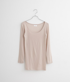 素肌に触れる内側がシルク、外側がコットンになるように編み立てた八分袖のインナーです。内側のシルク糸には、最高級の正絹を使用。外側のコットンには、正絹と相性のよい極細の糸を使いました。糸と糸の間に空気を含み、軽いのにとってもあたたか。ふんわりとしたガーゼのような心地よさを実現しました。脇接ぎのないリブ編みなので、天然繊維でも伸びがよく、身体をしめつけません。ヒップが隠れるくらいの着丈で、腹巻いらずのあたたかさ。薄手なのでボトムに裾をインしてもごわつかず、すっきりと着ることができます。
