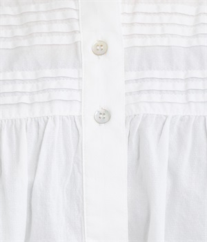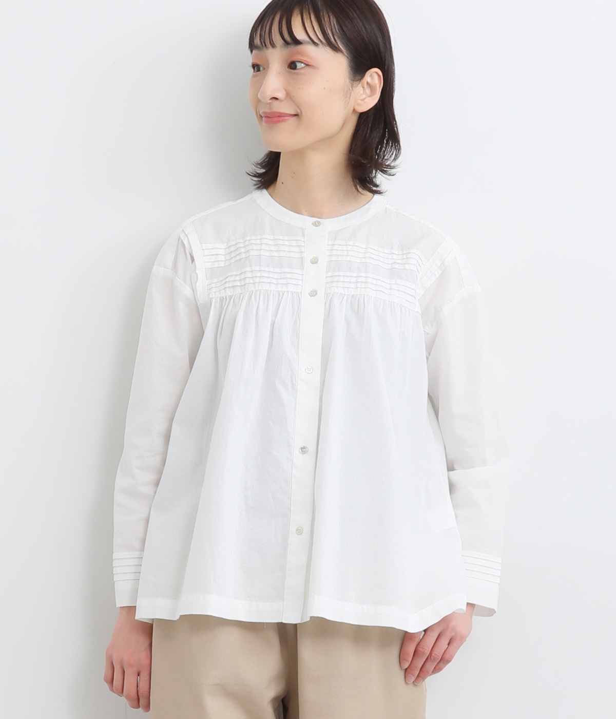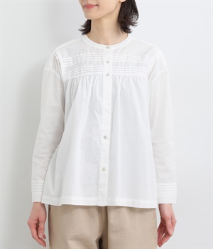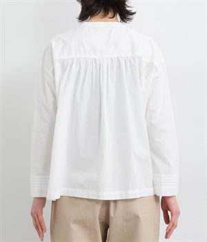 ヨーク切り替えに立体感のあるタックとギャザーを施し、顔まわりが華やかな印象になるバンドカラーシャツです。コーディネートしやすい着丈にゆるめの身幅とタックを入れた袖口のディテールが特徴。デイリースタイルをちょっぴり品よく仕上げてくれます。