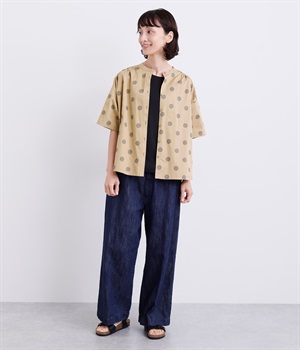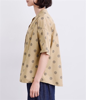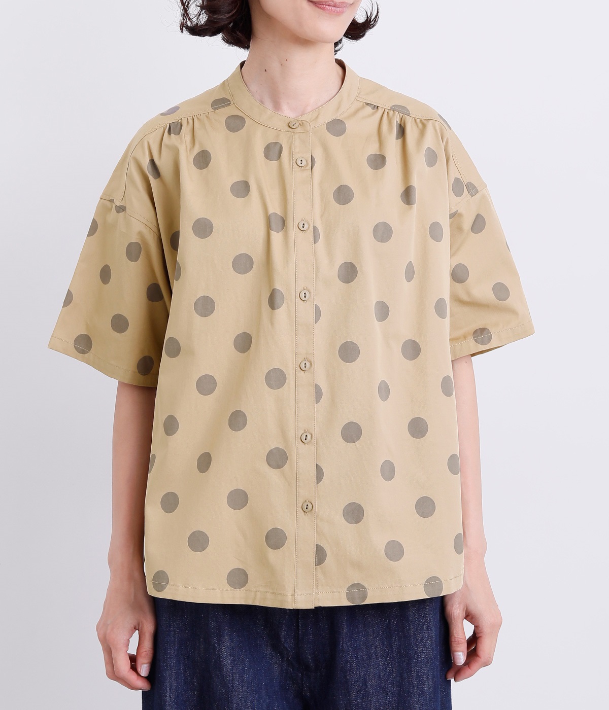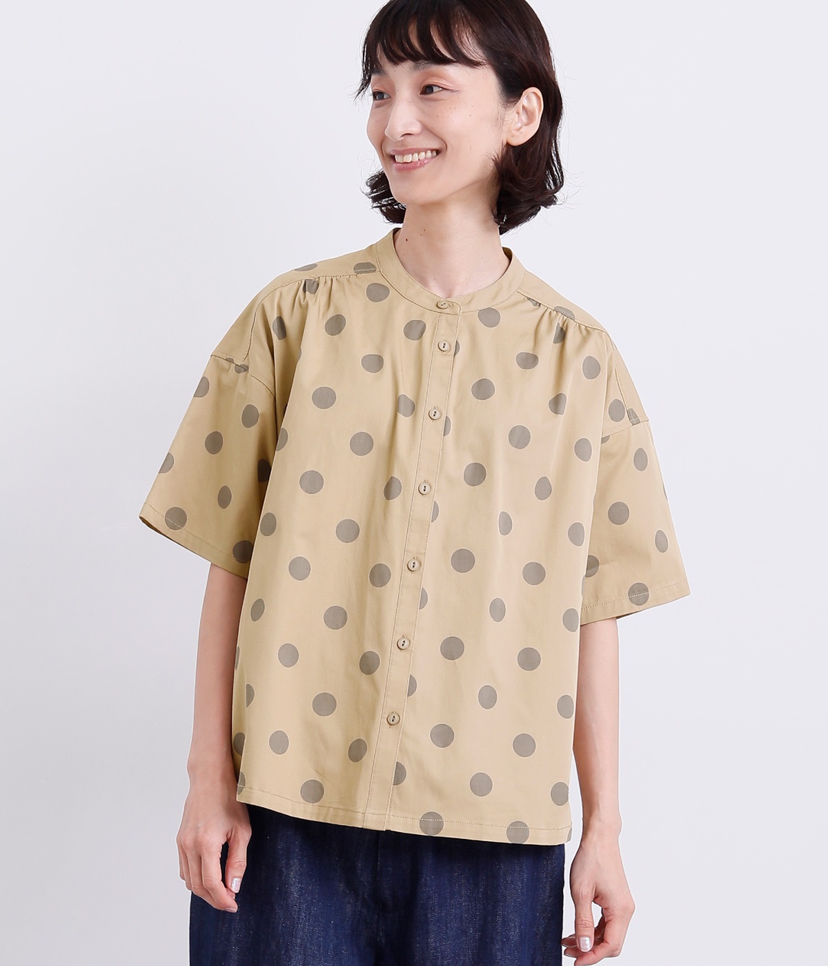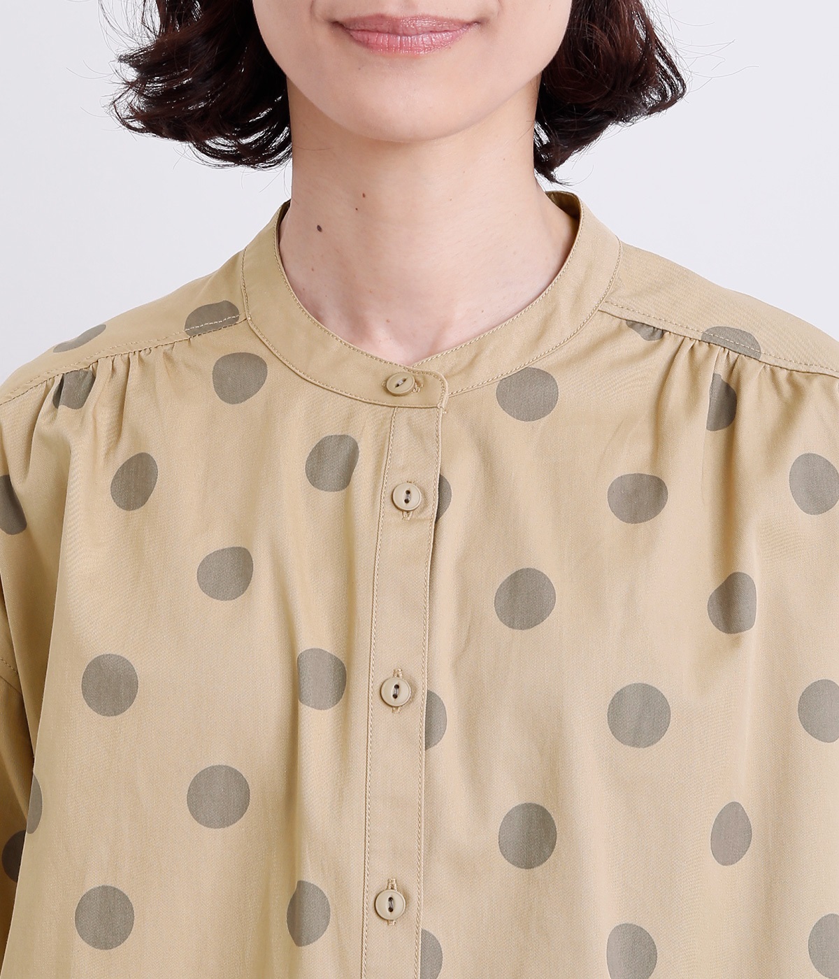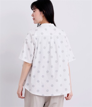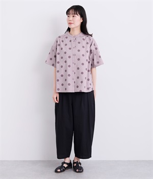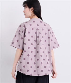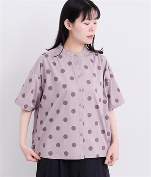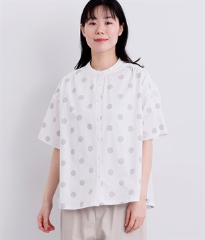 配色のドットプリントがアイキャッチになるシャツです。肩ギャザーで可愛らしさを足しつつ、無地の前立てやバンドカラーですっきりまとめました。裾のワンポイントはプリントではなく刺しゅうで特別感アップ。