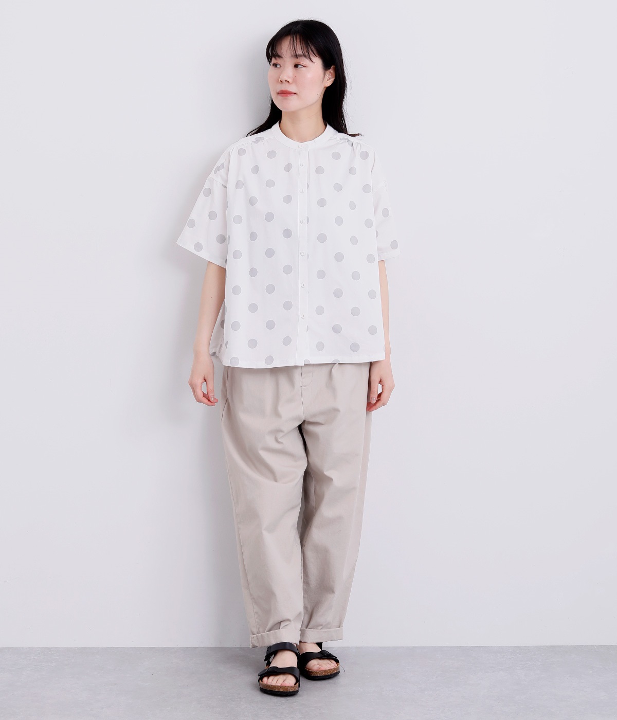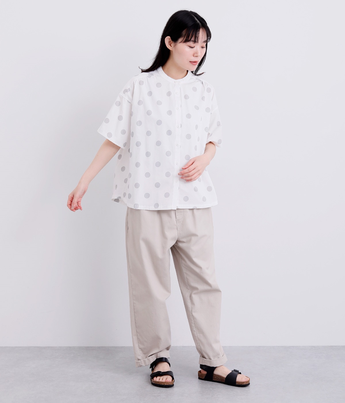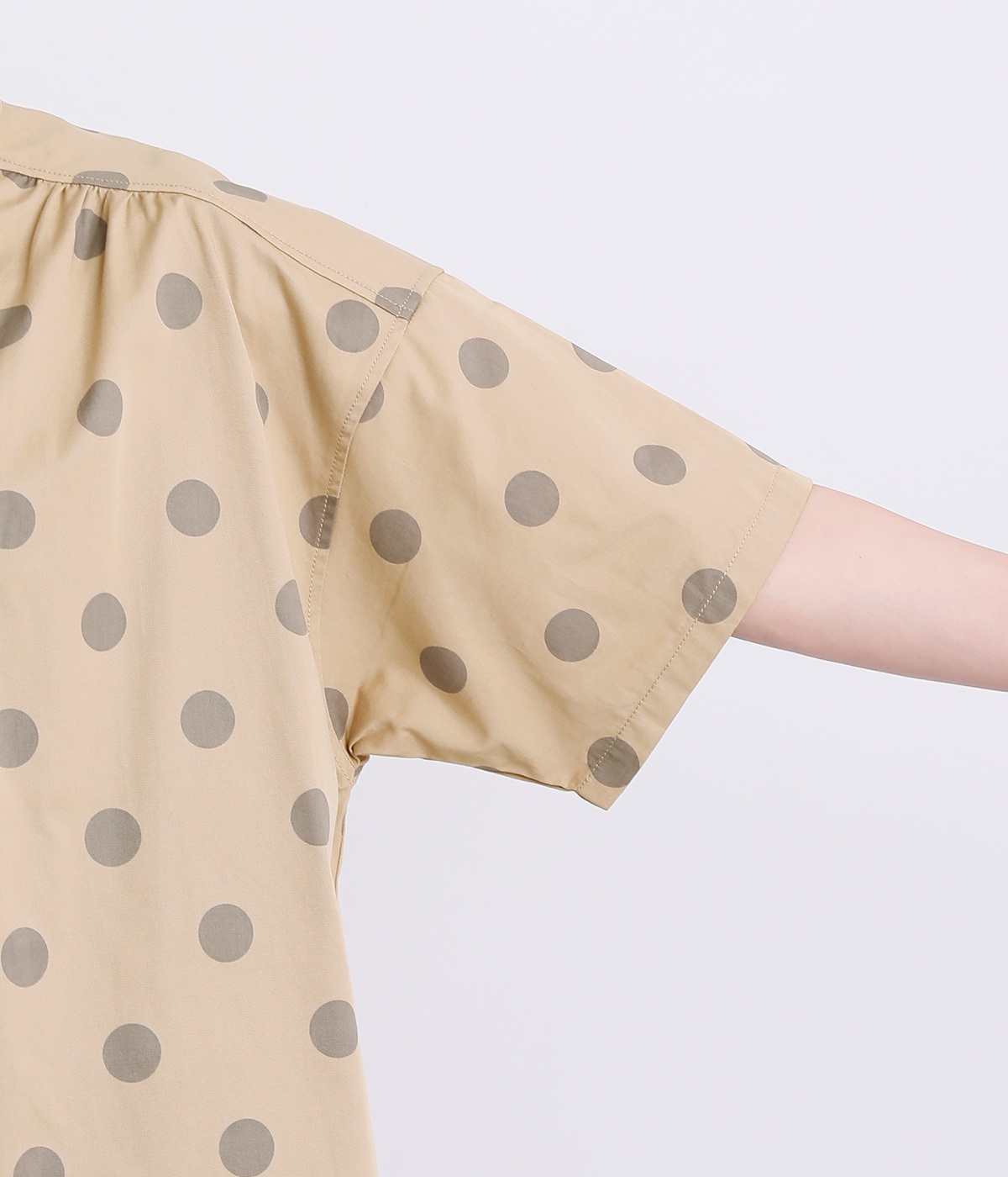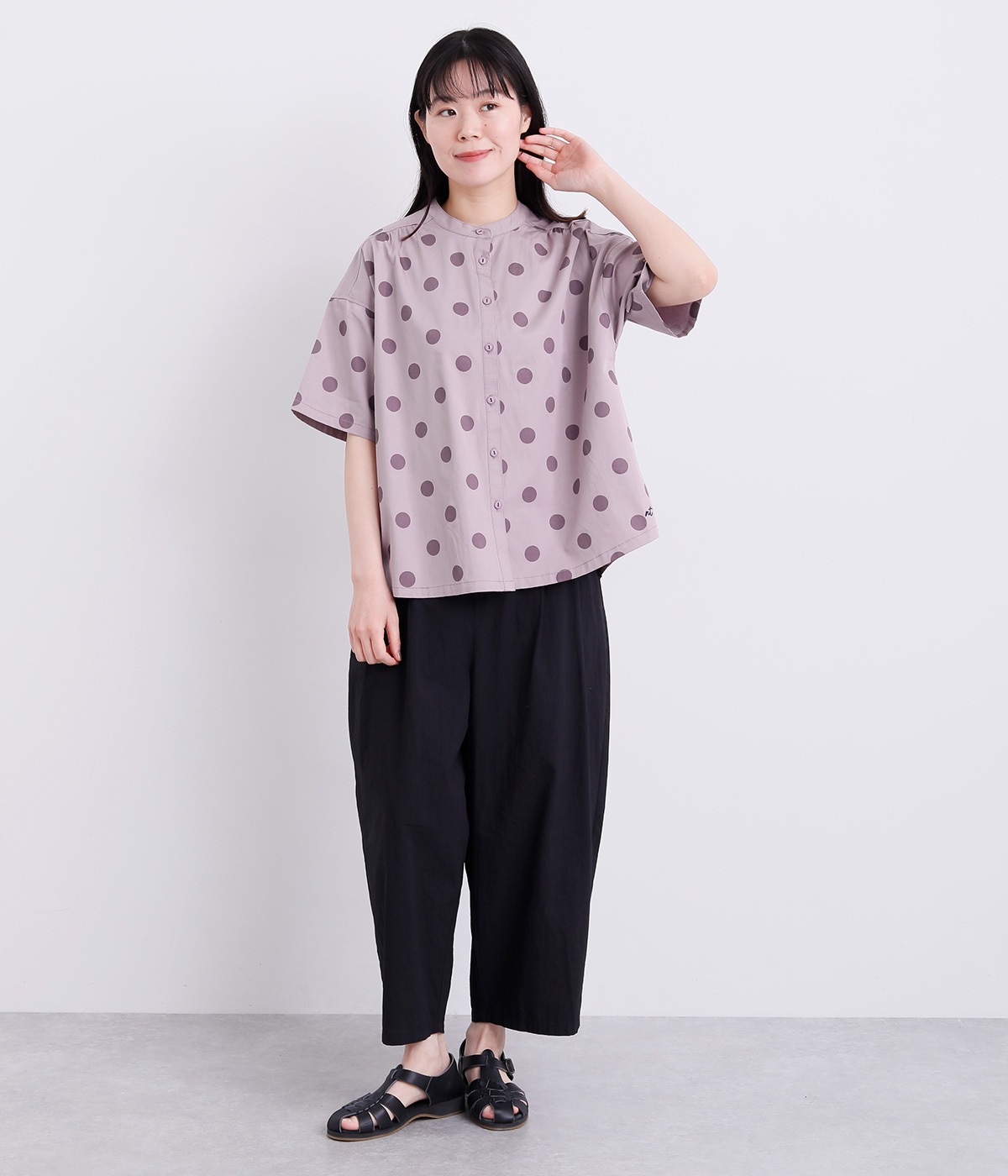 配色のドットプリントがアイキャッチになるシャツです。肩ギャザーで可愛らしさを足しつつ、無地の前立てやバンドカラーですっきりまとめました。裾のワンポイントはプリントではなく刺しゅうで特別感アップ。