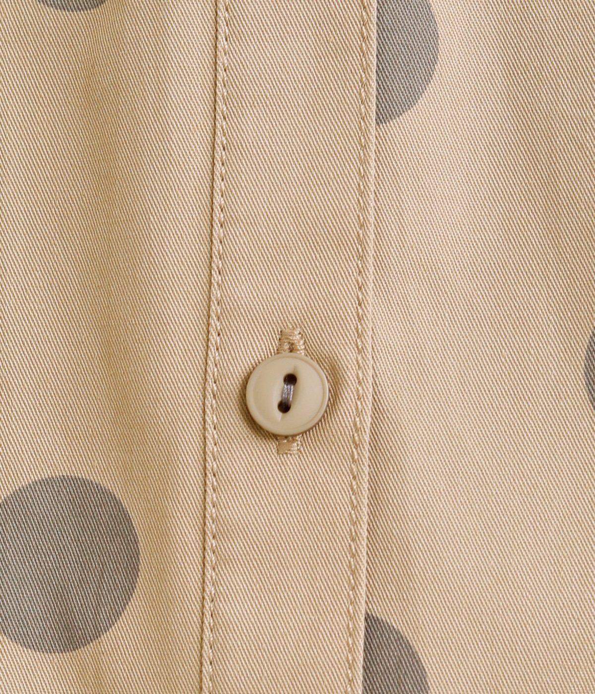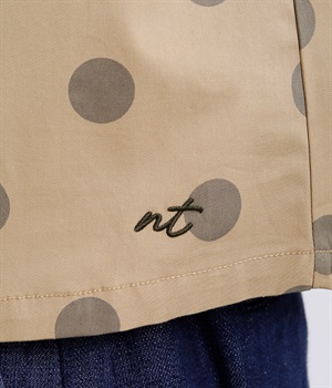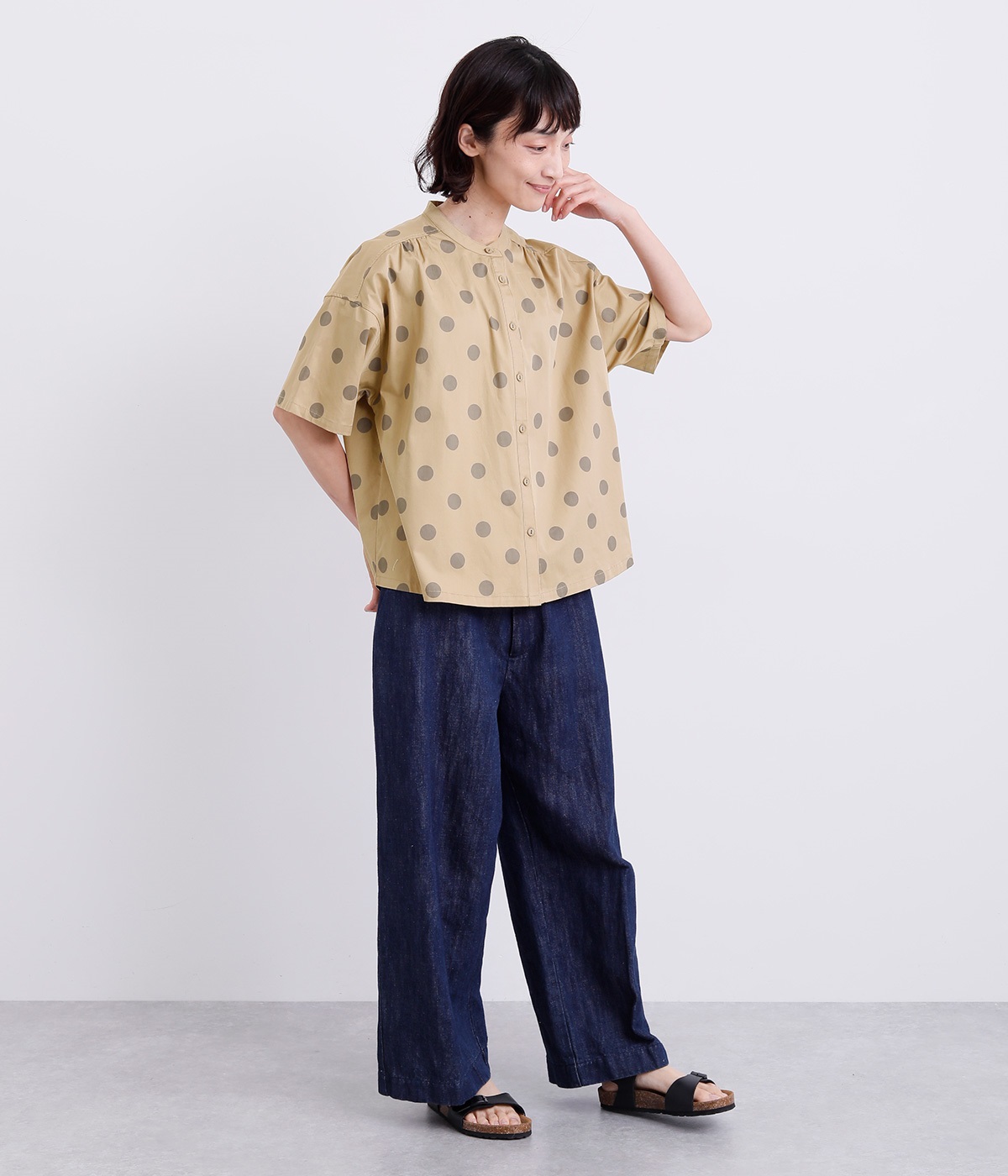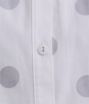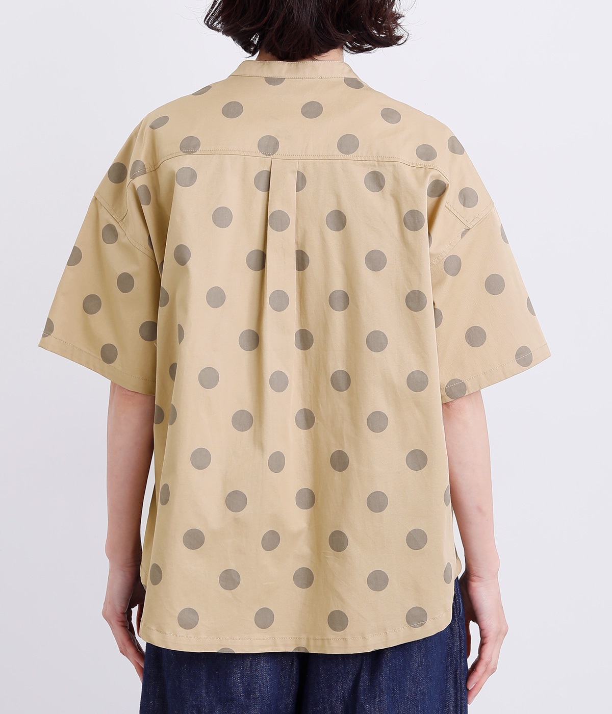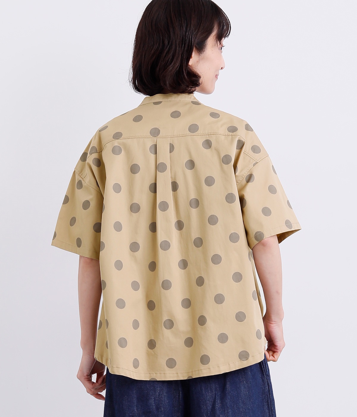 配色のドットプリントがアイキャッチになるシャツです。肩ギャザーで可愛らしさを足しつつ、無地の前立てやバンドカラーですっきりまとめました。裾のワンポイントはプリントではなく刺しゅうで特別感アップ。