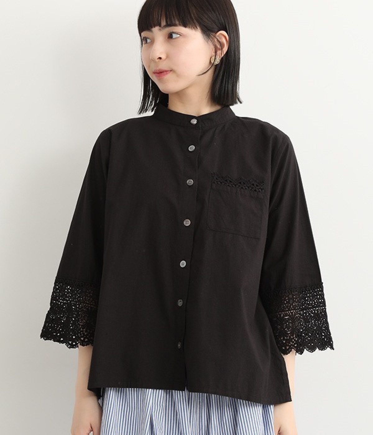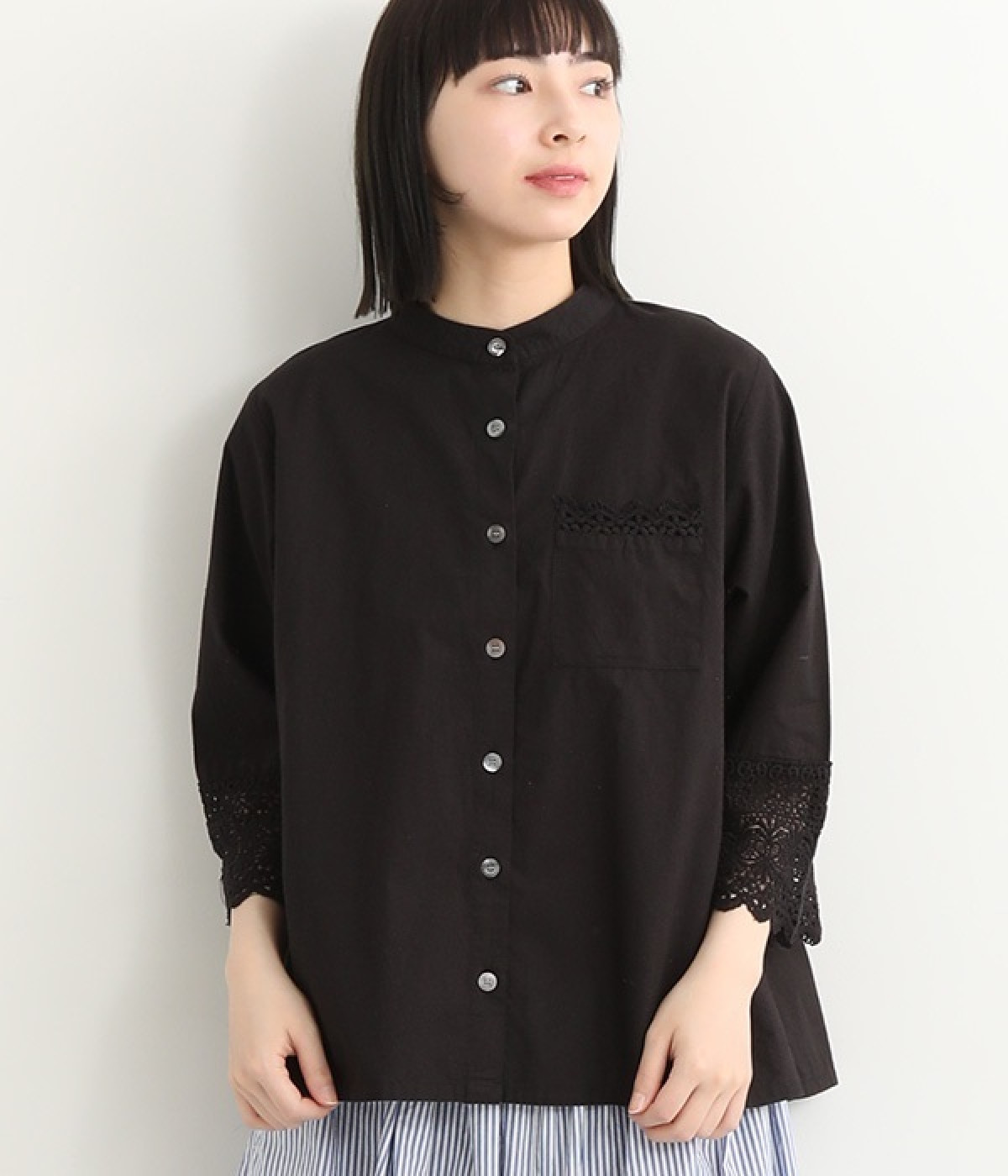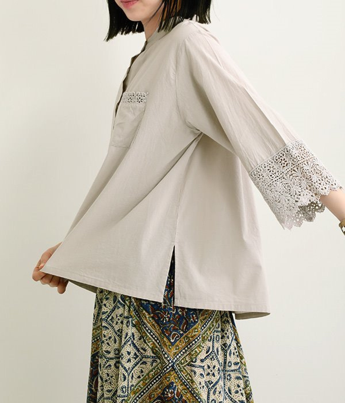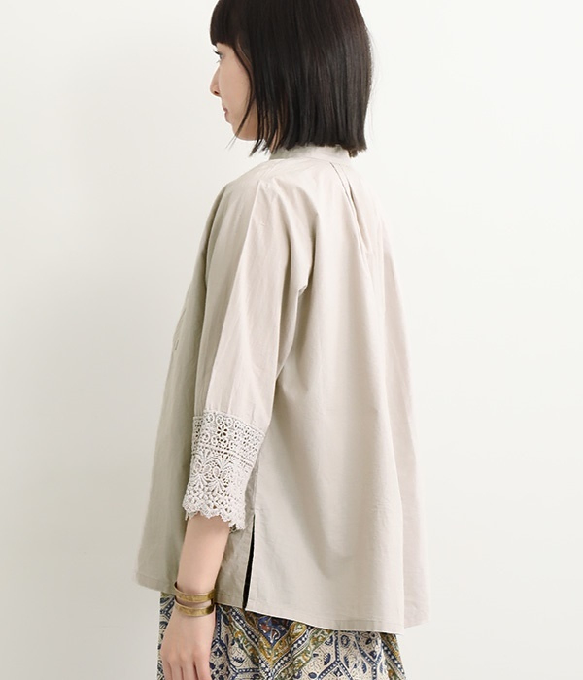 袖口とポケット口にレースが施され華やかなイメージに仕上がったブラウスです。襟をスタンドカラーにすることで甘すぎることなく着こなしやすいバランスになっています。ポケット口のレースは幅広レースを切り分けて使用することで袖口レースとモチーフがそれぞれ異なるこだわりポイント。裾はスリットが入っているのでボトムアウトもインもきれいにきまります。厚みのあるレースで華奢になりすぎずデイリーに着まわせます。