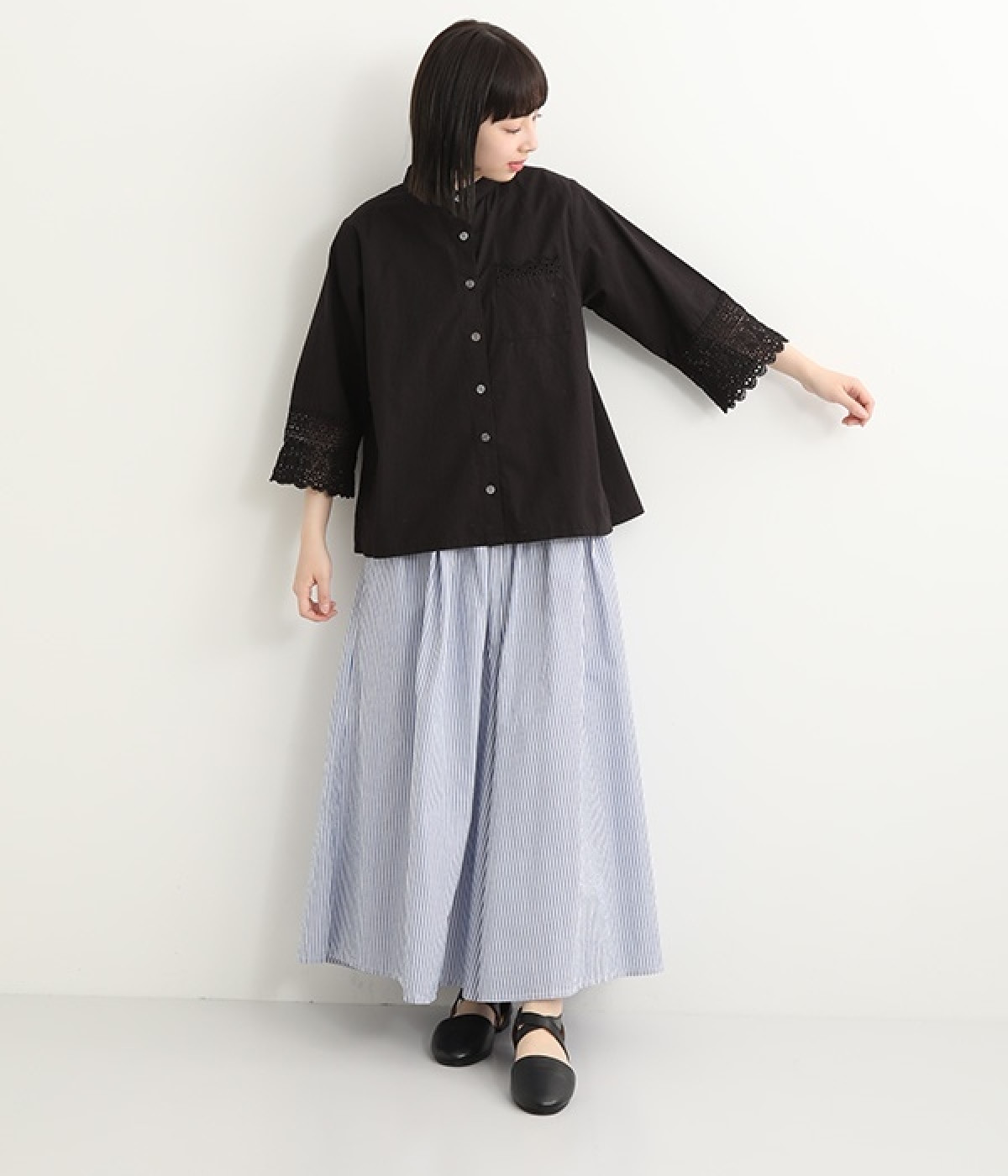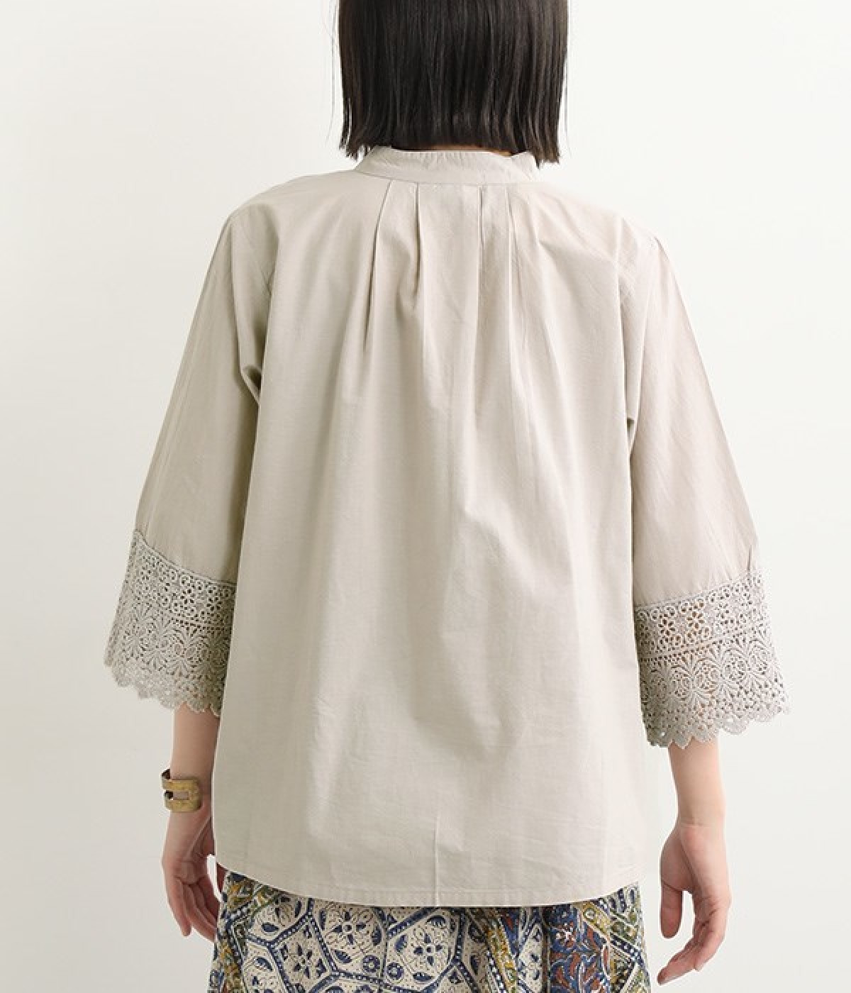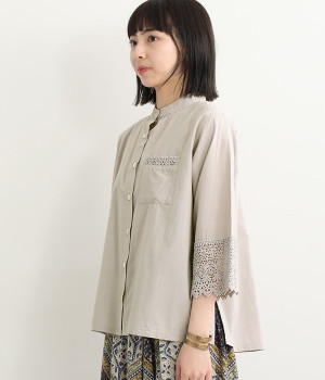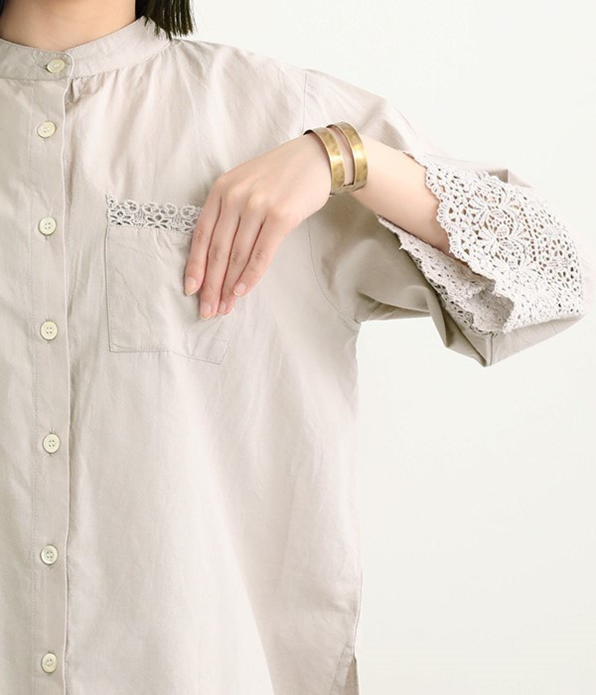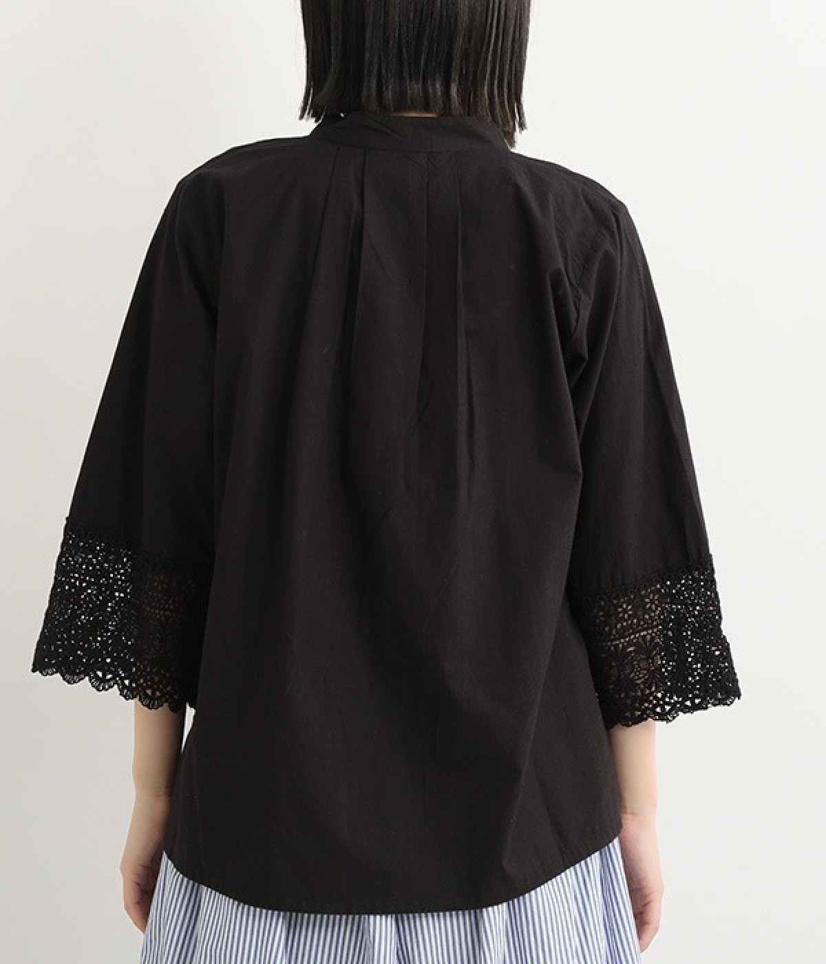 袖口とポケット口にレースが施され華やかなイメージに仕上がったブラウスです。襟をスタンドカラーにすることで甘すぎることなく着こなしやすいバランスになっています。ポケット口のレースは幅広レースを切り分けて使用することで袖口レースとモチーフがそれぞれ異なるこだわりポイント。裾はスリットが入っているのでボトムアウトもインもきれいにきまります。厚みのあるレースで華奢になりすぎずデイリーに着まわせます。