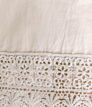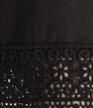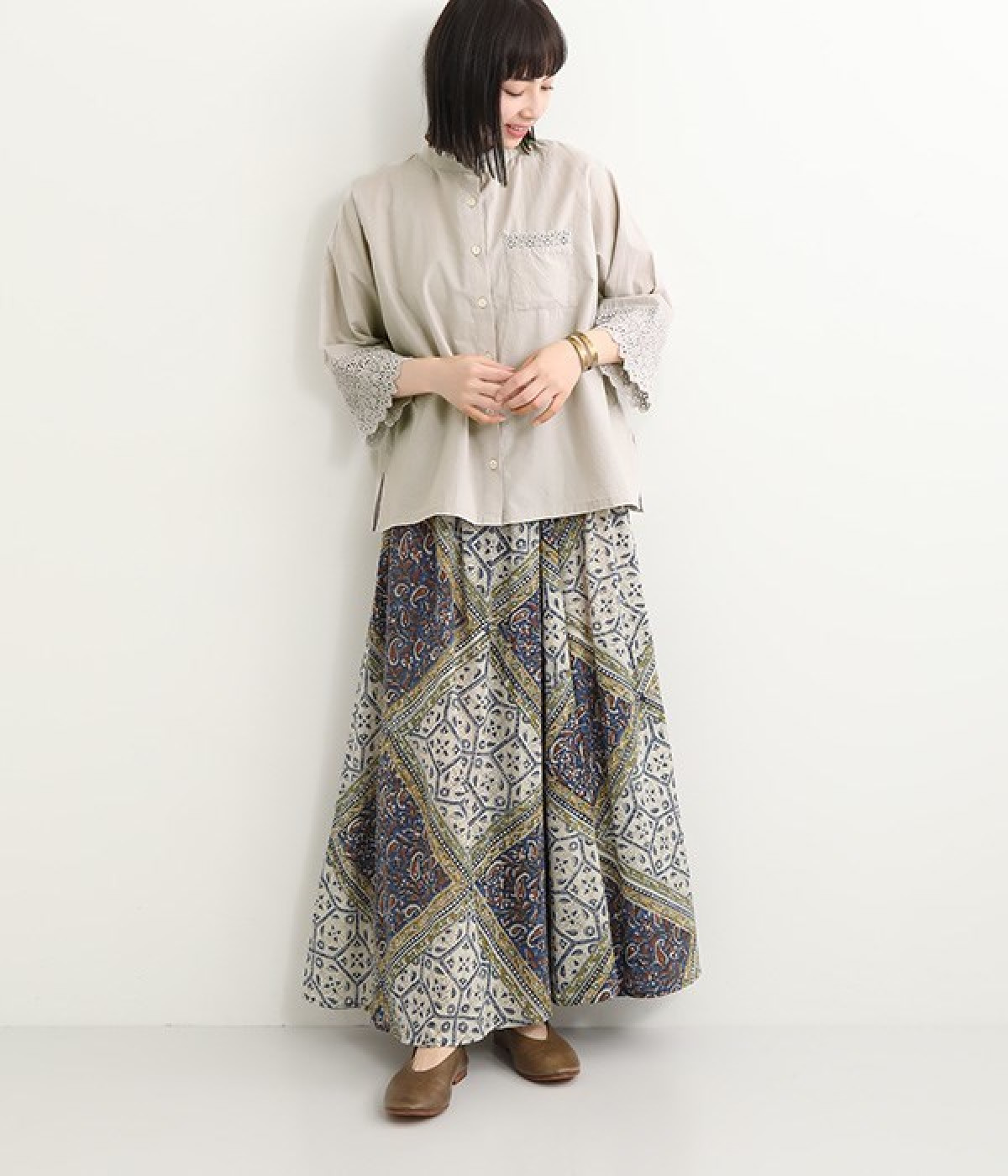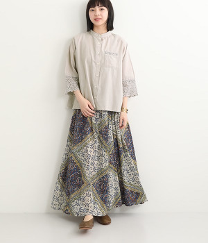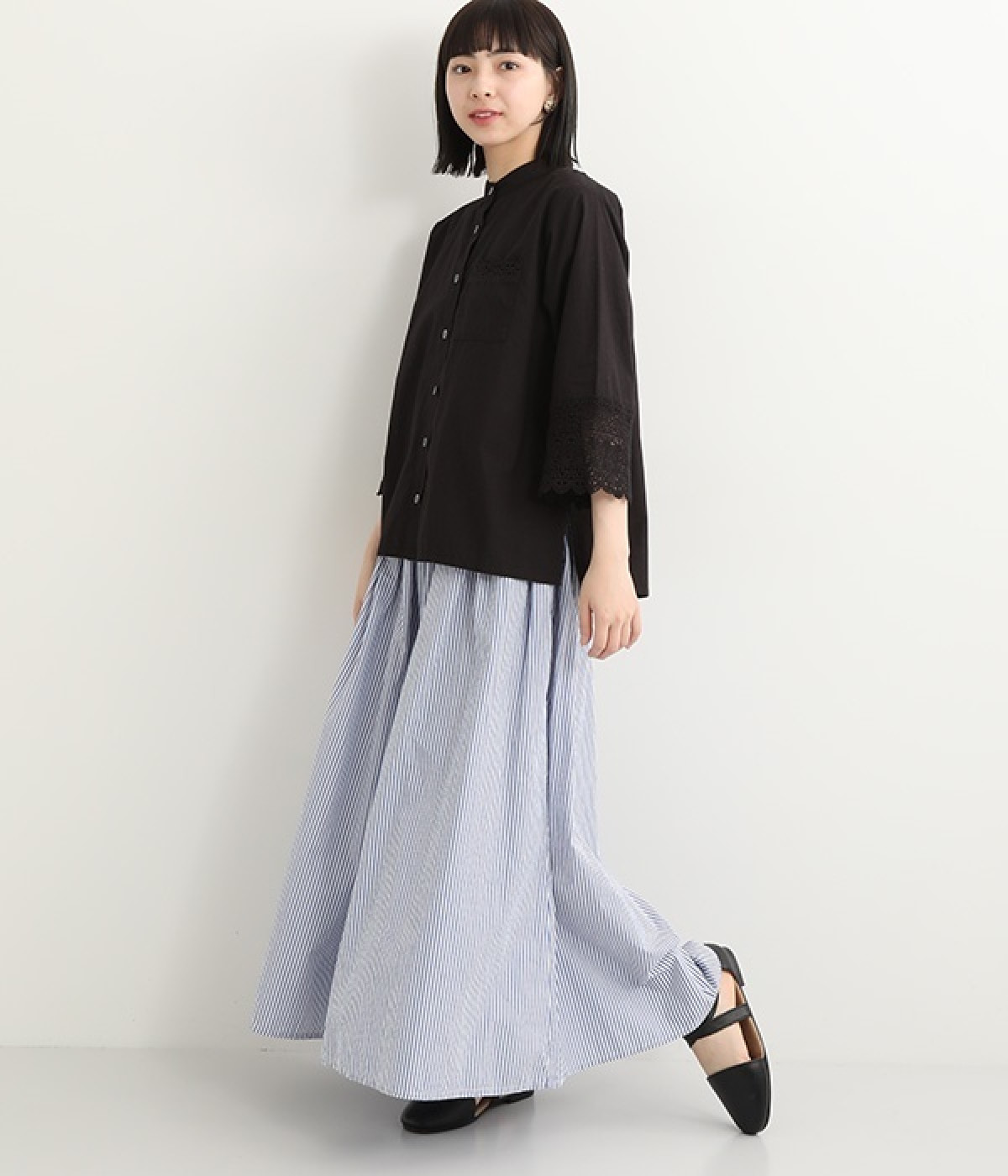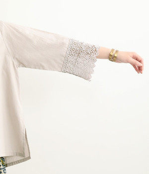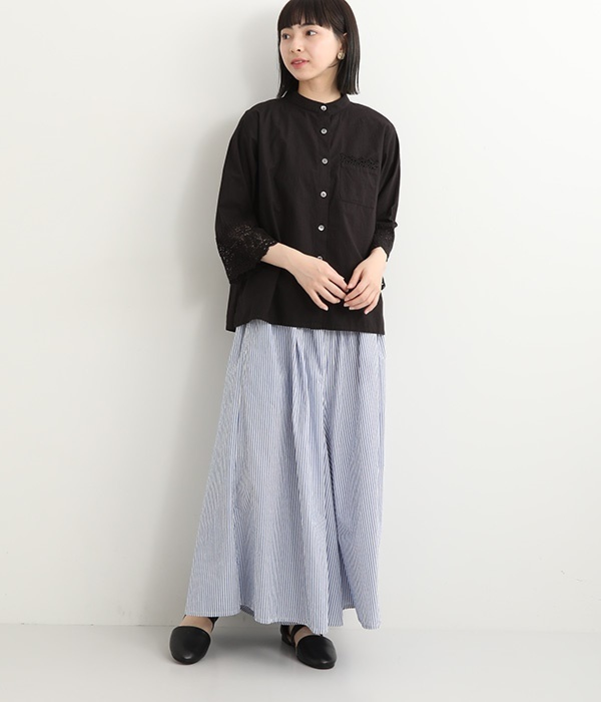 袖口とポケット口にレースが施され華やかなイメージに仕上がったブラウスです。襟をスタンドカラーにすることで甘すぎることなく着こなしやすいバランスになっています。ポケット口のレースは幅広レースを切り分けて使用することで袖口レースとモチーフがそれぞれ異なるこだわりポイント。裾はスリットが入っているのでボトムアウトもインもきれいにきまります。厚みのあるレースで華奢になりすぎずデイリーに着まわせます。