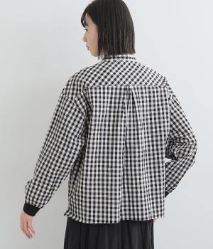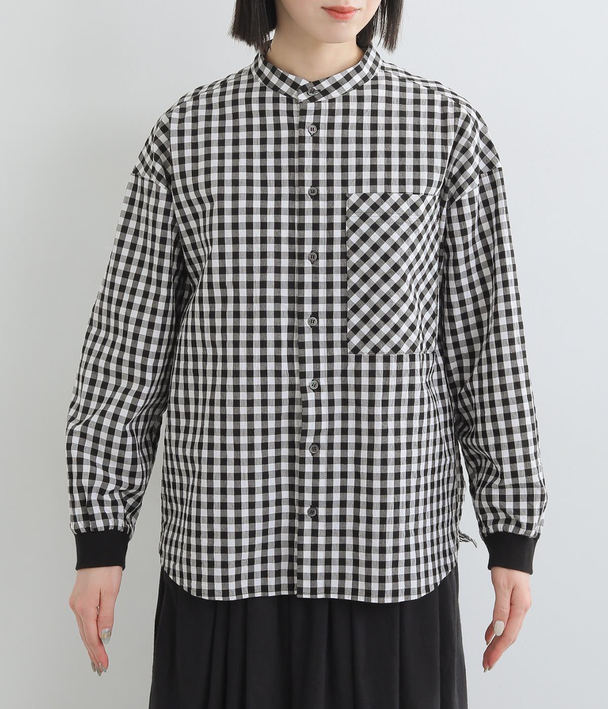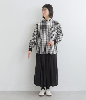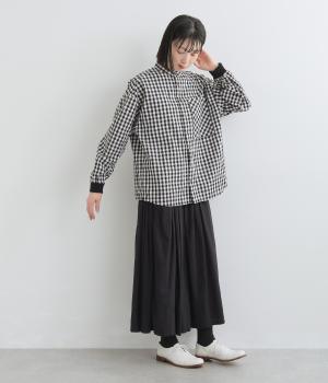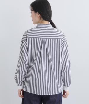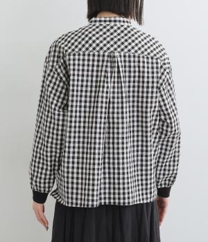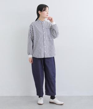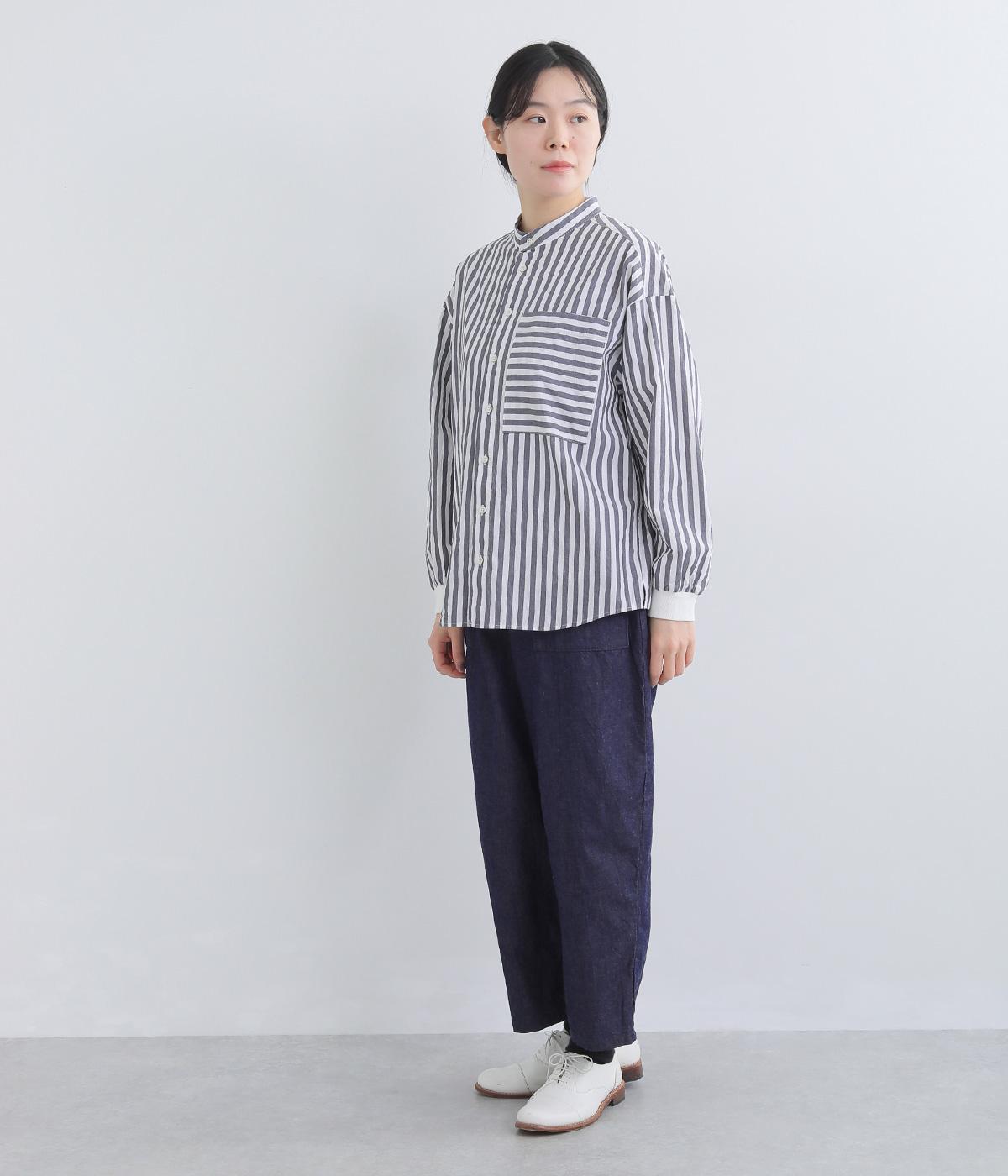洗いざらしのような風合いのノーカラーシャツ。大きな胸ポケットと袖口のリブがカジュアルさを添えます。背中のタックが後ろ姿もきれいに見せてくれます。