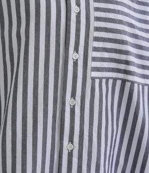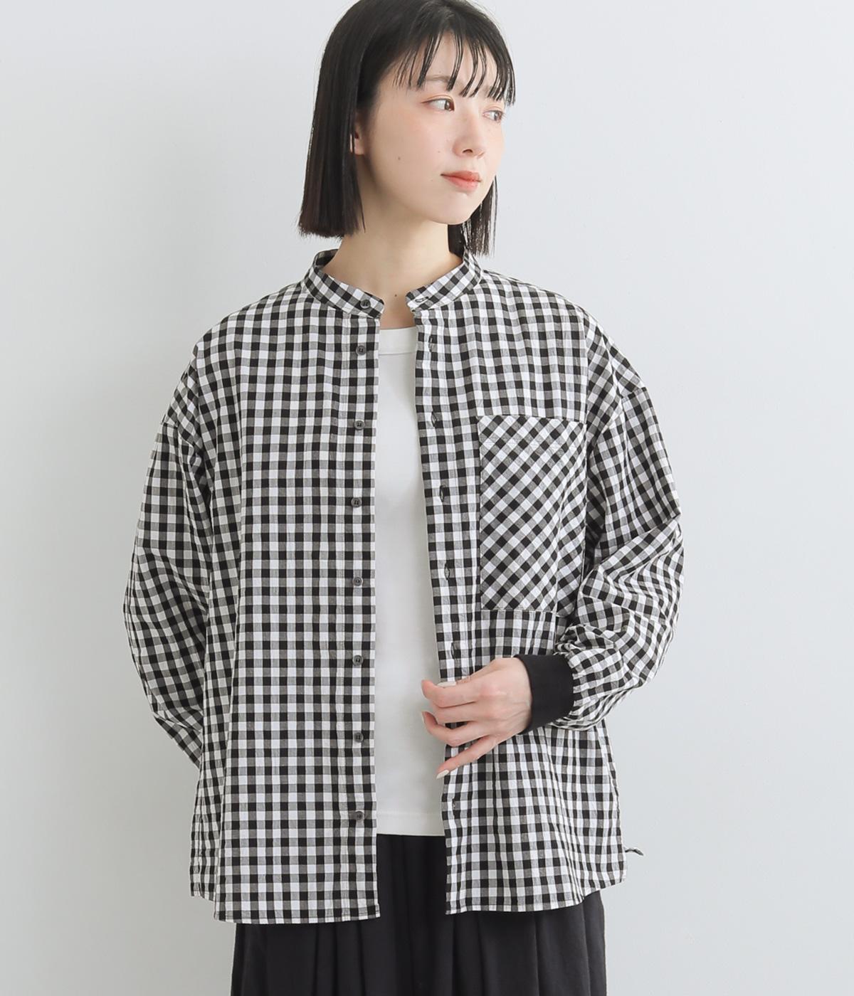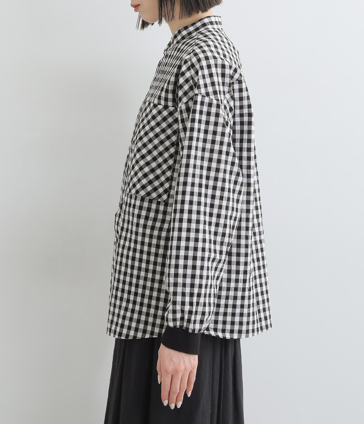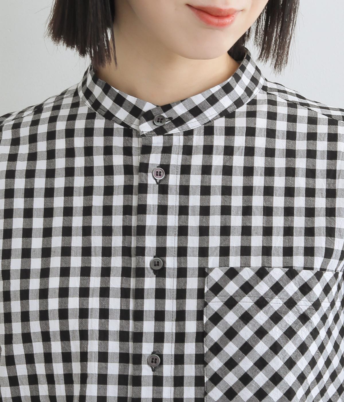 洗いざらしのような風合いのノーカラーシャツ。大きな胸ポケットと袖口のリブがカジュアルさを添えます。背中のタックが後ろ姿もきれいに見せてくれます。