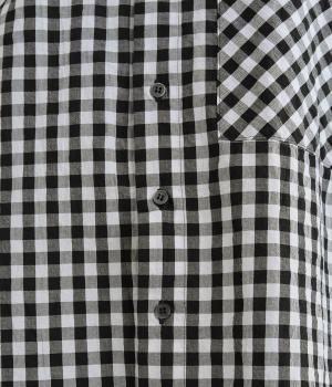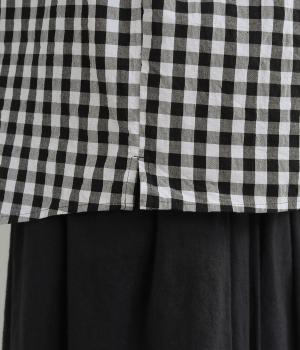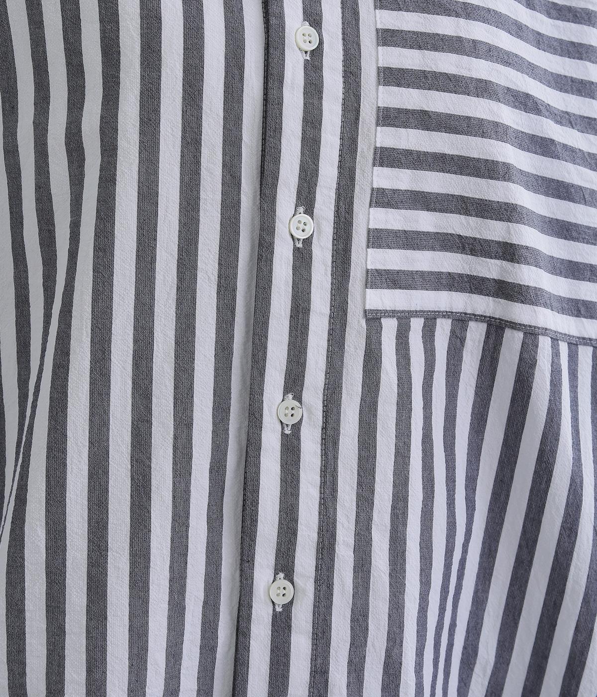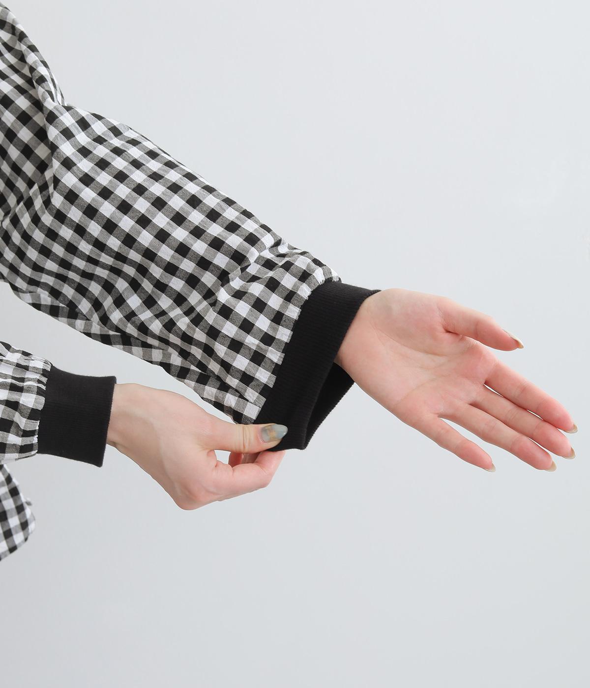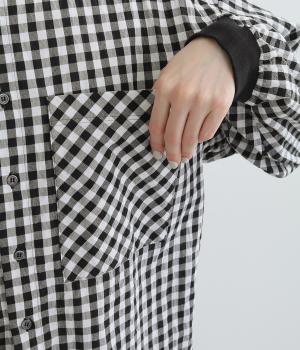 通気性の良いコットン素材のウェービーボイル生地を使用しています。さらっとしたシャリ感のある手ざわりで、涼しげな印象を与えてくれます。袖口には伸縮性のあるリブ編みをあしらいました。
