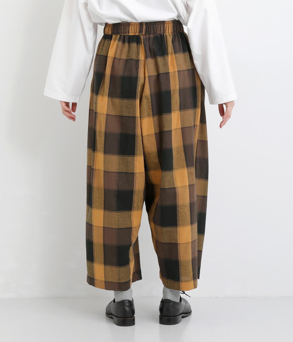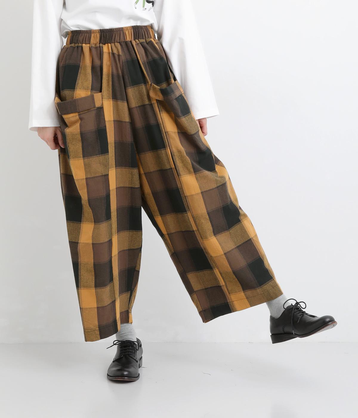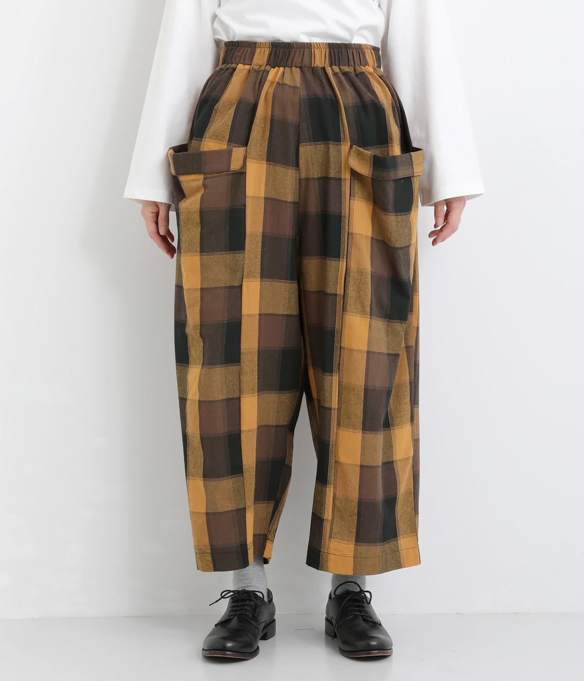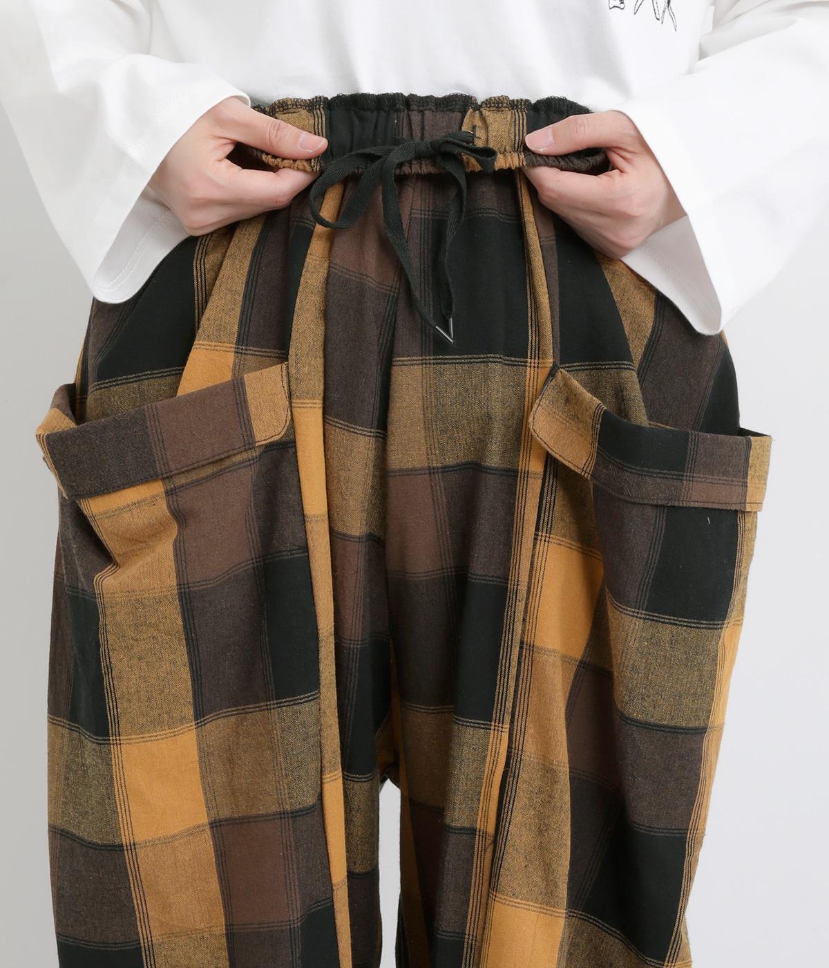 ニュアンスカラーのチェック柄が大人のカジュアルスタイルにぴったりなパンツです。立体感のある前ポケットがシルエットにアクセントを加えて、太ももまわりをカバー。ウエストは総ゴム仕様で紐でサイズ調節が可能です。