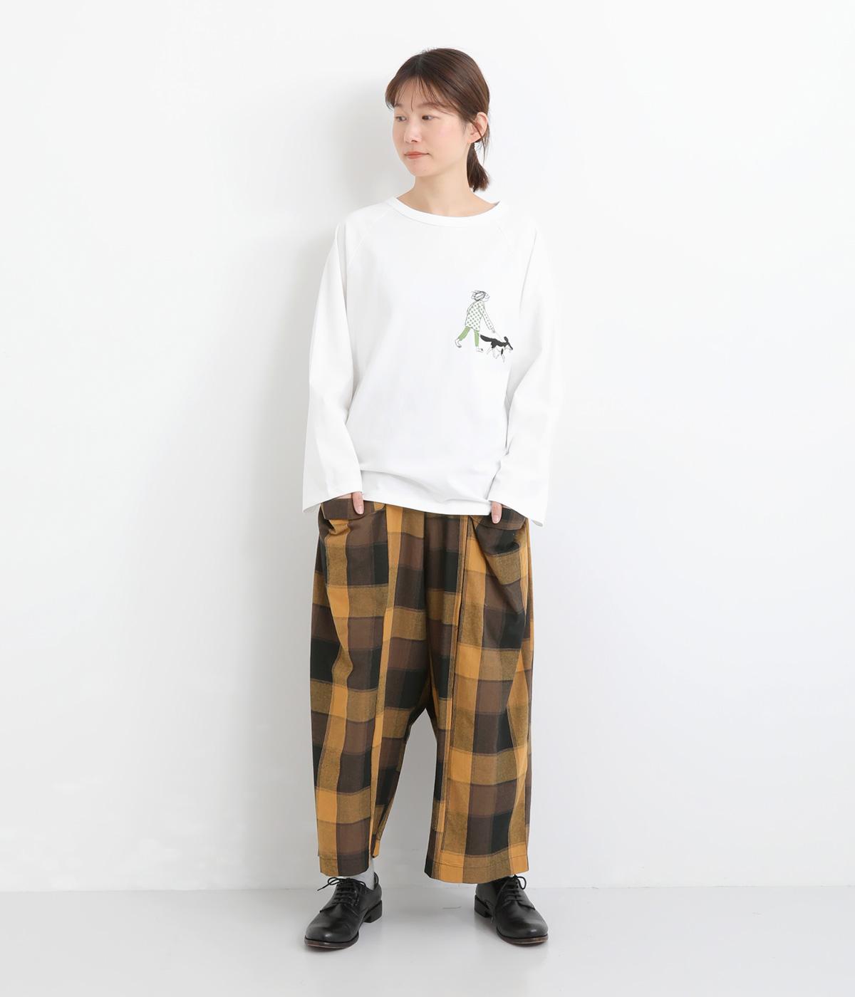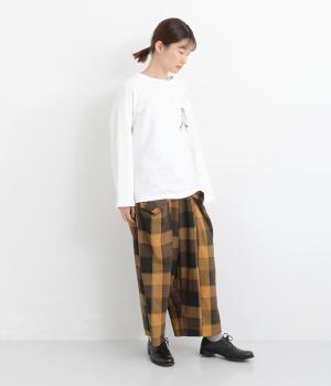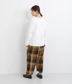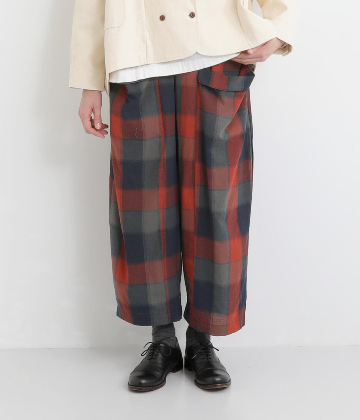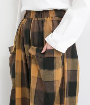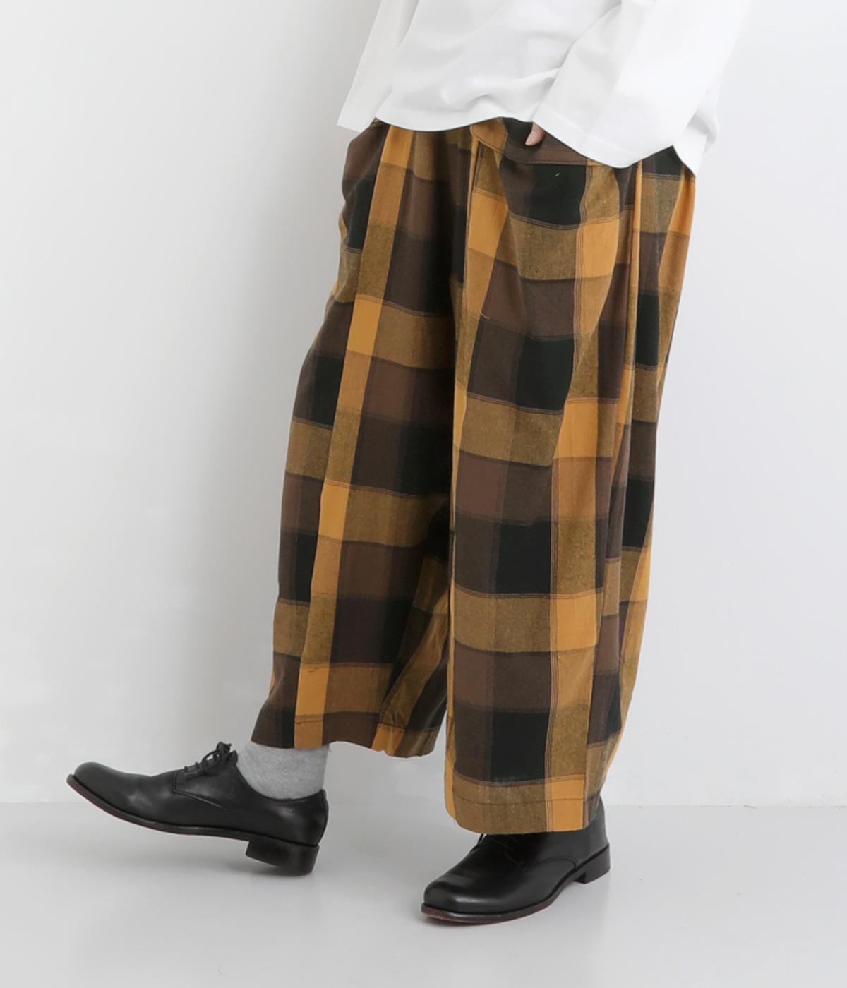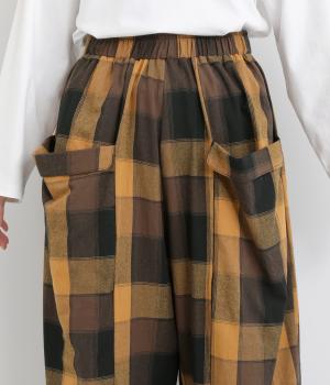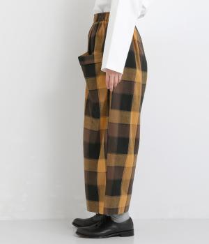 ニュアンスカラーのチェック柄が大人のカジュアルスタイルにぴったりなパンツです。立体感のある前ポケットがシルエットにアクセントを加えて、太ももまわりをカバー。ウエストは総ゴム仕様で紐でサイズ調節が可能です。