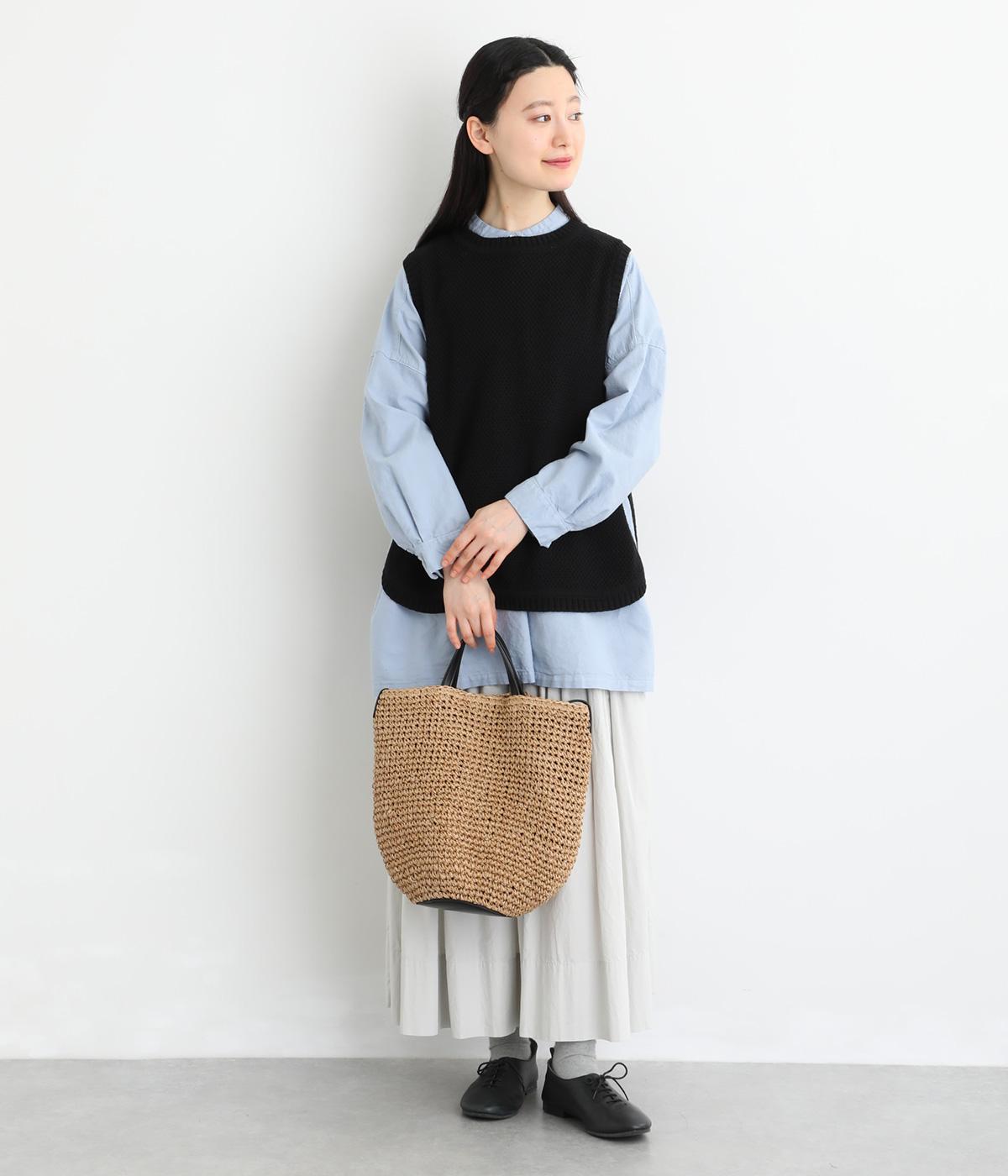ペーパー素材にポリエステル糸を組み合わせた、軽やかで表情のある編み地です。さらりとした手ざわりで、見た目にも涼やか。ほどよいハリがありながら、しなやかさもあるので、型崩れしにくいのも魅力です。