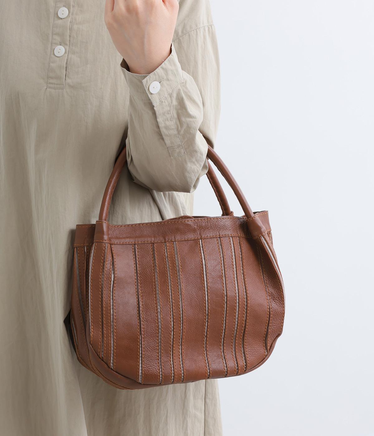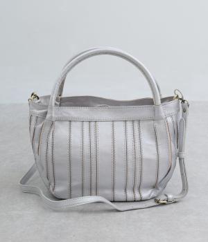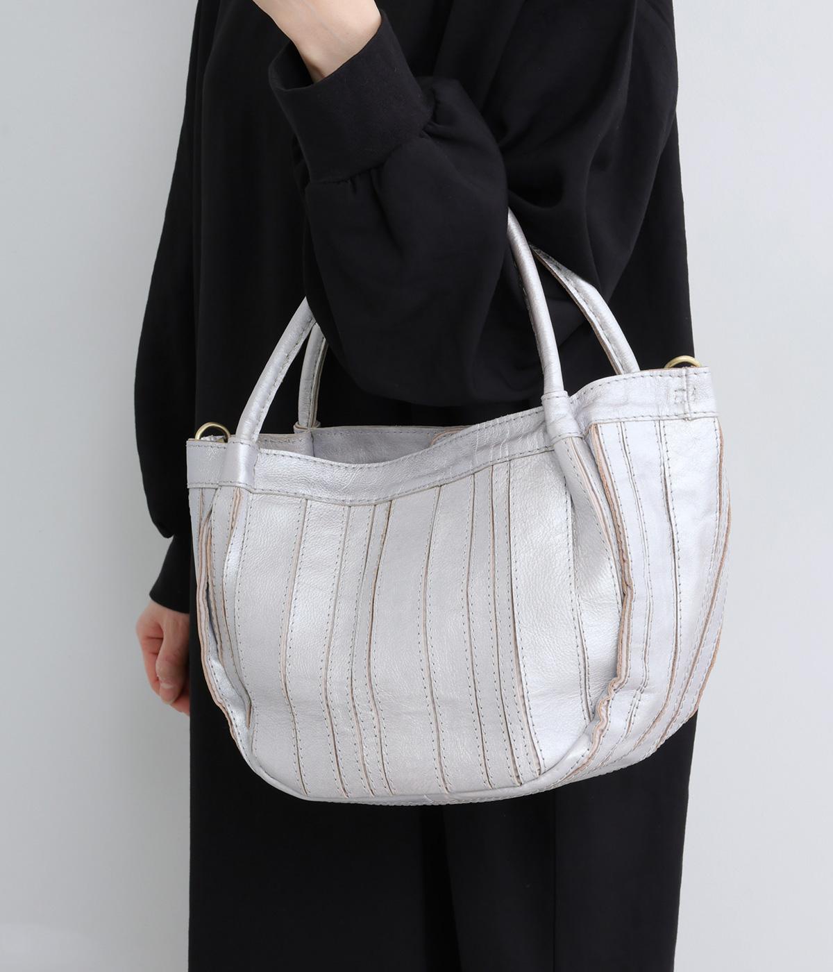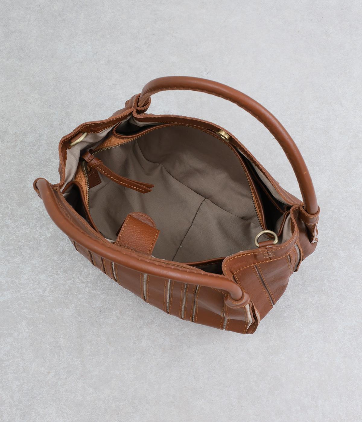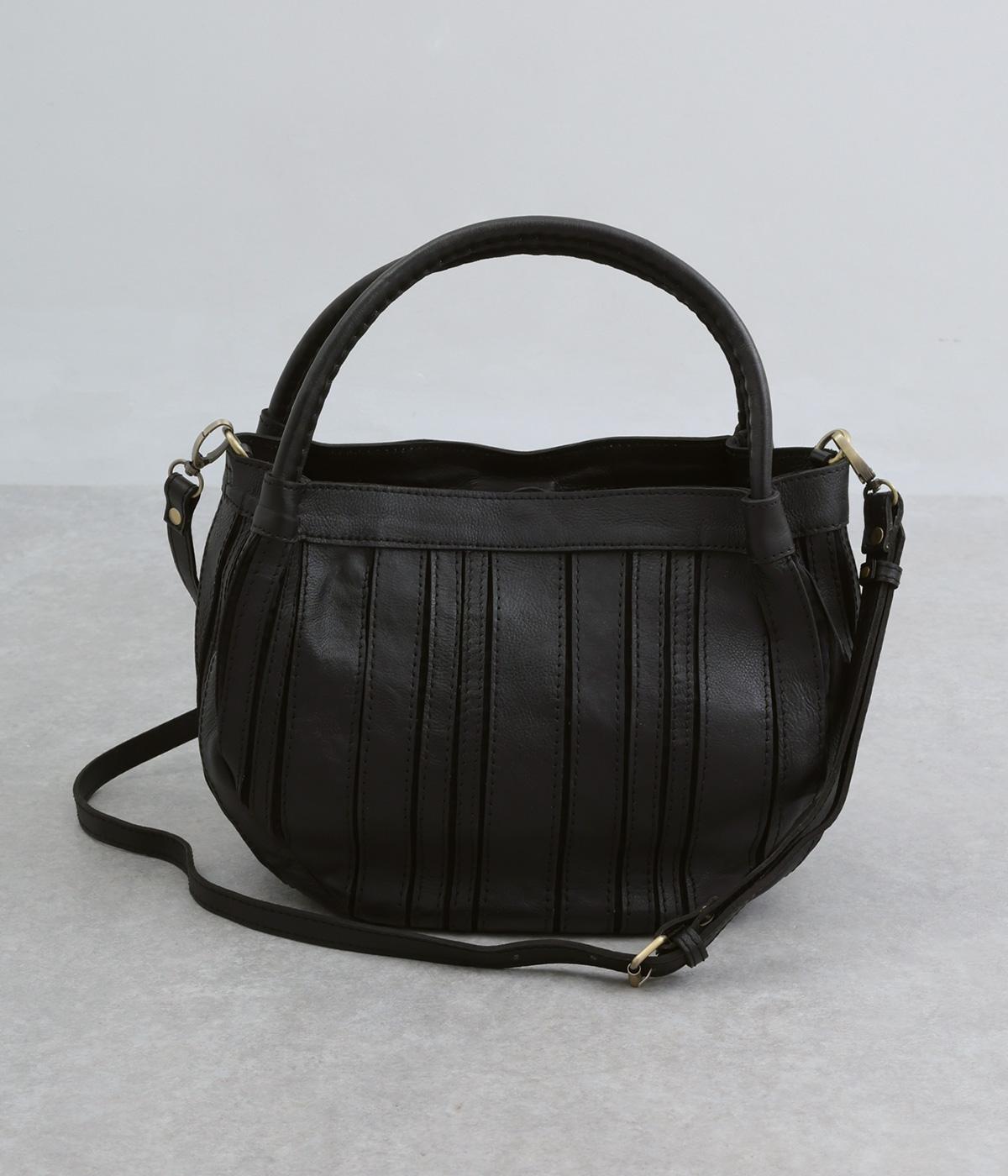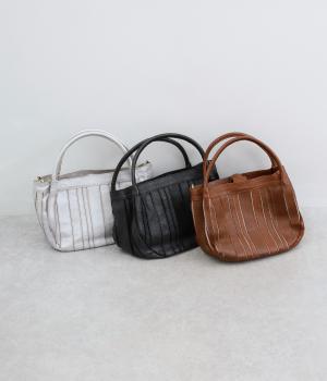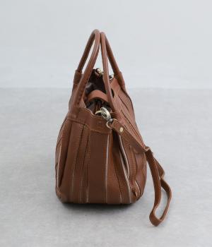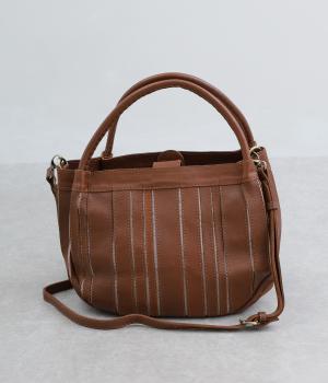ストライプ状に切り込みを入れたデザインが新鮮なレザーバッグ。丁度いいサイズ感で手提げとしても持ちやすく、付属のショルダーベルトでななめ掛けも◎。センターのファスナーポケットが仕切りにもなり物の整理がしやすい作りです。