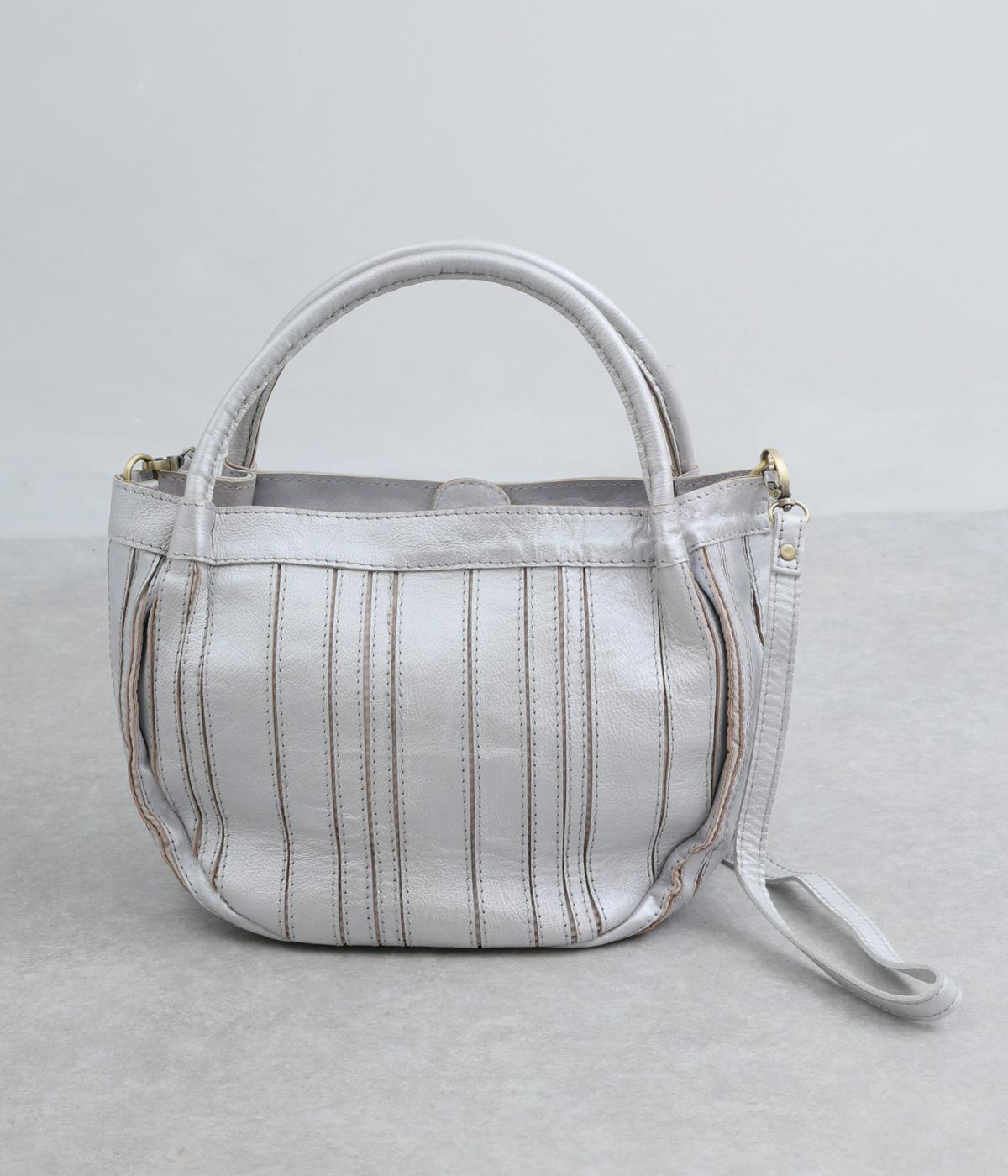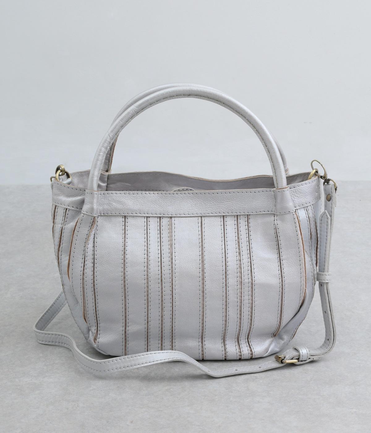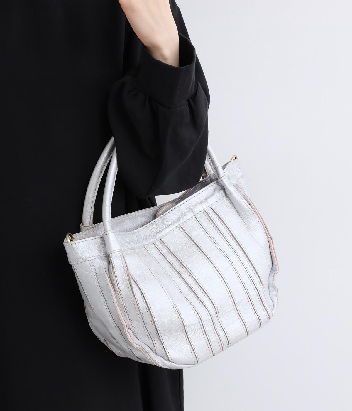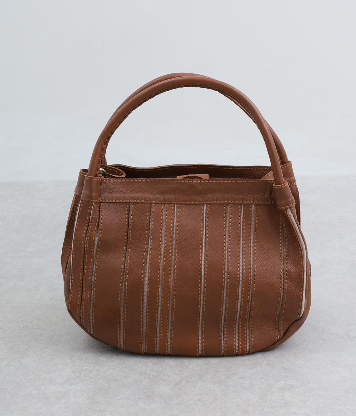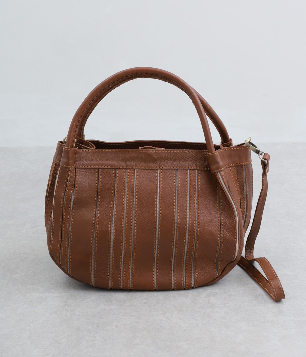 ストライプ状に切り込みを入れたデザインが新鮮なレザーバッグ。丁度いいサイズ感で手提げとしても持ちやすく、付属のショルダーベルトでななめ掛けも◎。センターのファスナーポケットが仕切りにもなり物の整理がしやすい作りです。
