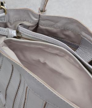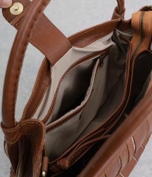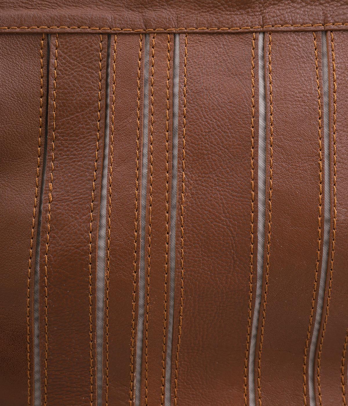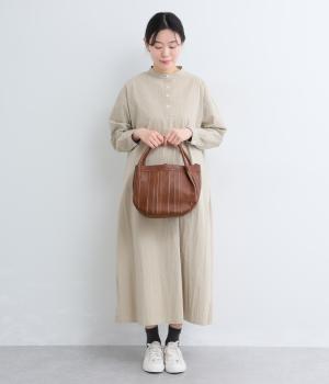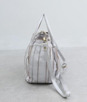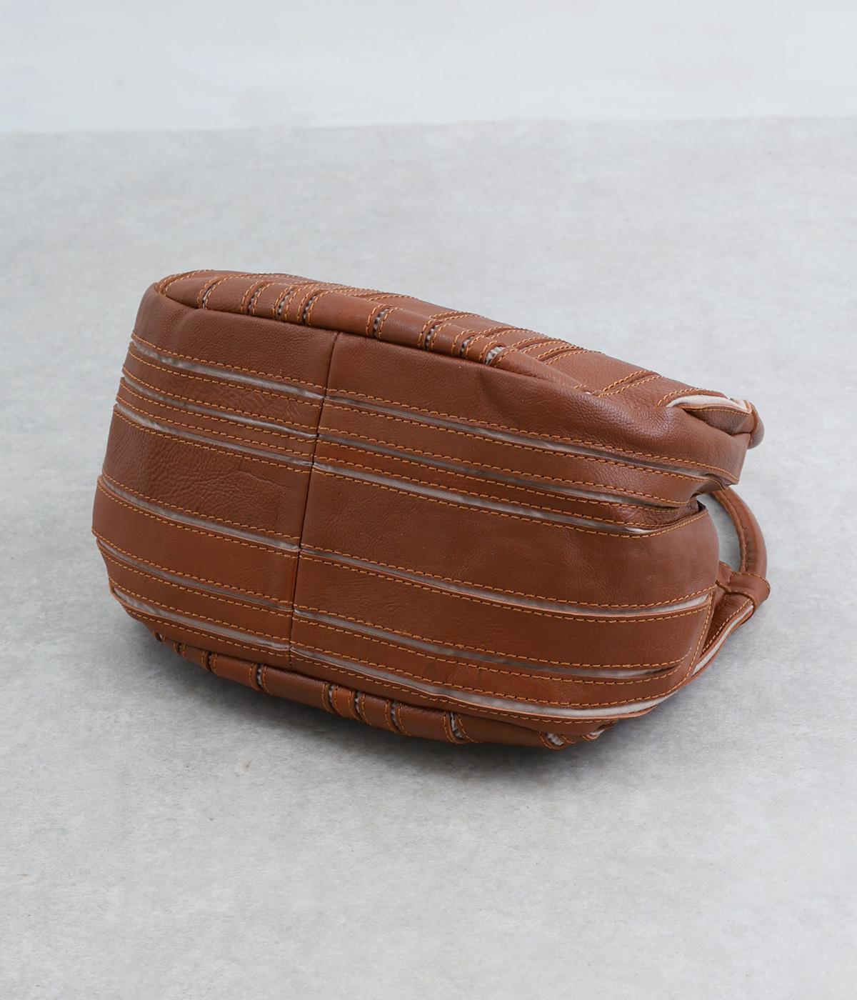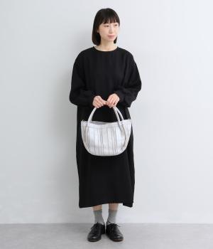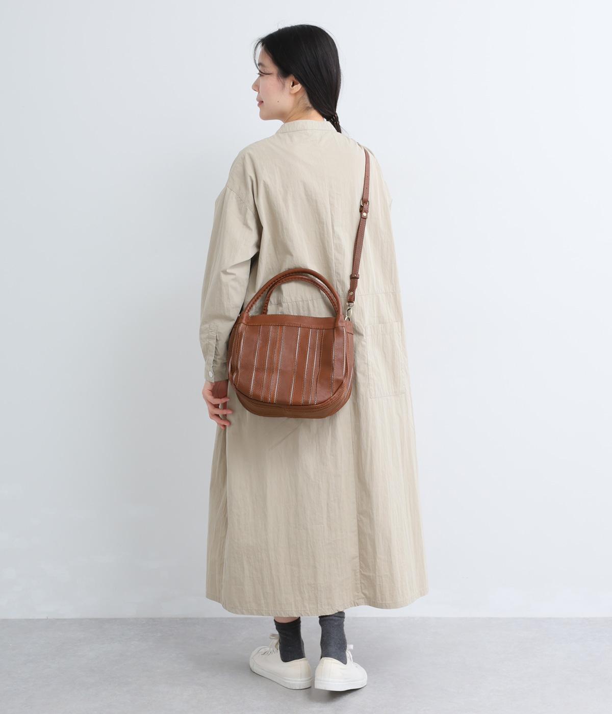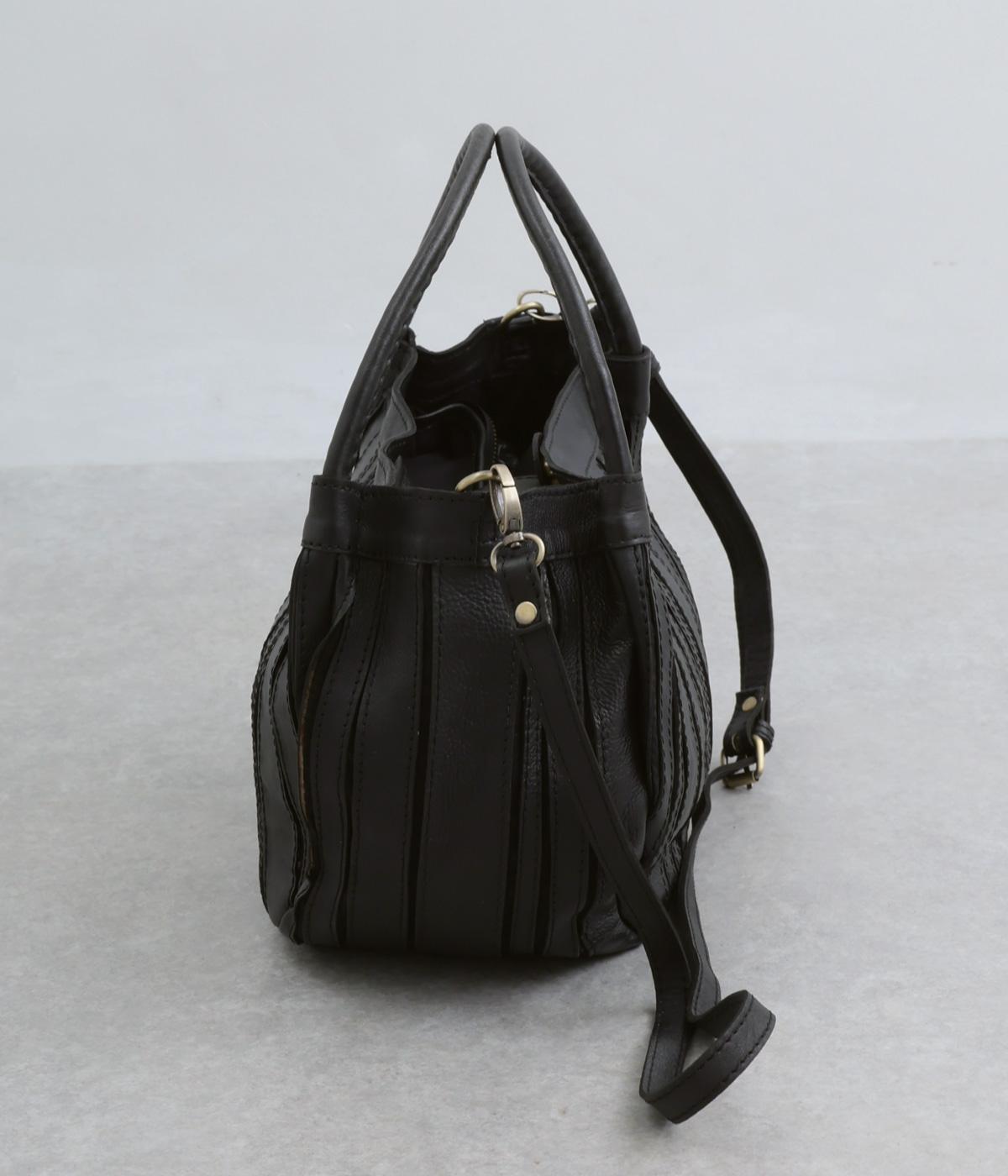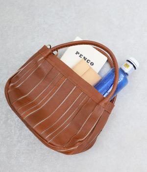 ストライプ状に切り込みを入れたデザインが新鮮なレザーバッグ。丁度いいサイズ感で手提げとしても持ちやすく、付属のショルダーベルトでななめ掛けも◎。センターのファスナーポケットが仕切りにもなり物の整理がしやすい作りです。