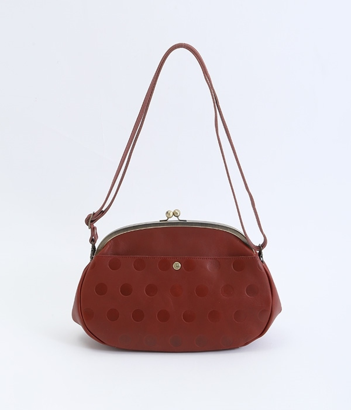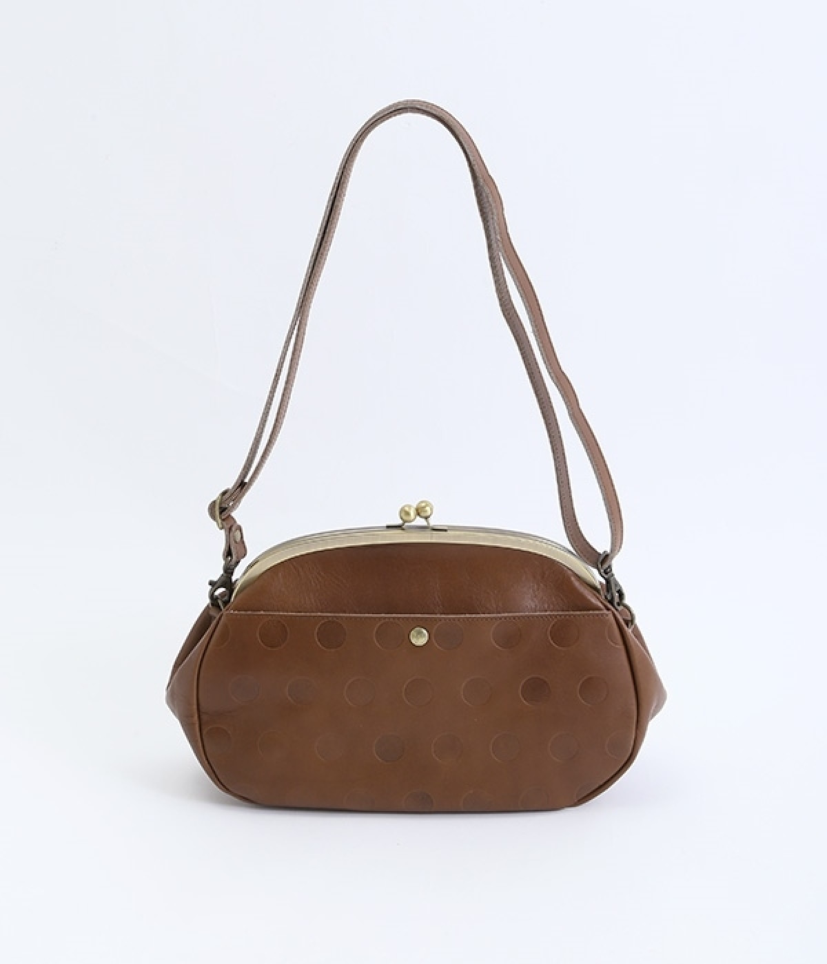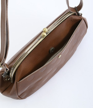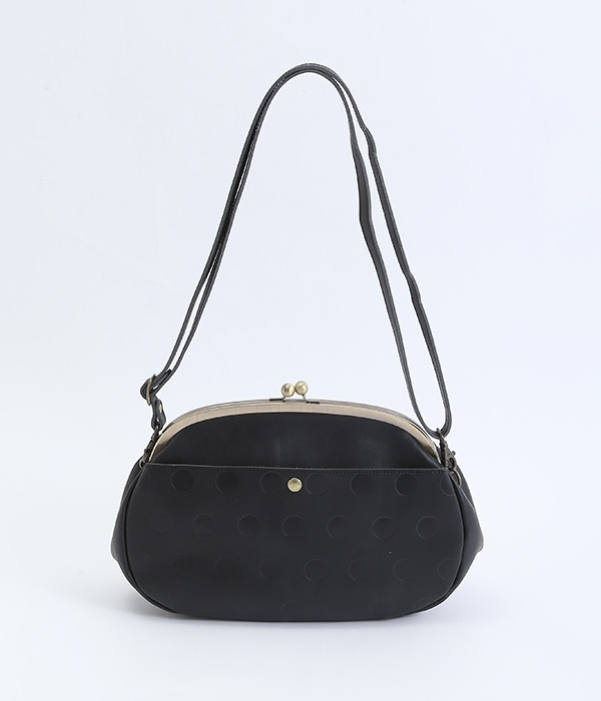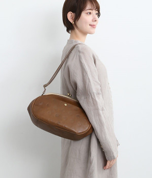 ころんとした丸いフォルムに水玉模様がお似合いなショルダーバッグです。内側に4つ、外側に1つポケットをつけ、鍵やスマートフォンなどすぐに取り出したいアイテムがバッグの中で迷子になりません。ペットボトルも入るサイズ感でデイリー使いに重宝。短く持ったり長く持ったり、ショルダーストラップの長さアレンジも可能です。カチッと閉まるがま口で、装いがちょっぴりレトロな雰囲気に。