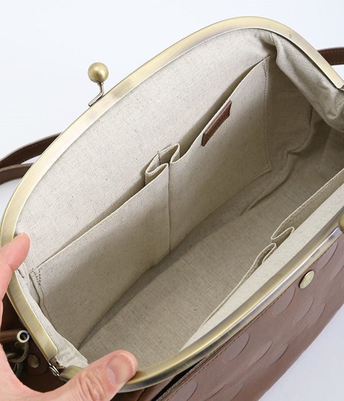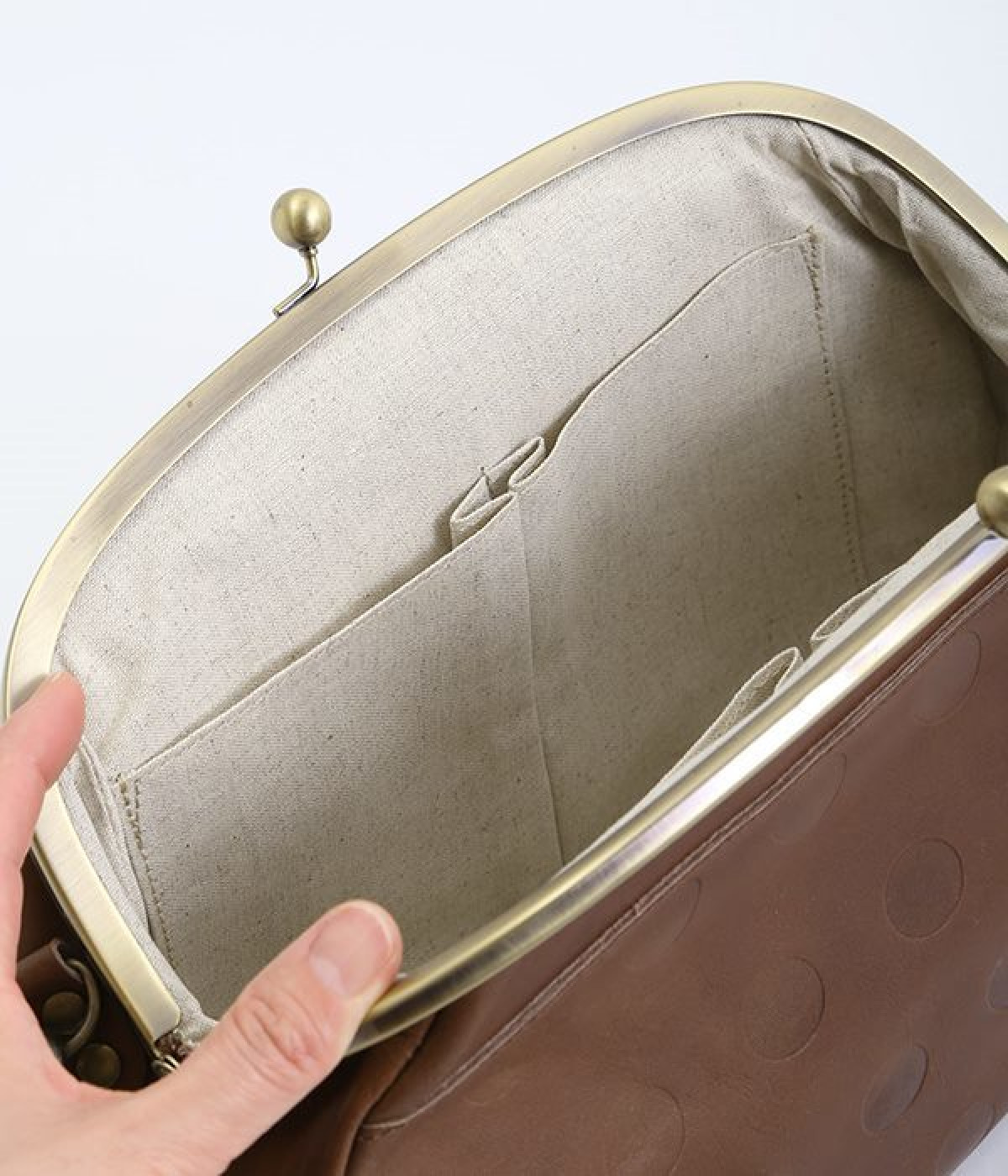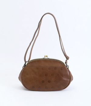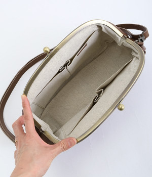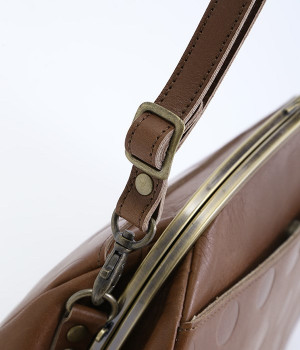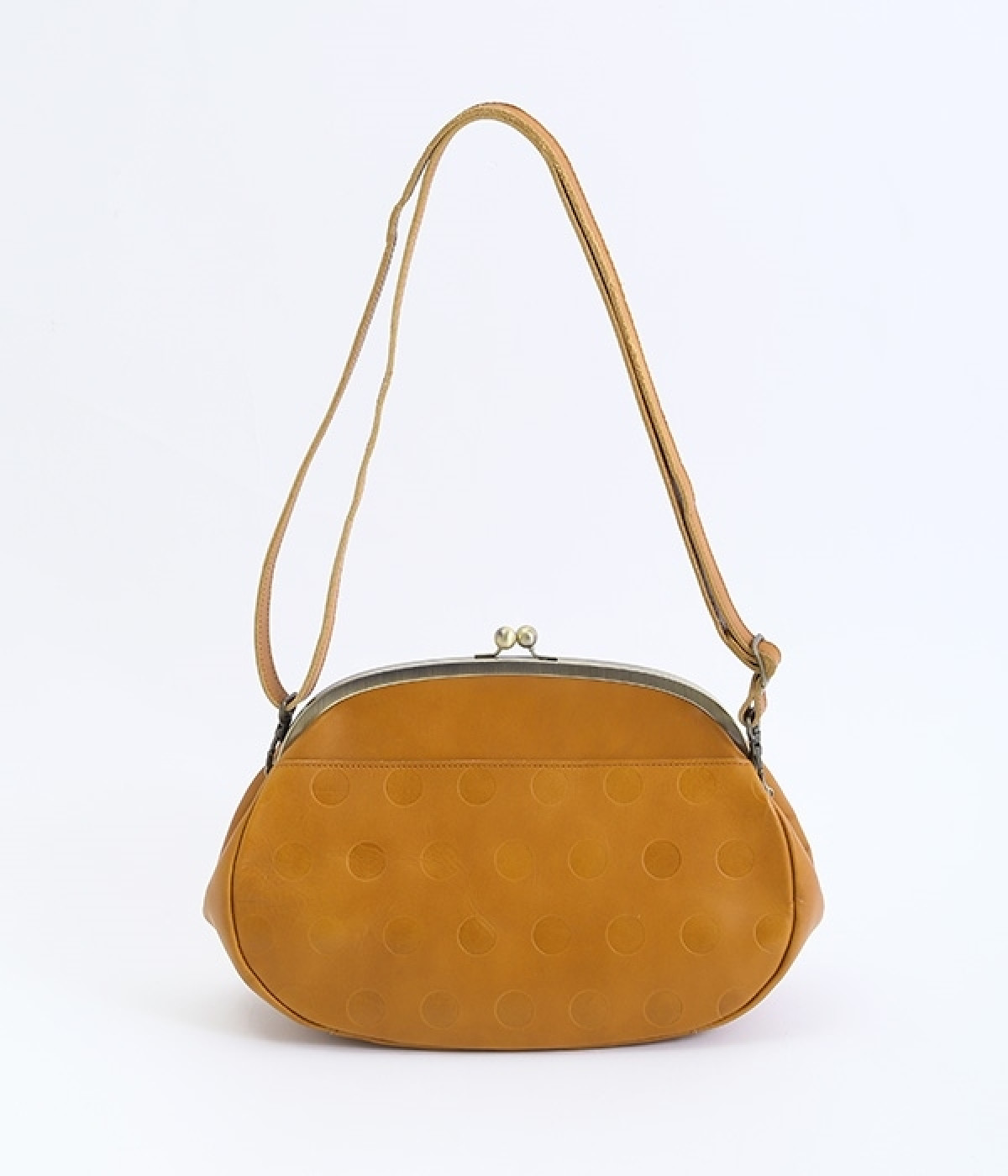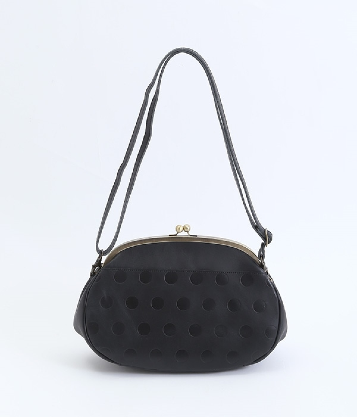 ころんとした丸いフォルムに水玉模様がお似合いなショルダーバッグです。内側に4つ、外側に1つポケットをつけ、鍵やスマートフォンなどすぐに取り出したいアイテムがバッグの中で迷子になりません。ペットボトルも入るサイズ感でデイリー使いに重宝。短く持ったり長く持ったり、ショルダーストラップの長さアレンジも可能です。カチッと閉まるがま口で、装いがちょっぴりレトロな雰囲気に。