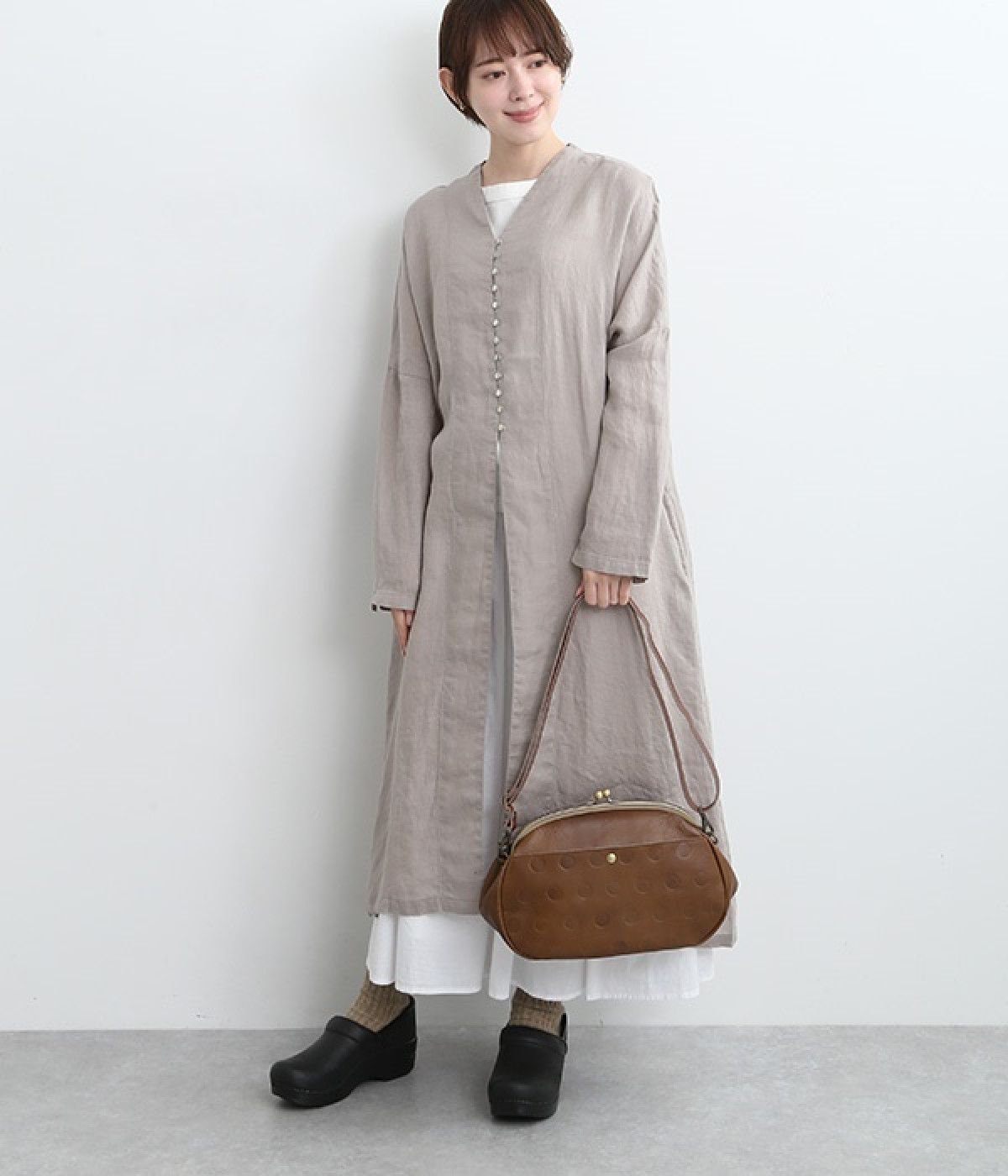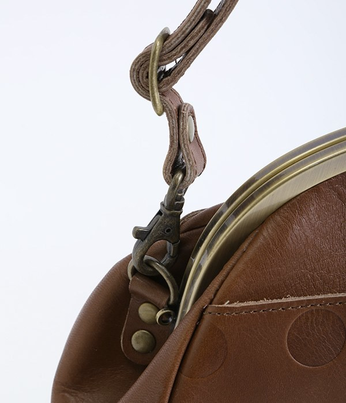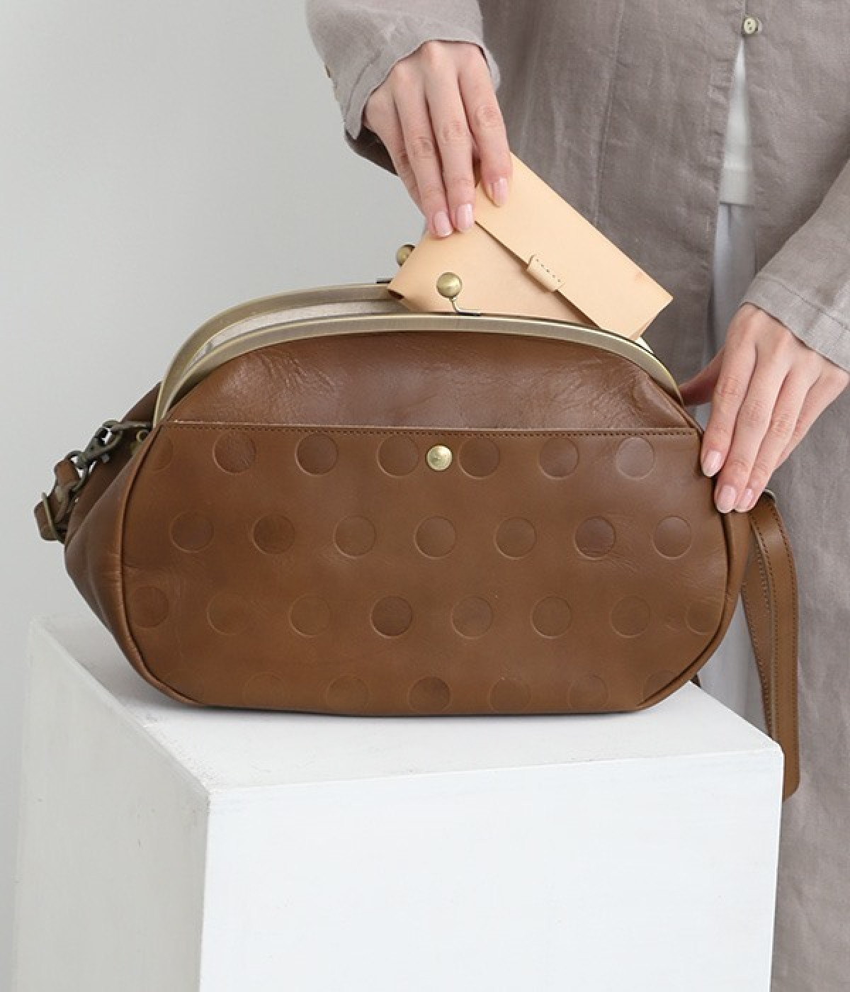 ころんとした丸いフォルムに水玉模様がお似合いなショルダーバッグです。内側に4つ、外側に1つポケットをつけ、鍵やスマートフォンなどすぐに取り出したいアイテムがバッグの中で迷子になりません。ペットボトルも入るサイズ感でデイリー使いに重宝。短く持ったり長く持ったり、ショルダーストラップの長さアレンジも可能です。カチッと閉まるがま口で、装いがちょっぴりレトロな雰囲気に。