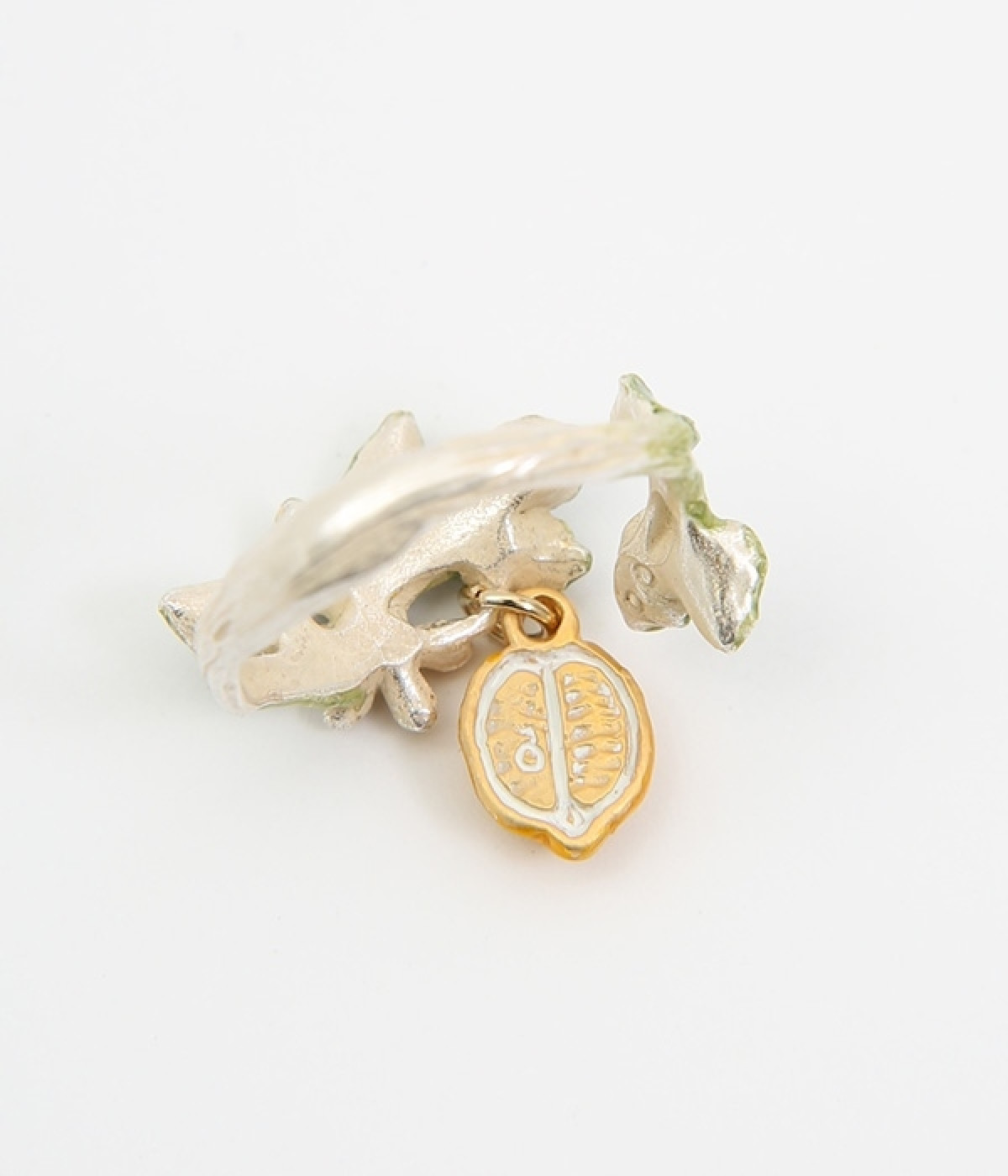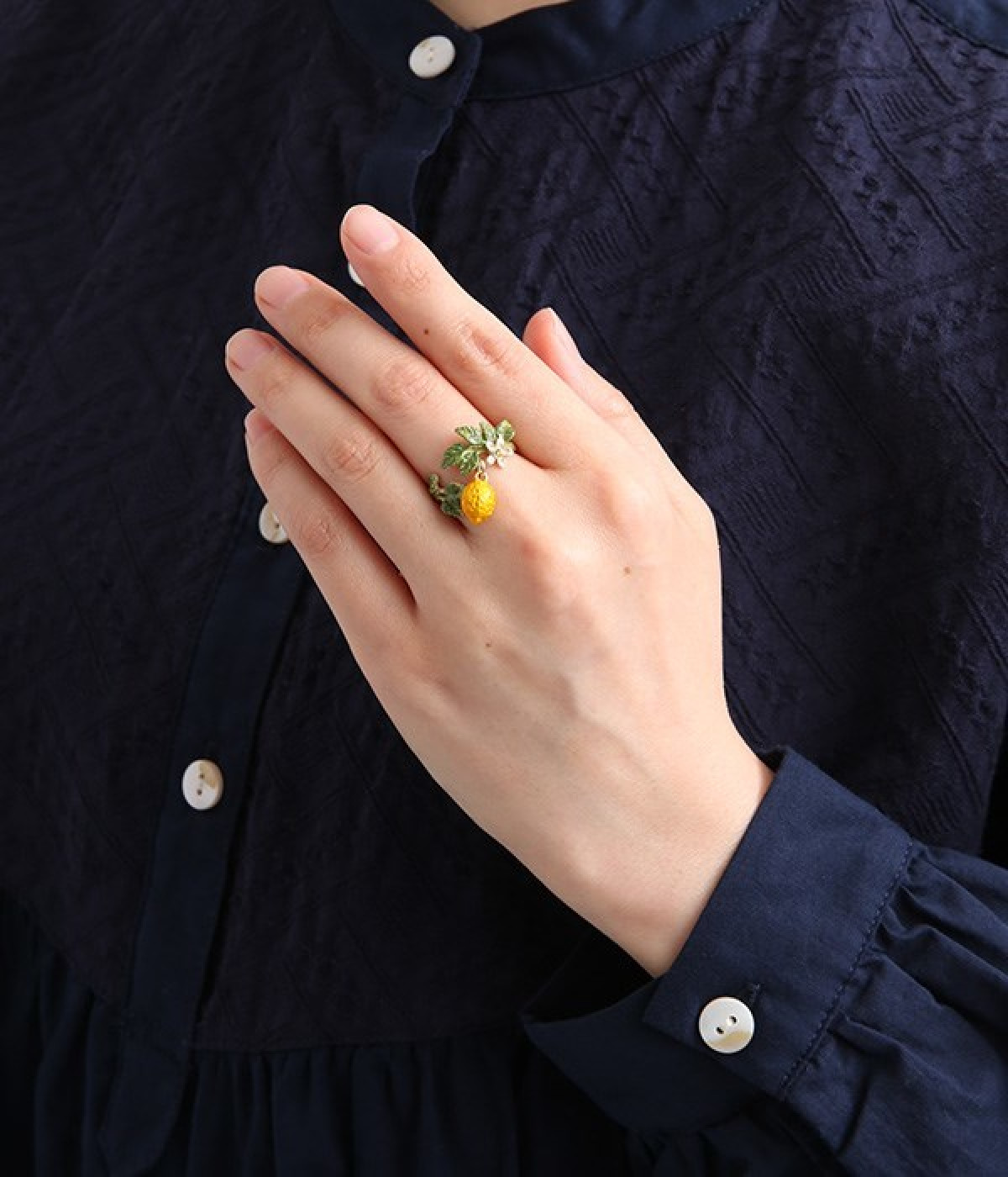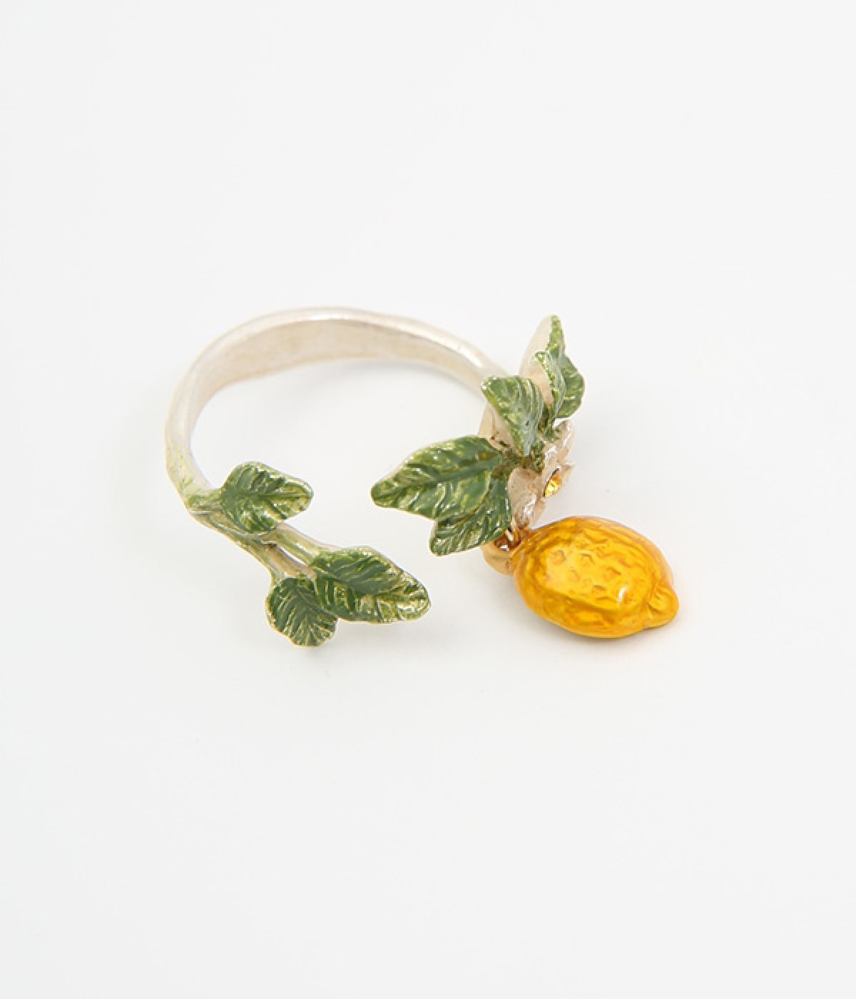 レモンの木をそのままぐるりと巻き付けたかのような、遊び心溢れるデザインのリング。ふっくらとしたフォルムのレモンモチーフは皮や種まで細かく作りこまれており存在感のあるアイテムです。花芯には黄色いラインストーンをあしらい、華やかに仕上げました。ナチュラルな色合いが大人の装いと好相性で、コーディネートに取り入れやすいのもポイントです。