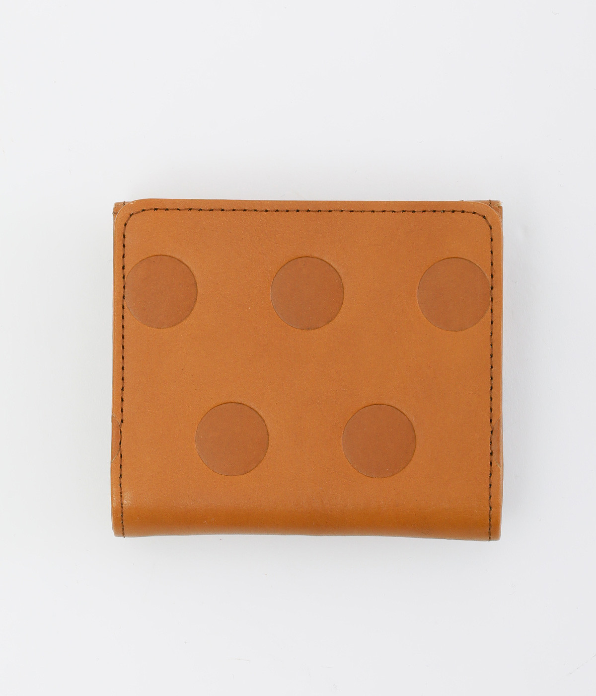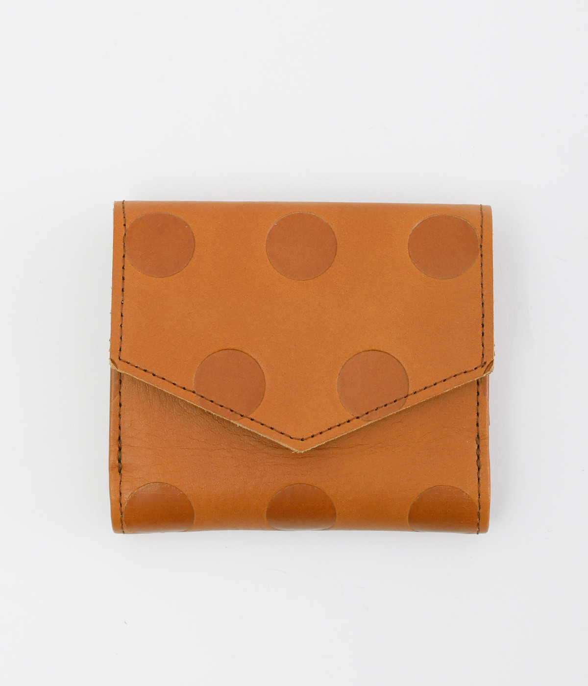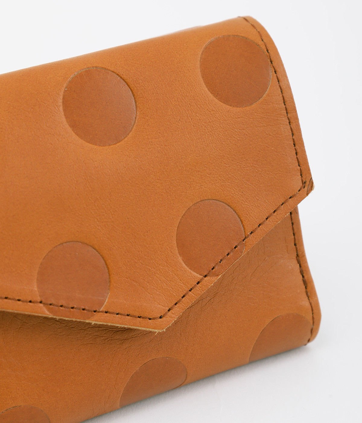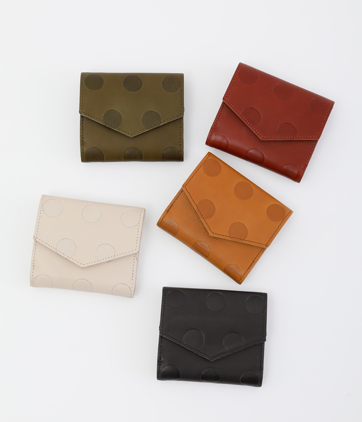 ソフトな肌触りの牛革にドットの型押しでアクセントをプラス。裏地にはほどよくしっかりとした綿オックス生地を配して、強度と使い勝手の良さを高めます。同色系にまとめているのもポイント。
