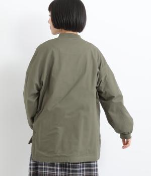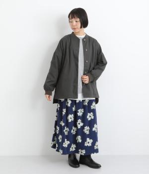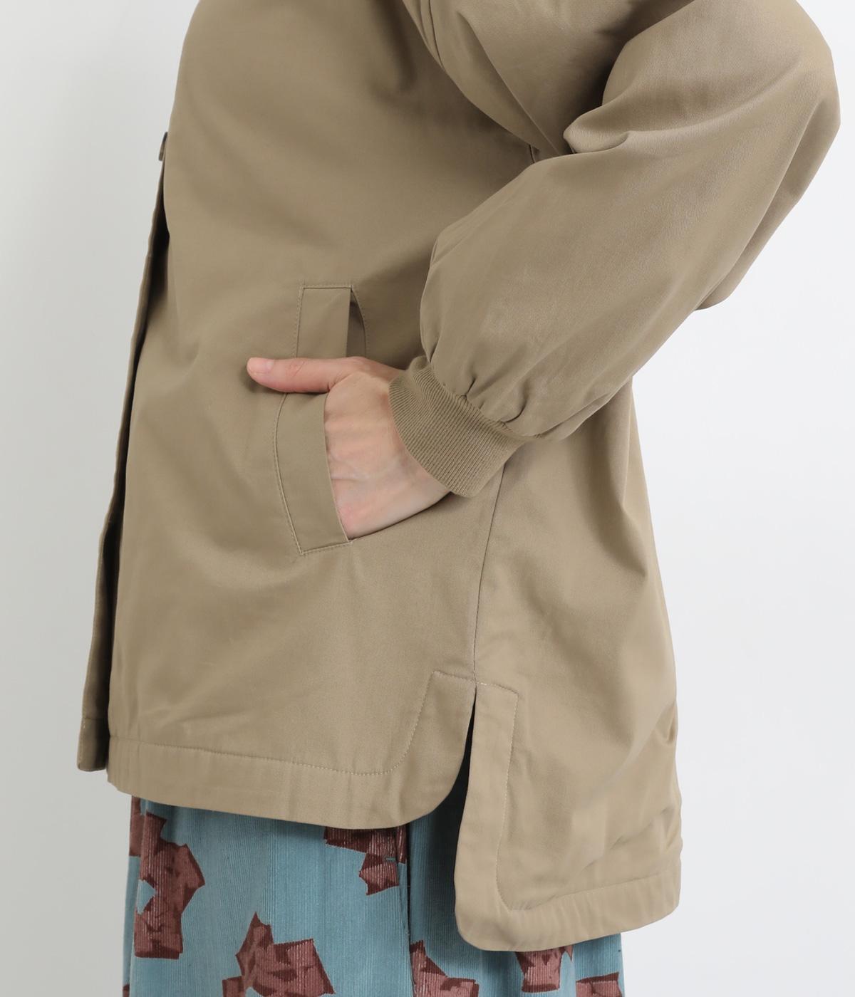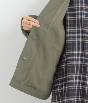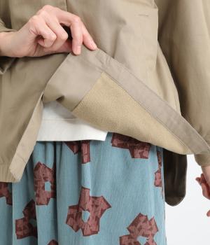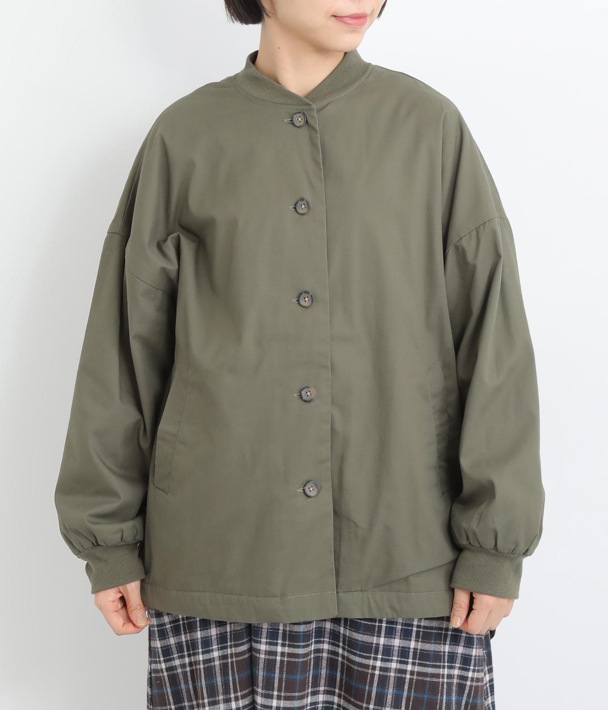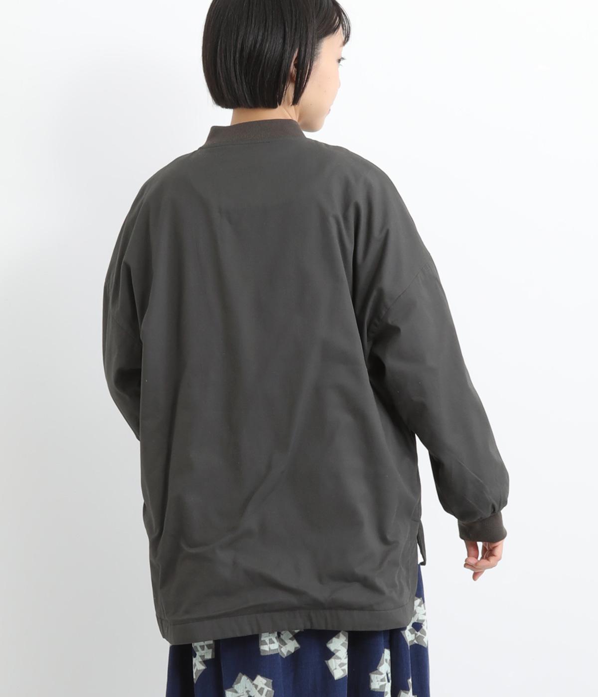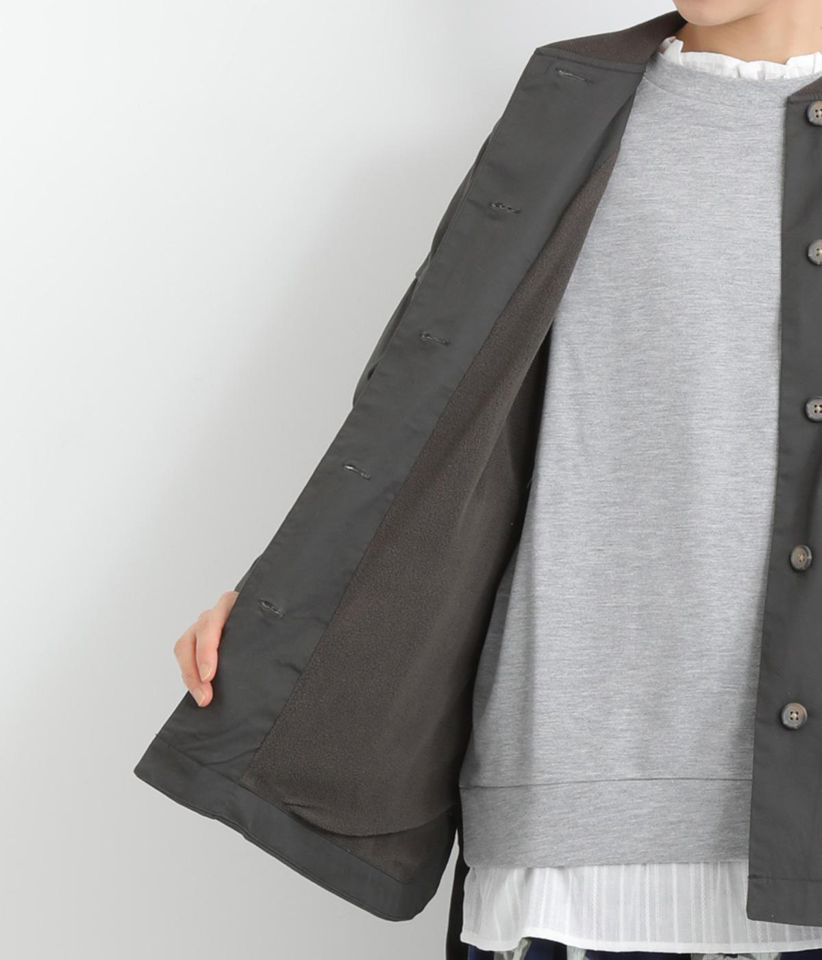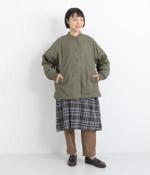 ゆとりのあるボックスシルエットでカジュアルに羽織りやすいジャケット。襟ぐりや袖口はリブ切り替えであたたかみをプラス。前後差をつけたヘムラインも特徴で、横姿にもアクセントをつけています。