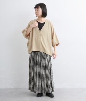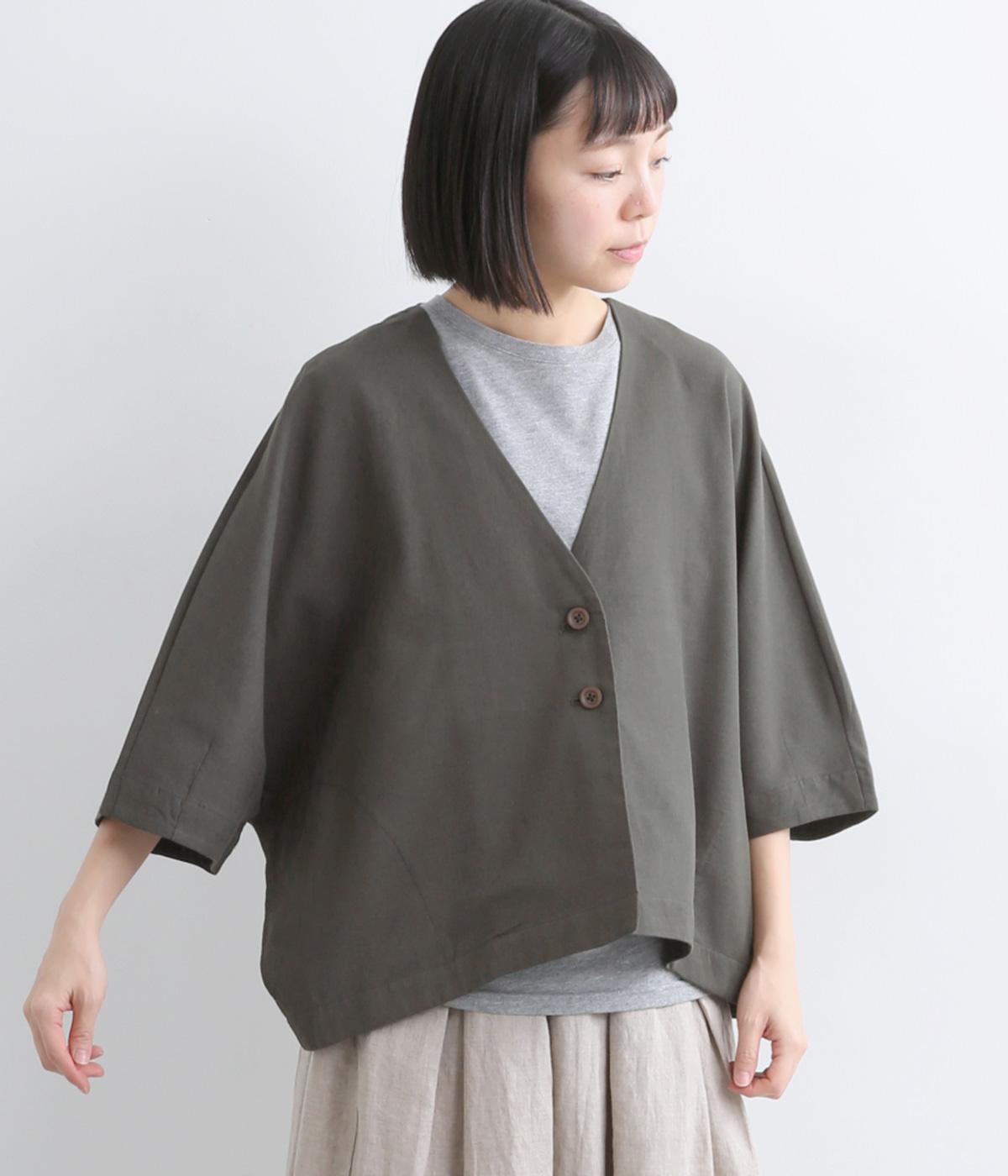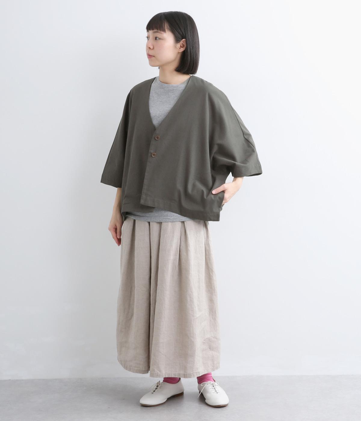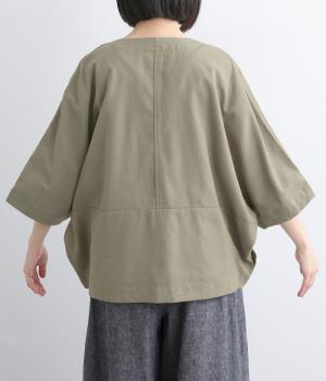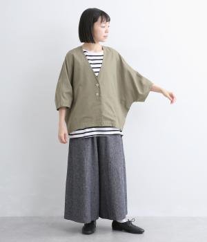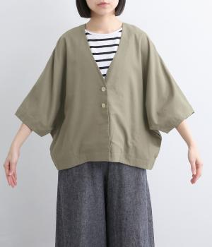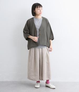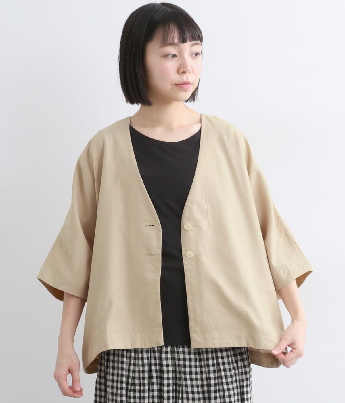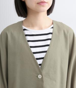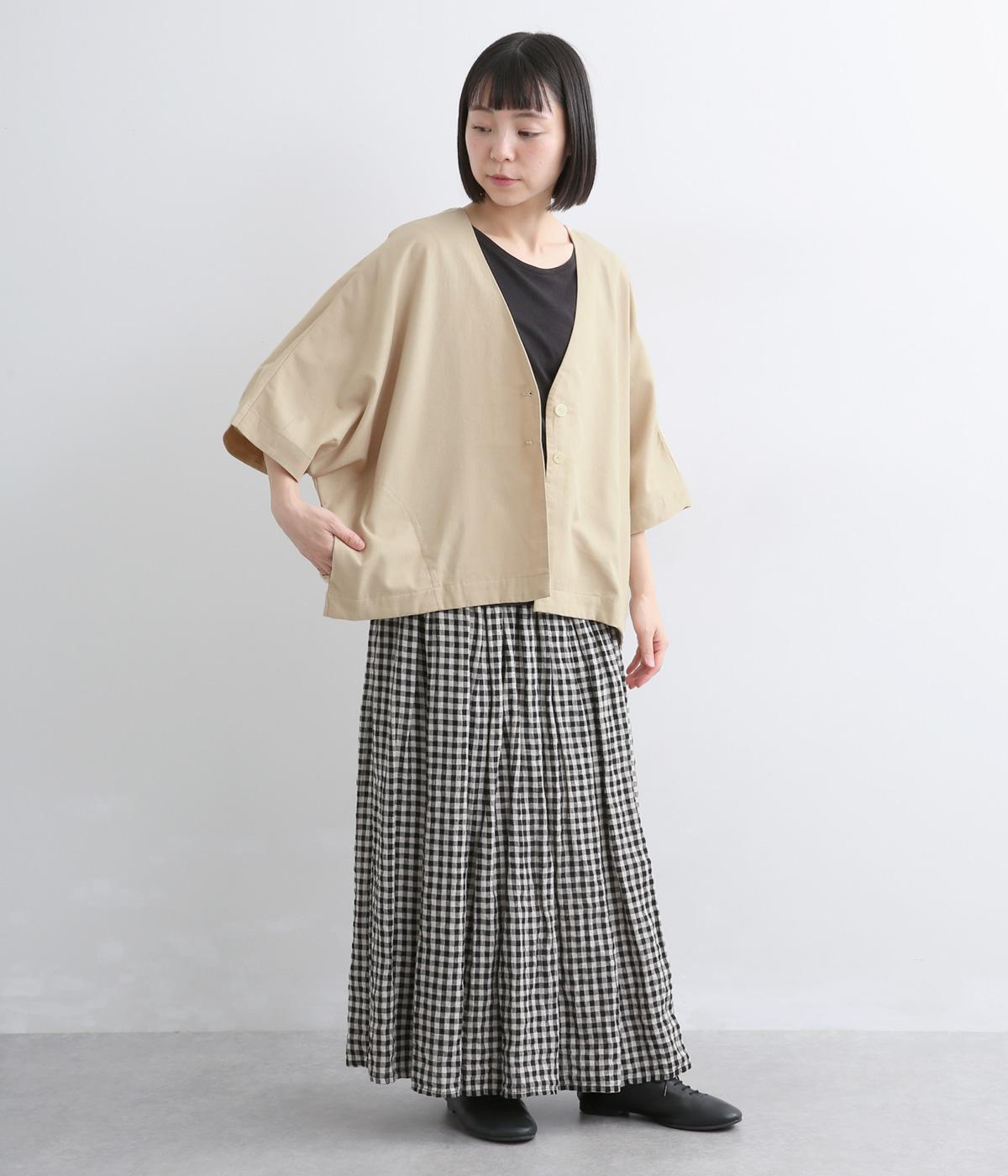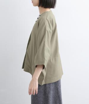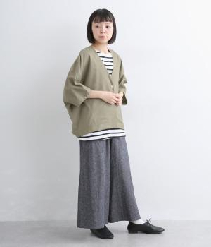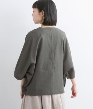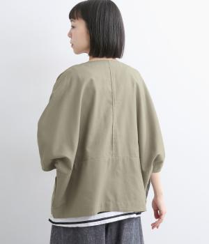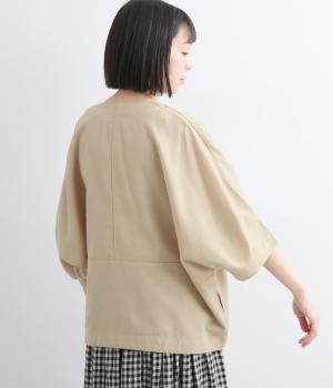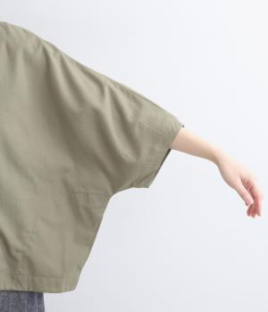 接触冷感素材でロングシーズン快適に羽織れるジャケットをつくりました。ゆったりしたシルエットがこれな感のあるハンサムな表情に。ダーツで自然な立体感をつけたハーフ袖が適度な抜け感をプラス。