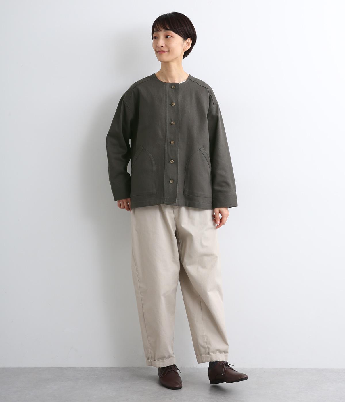 ライトアウターとしても羽織りやすいノーカラージャケット。大きなポケットやゆとりのある太袖が特徴的なカジュアルタイプに仕上げました。すっきりとしたボックスシルエットに後ろタックで適度なゆとりもプラス。