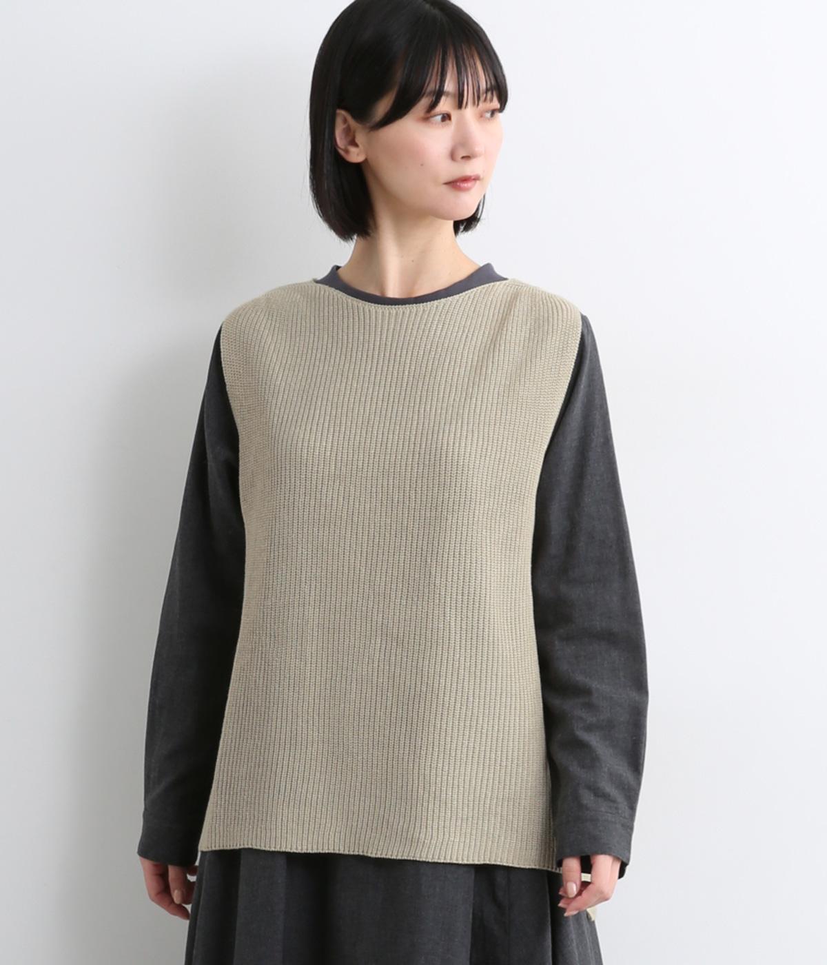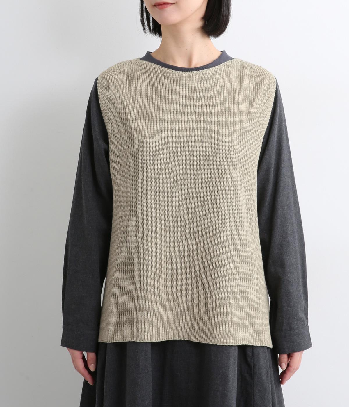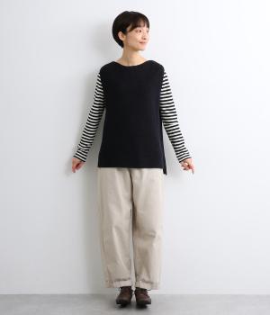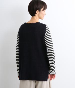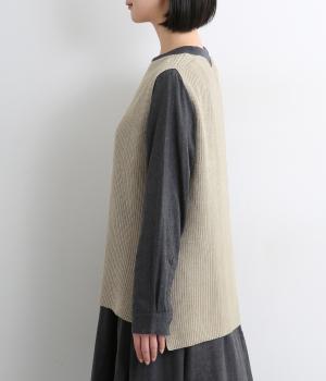 ほんのり光沢のある軽やかなアクリルコットンで編み上げ、畦編みの凹凸感を惹き立てました。さらっとした肌ざわりでロングシーズン着まわしやすいニットです。