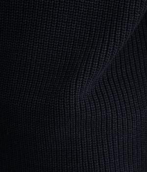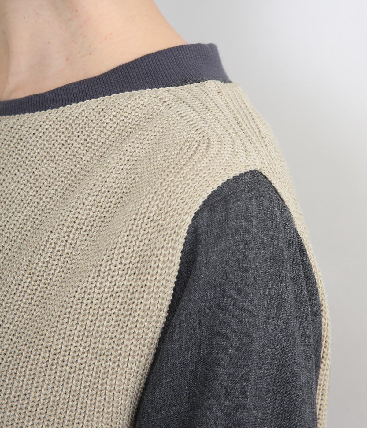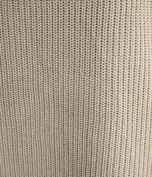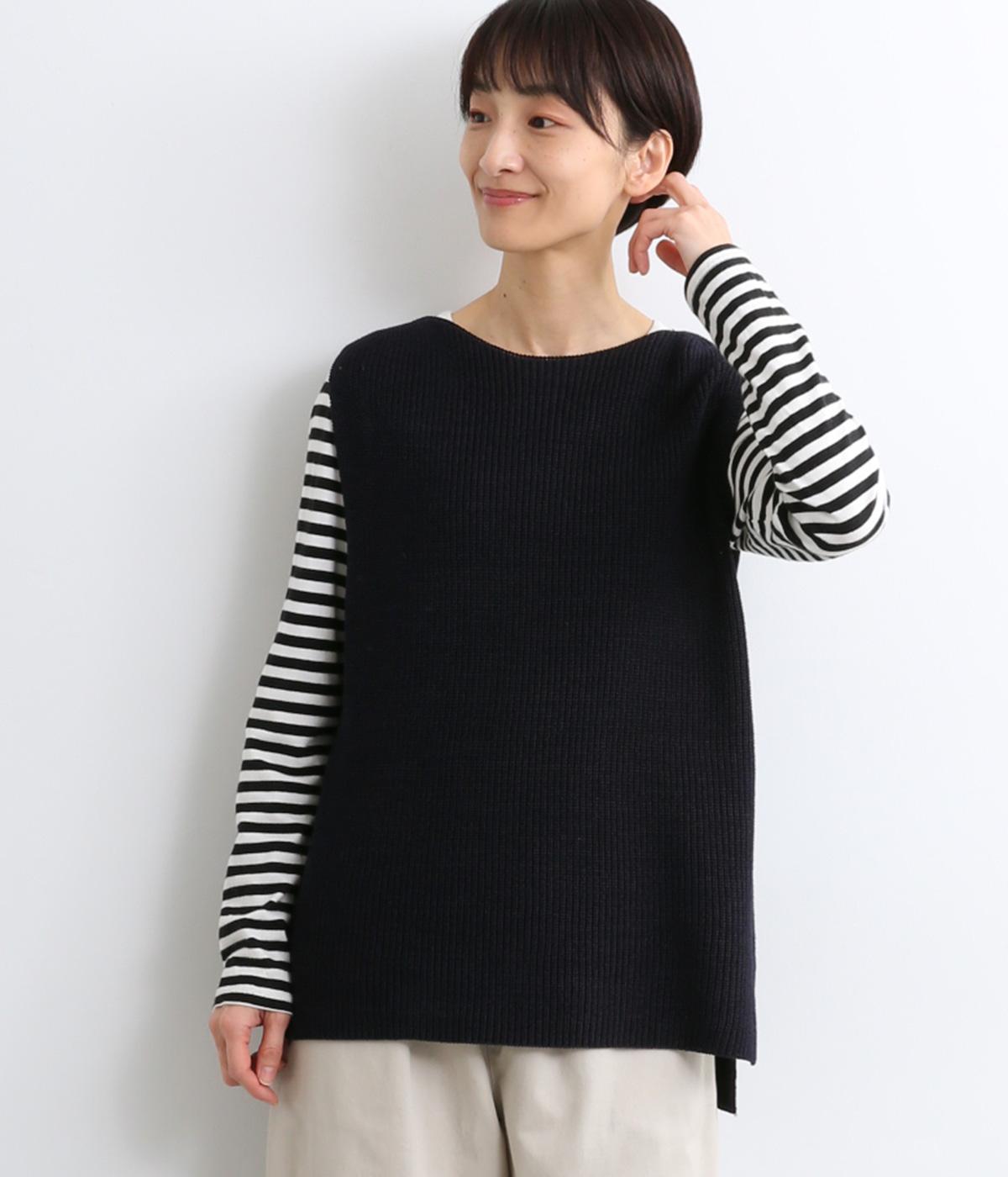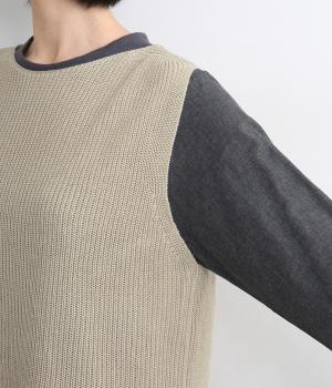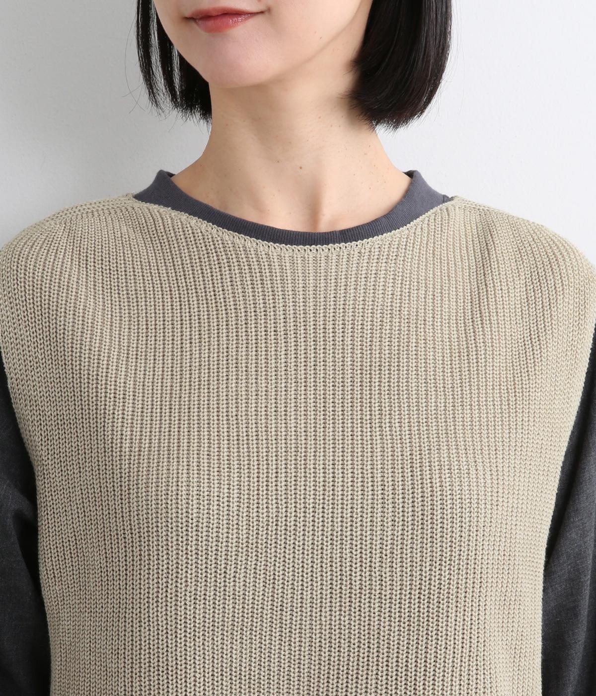 ほんのり光沢のある軽やかなアクリルコットンで編み上げ、畦編みの凹凸感を惹き立てました。さらっとした肌ざわりでロングシーズン着まわしやすいニットです。