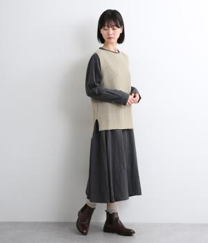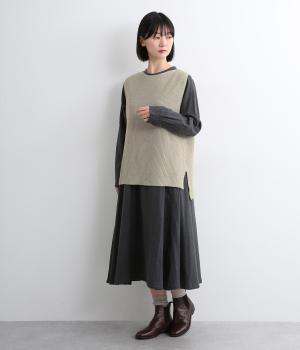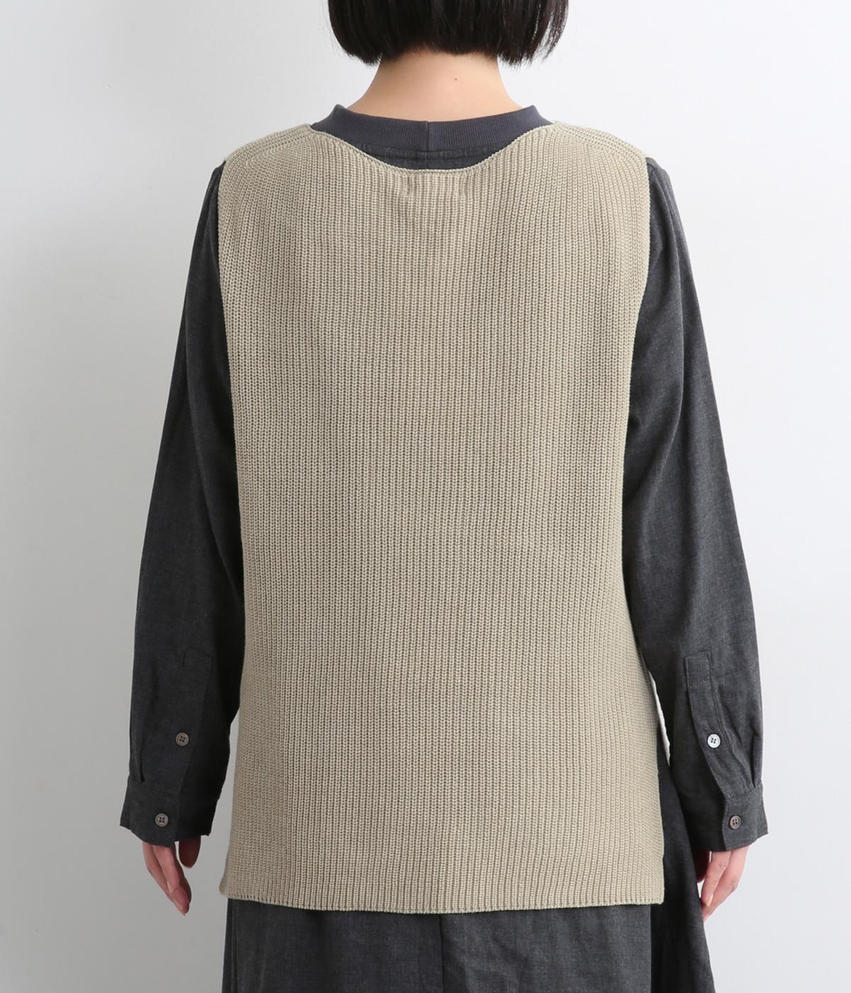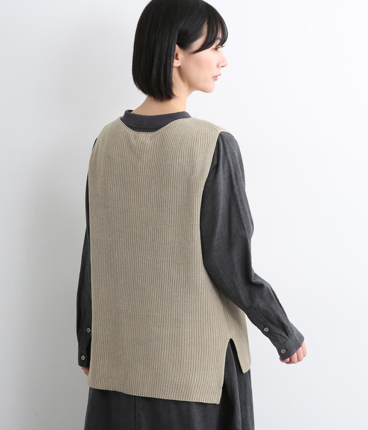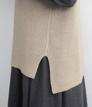 すとんと落ちて着こなしにタテラインを作ってくれるニットベスト。前後差をつけた裾まわりはスリット入りでボトム合わせもすっきりと。シャツはもちろん、ラフなカットソー合わせもさまになります。