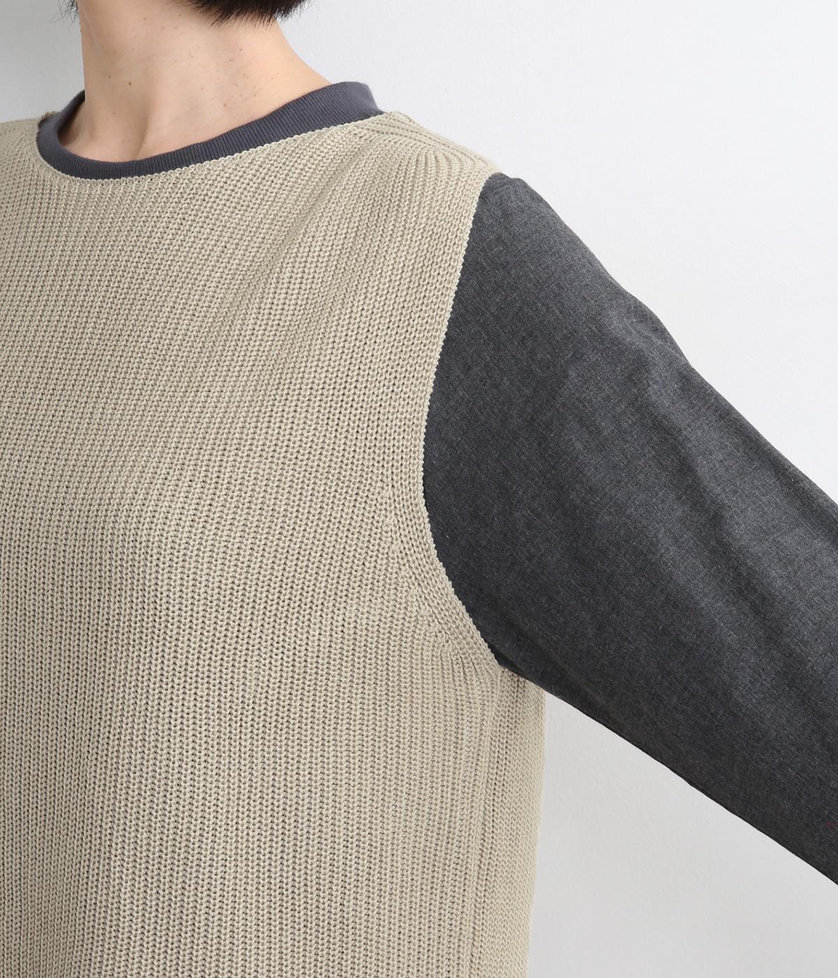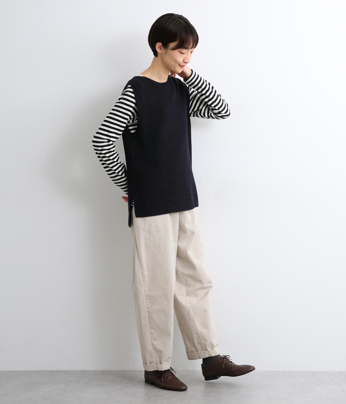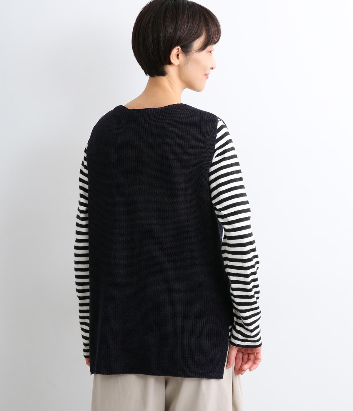 すとんと落ちて着こなしにタテラインを作ってくれるニットベスト。前後差をつけた裾まわりはスリット入りでボトム合わせもすっきりと。シャツはもちろん、ラフなカットソー合わせもさまになります。
