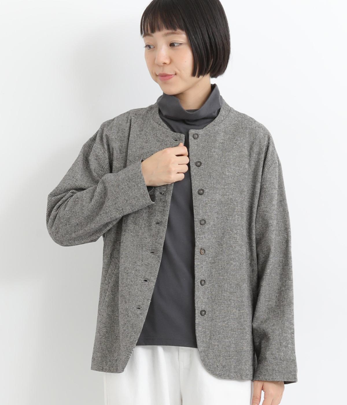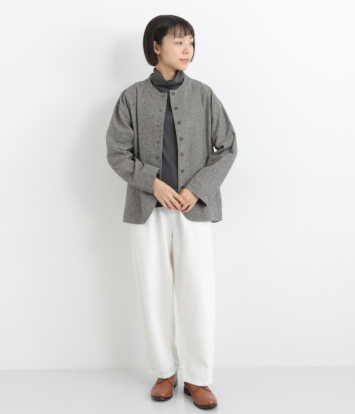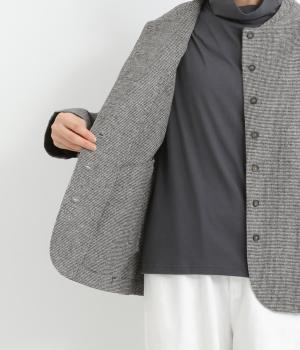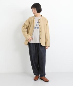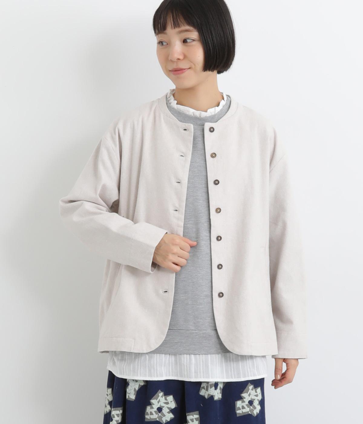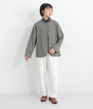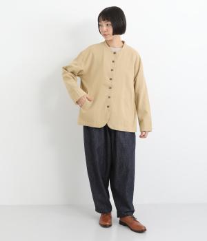 ノーカラーにラウンドヘムでやわらかな印象にまとめたジャケット。小さめの多ボタンがちょうどいいアクセントになっています。袖はラフに折り返して裏布を見せたワンポイントにするのもおすすめ。