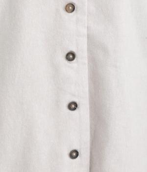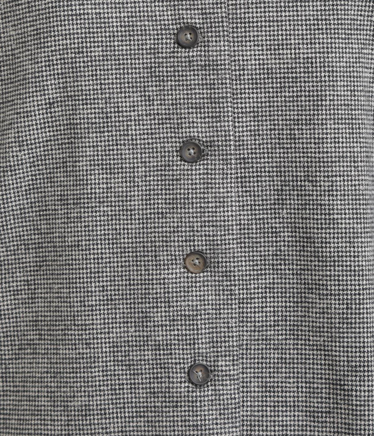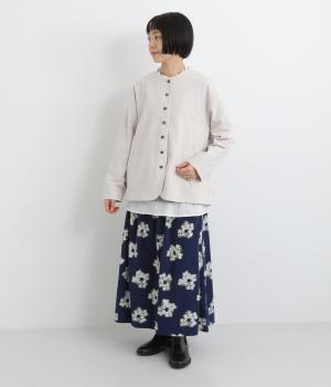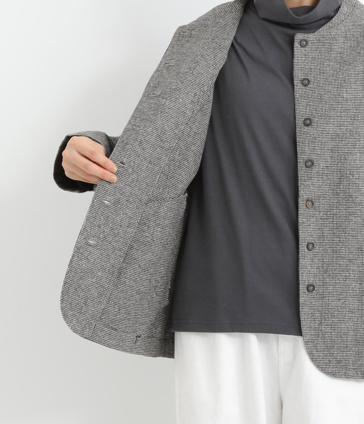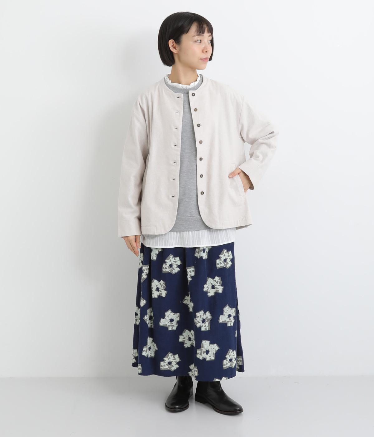ノーカラーにラウンドヘムでやわらかな印象にまとめたジャケット。小さめの多ボタンがちょうどいいアクセントになっています。袖はラフに折り返して裏布を見せたワンポイントにするのもおすすめ。