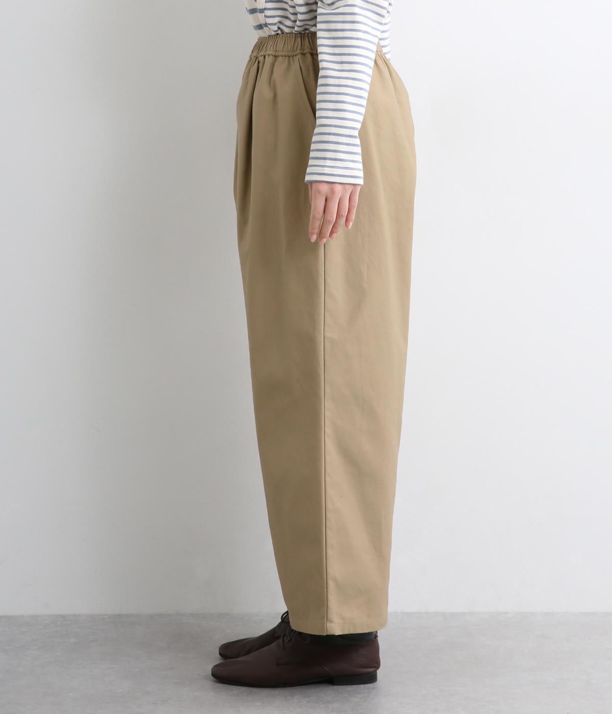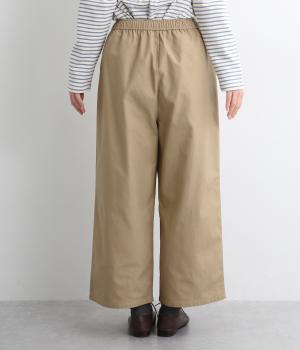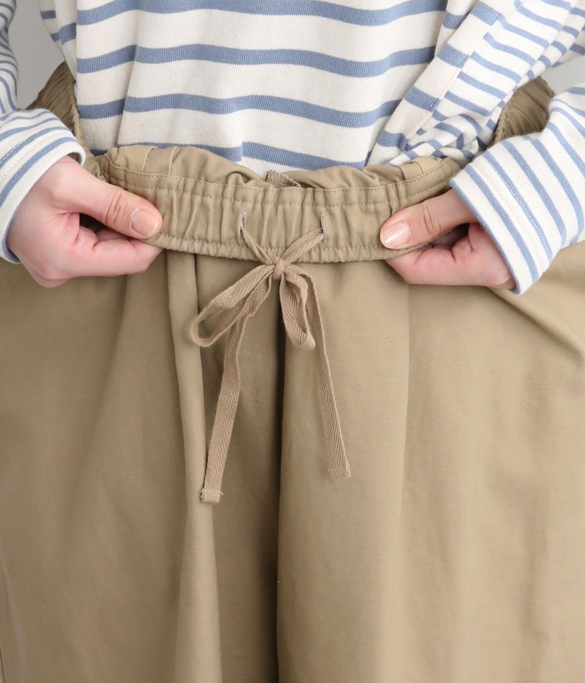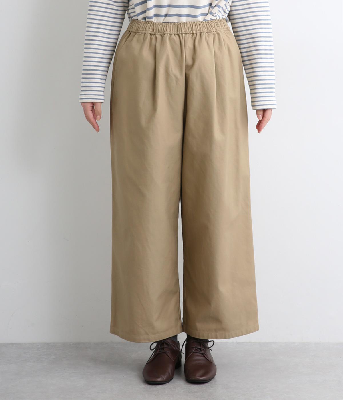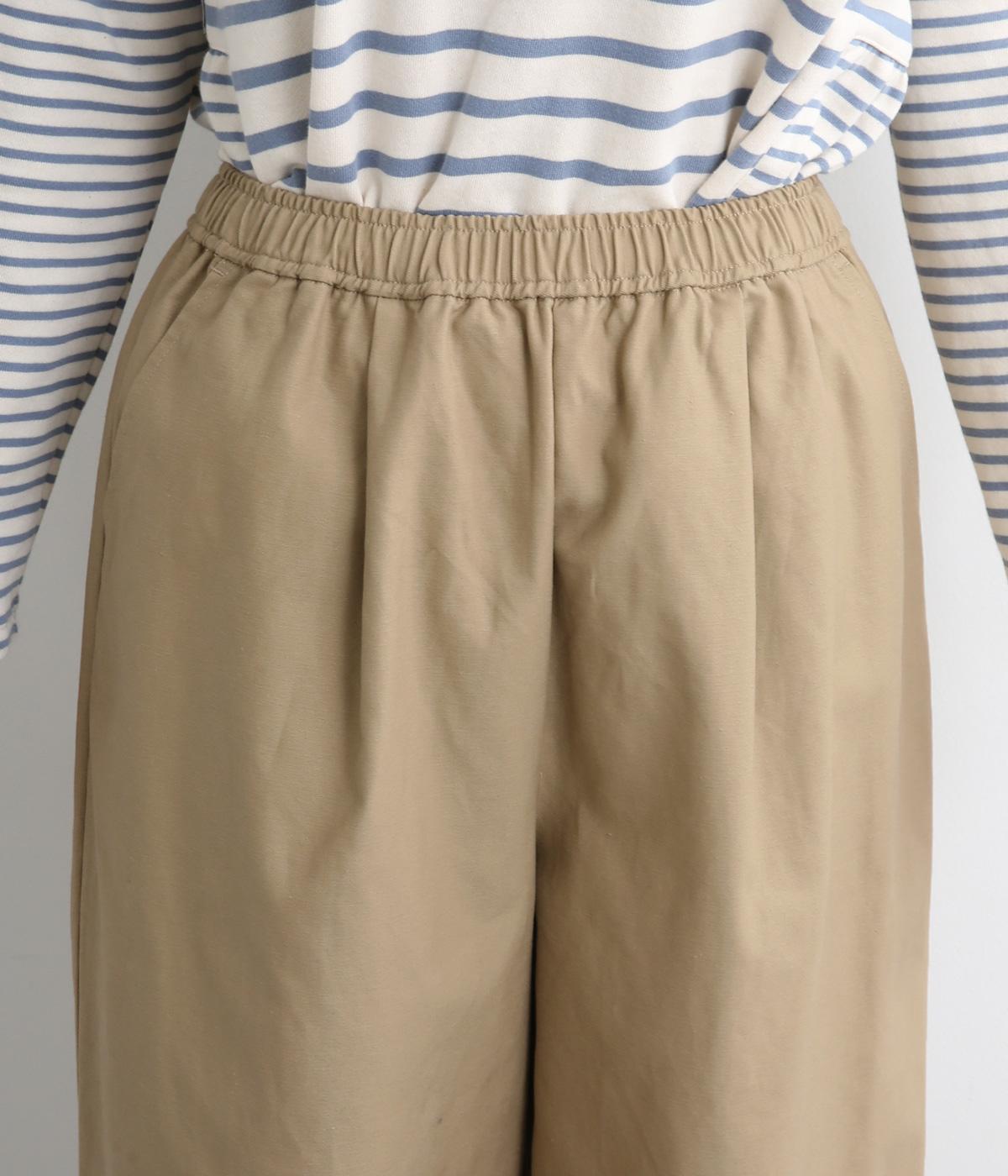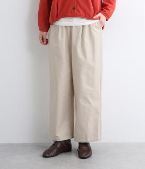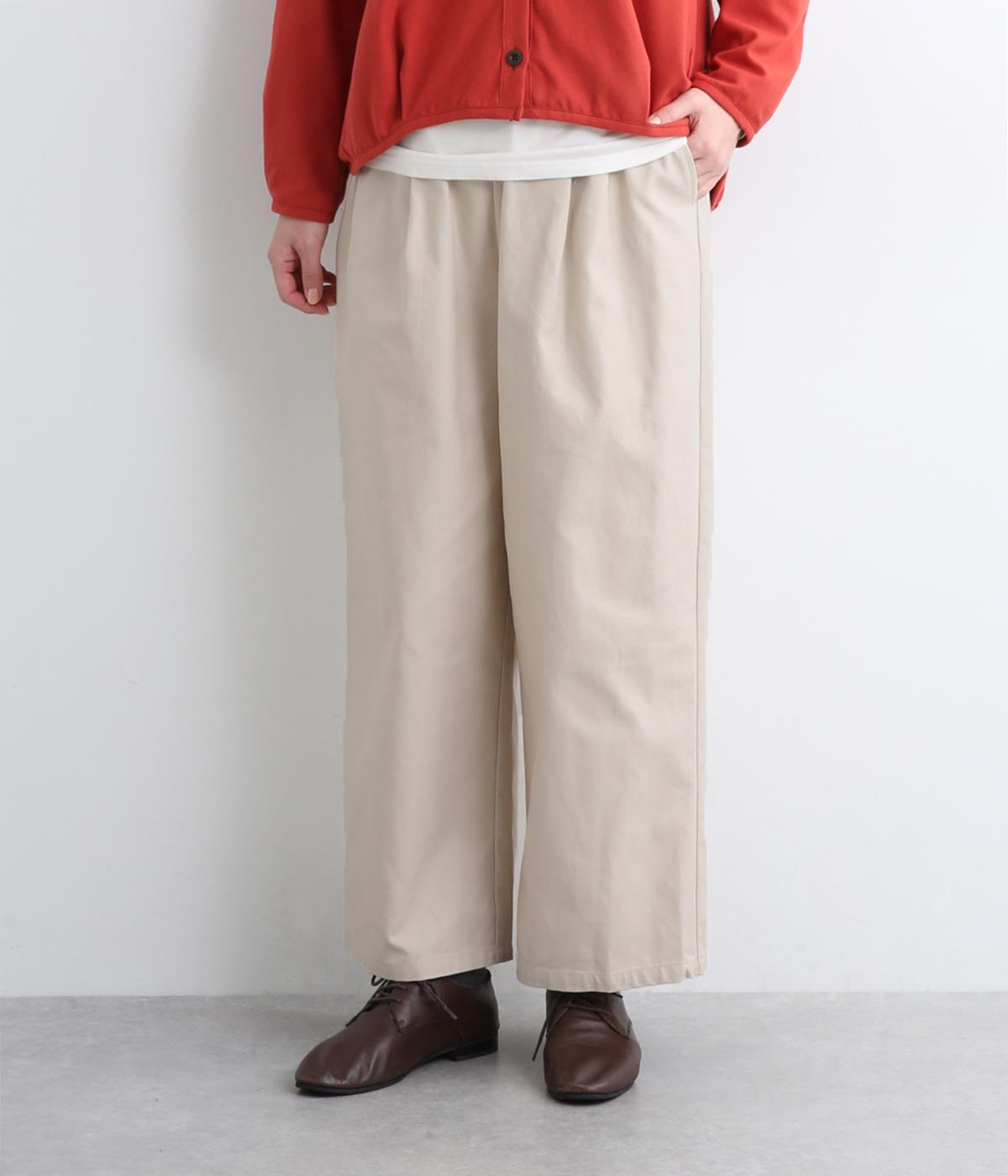 タックを入れてゆとりを持たせたワイドパンツ。適度なハリとふくらみのある生地感で、ボリュームのわりにすっきりとした印象に。ウエストはフィット感のある総平ゴムに微調整できる内紐を入れました。