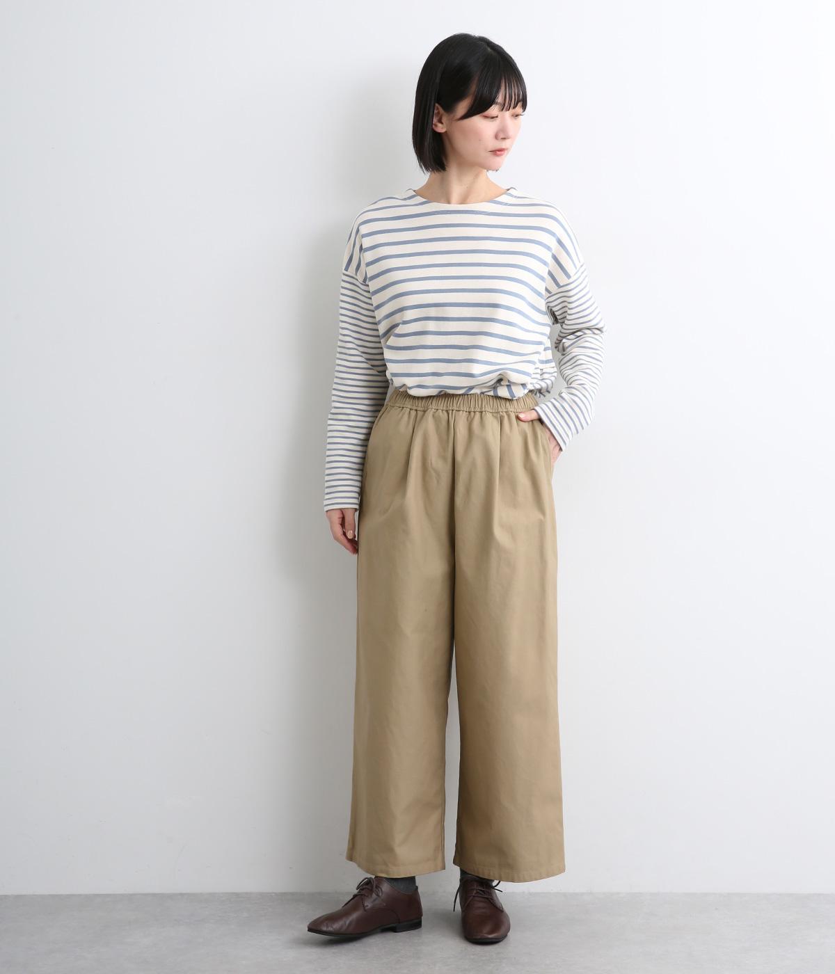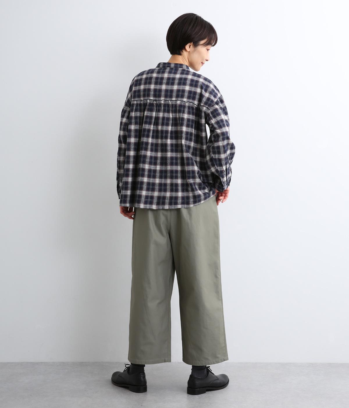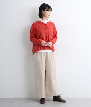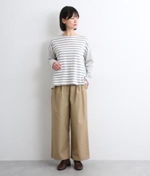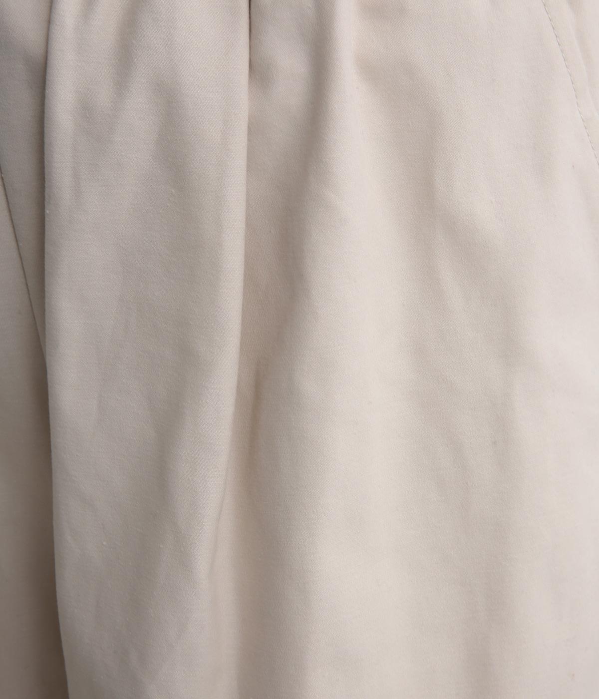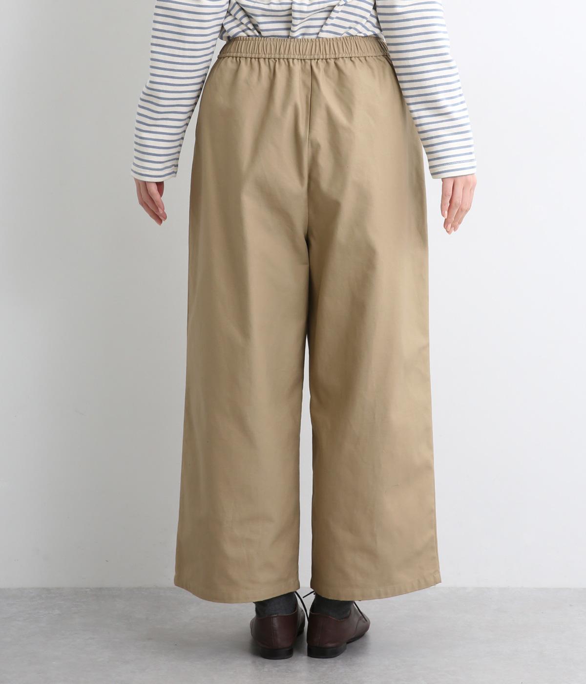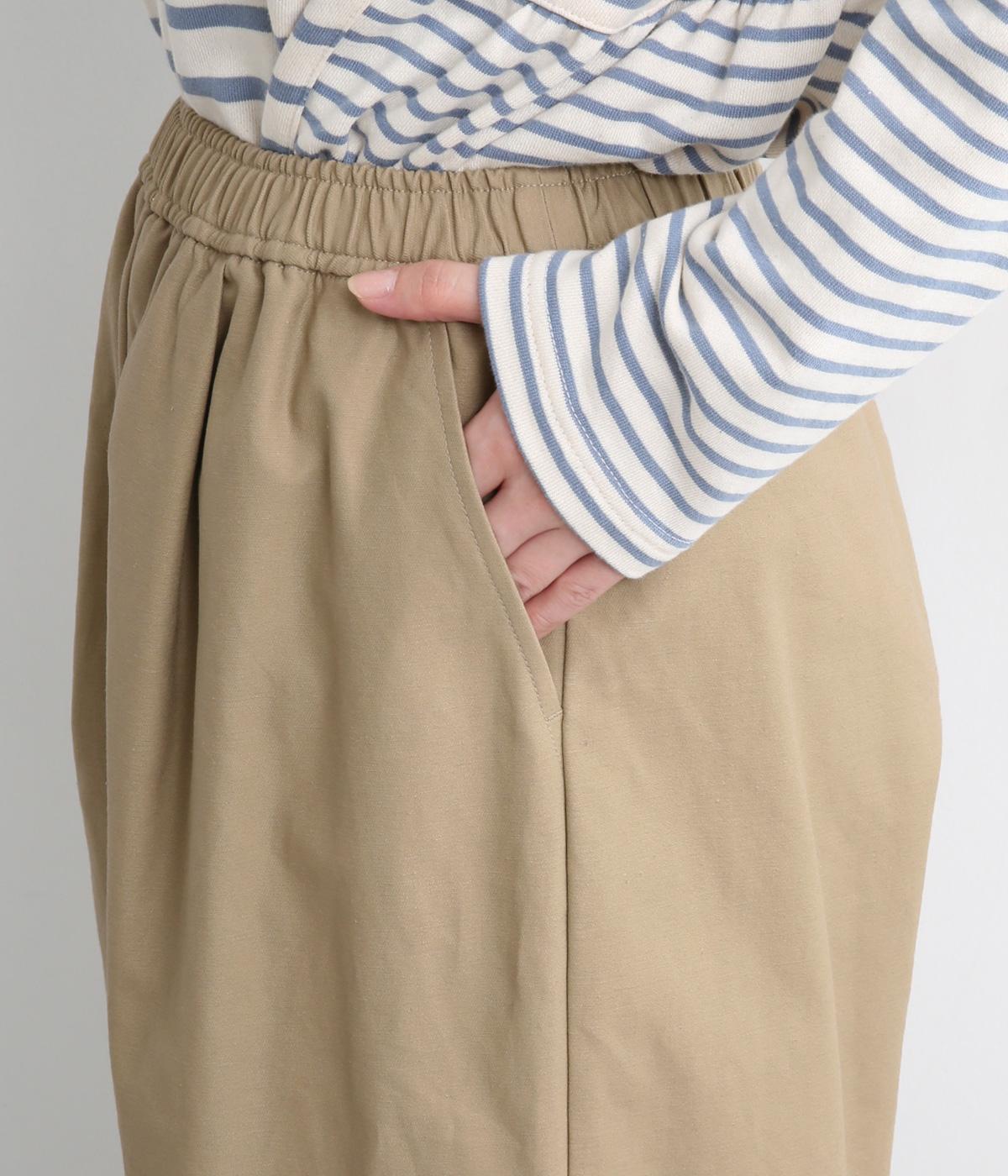 タックを入れてゆとりを持たせたワイドパンツ。適度なハリとふくらみのある生地感で、ボリュームのわりにすっきりとした印象に。ウエストはフィット感のある総平ゴムに微調整できる内紐を入れました。