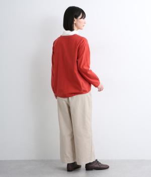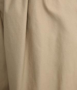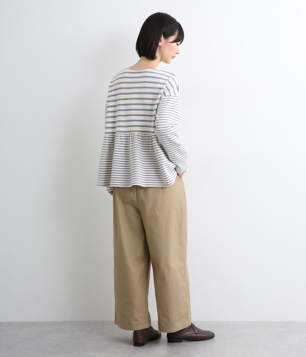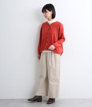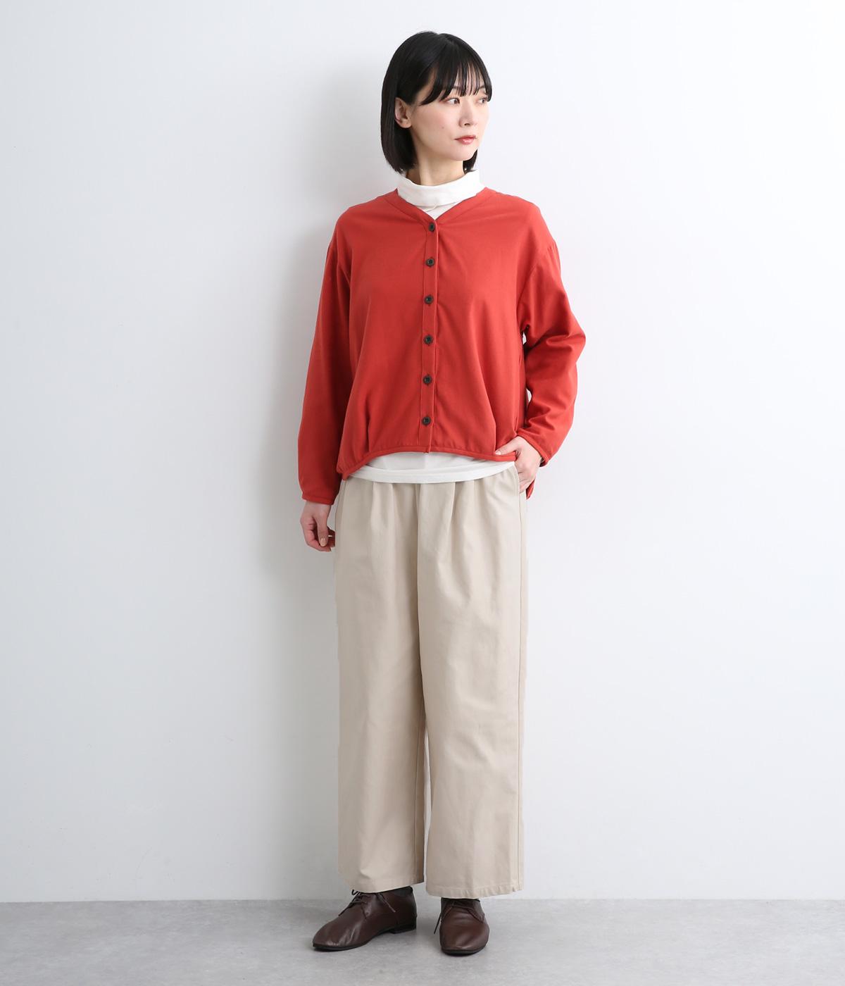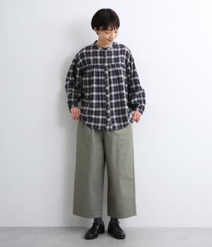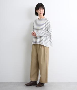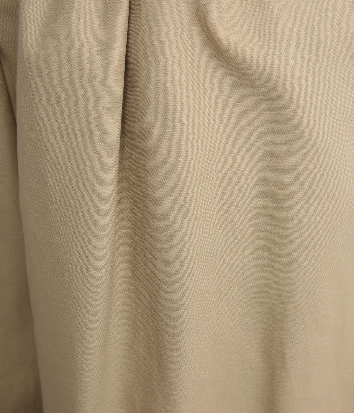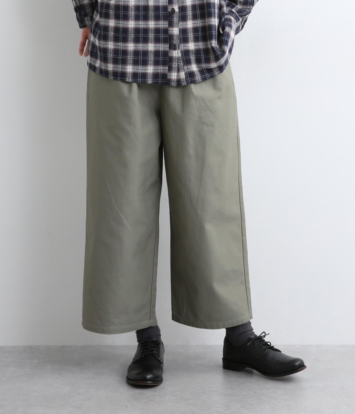 タックを入れてゆとりを持たせたワイドパンツ。適度なハリとふくらみのある生地感で、ボリュームのわりにすっきりとした印象に。ウエストはフィット感のある総平ゴムに微調整できる内紐を入れました。