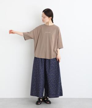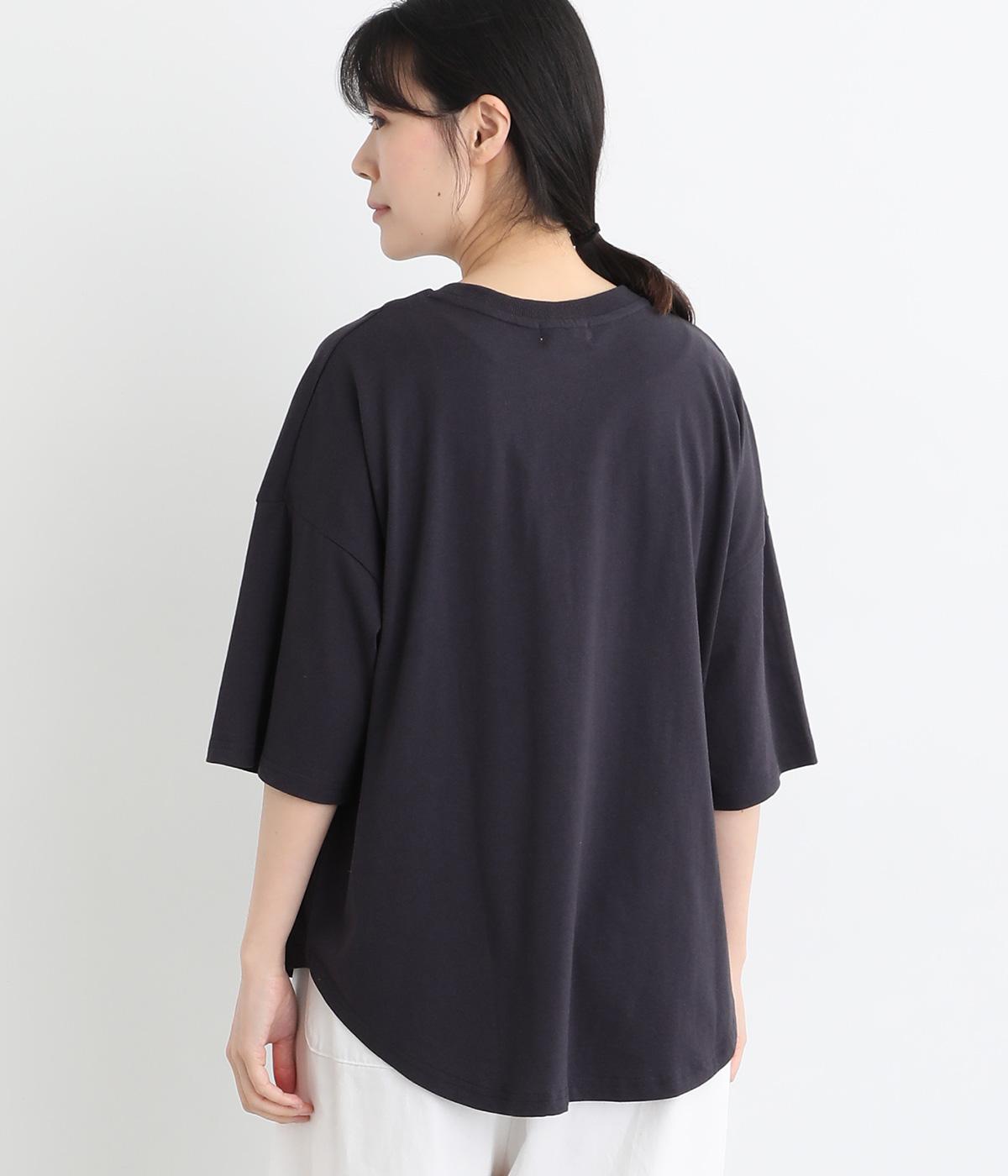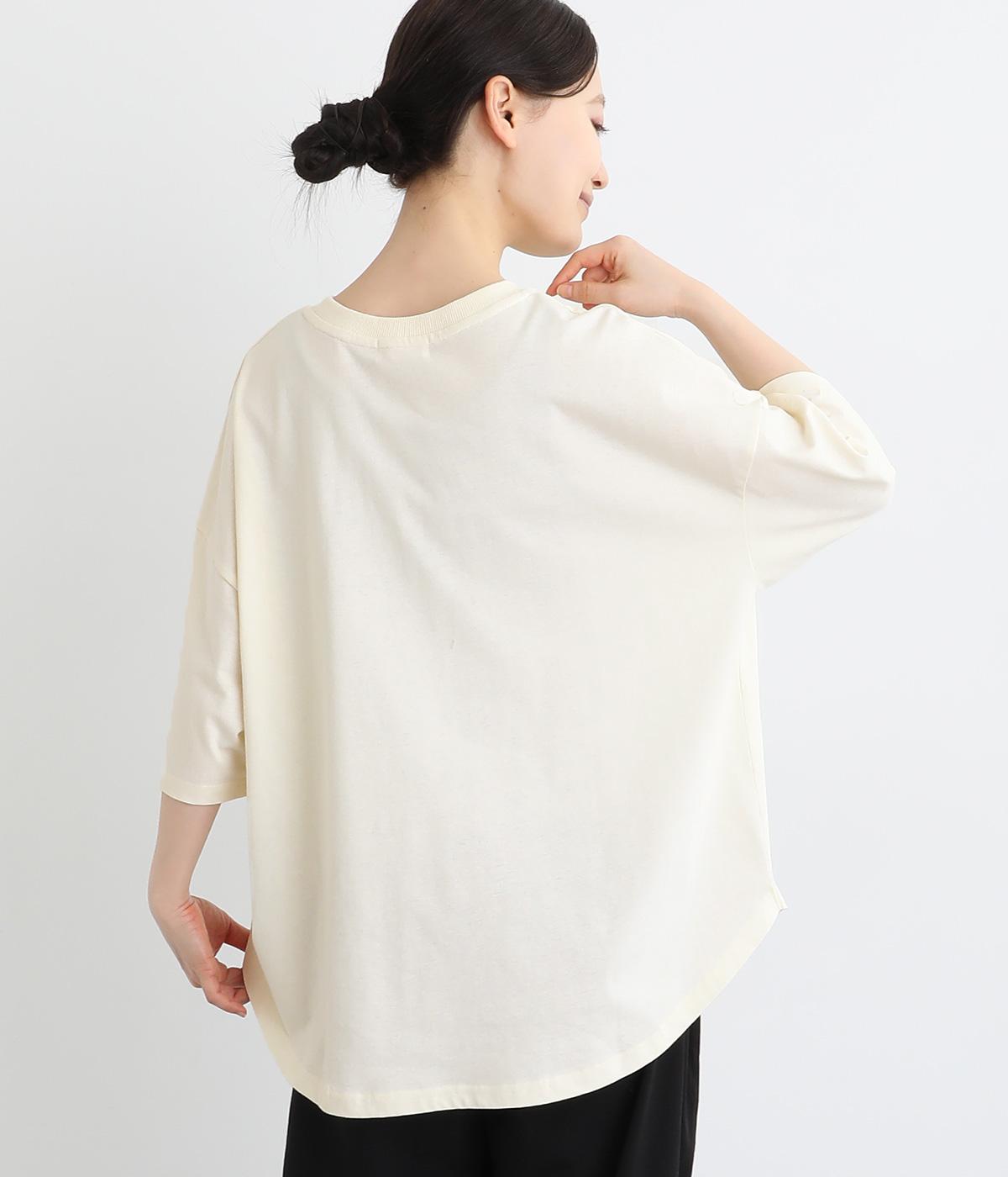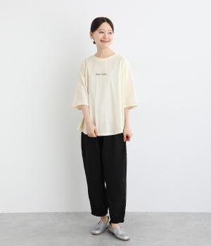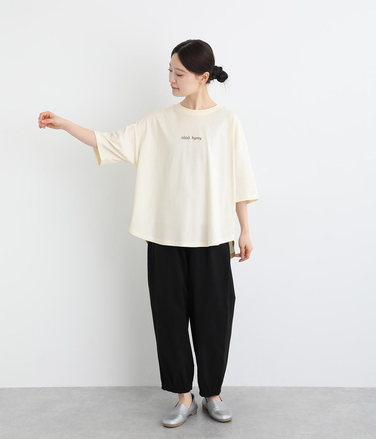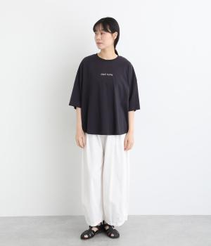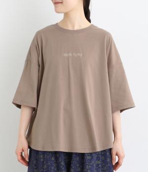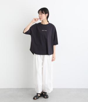 フロントのロゴ刺しゅうがアクセントになったTシャツ。ワイドシルエットと六分袖でゆるっとカジュアルに着られます。裾は丸みのあるカッティングで、トップスインしなくてもバランスが取りやすいです。