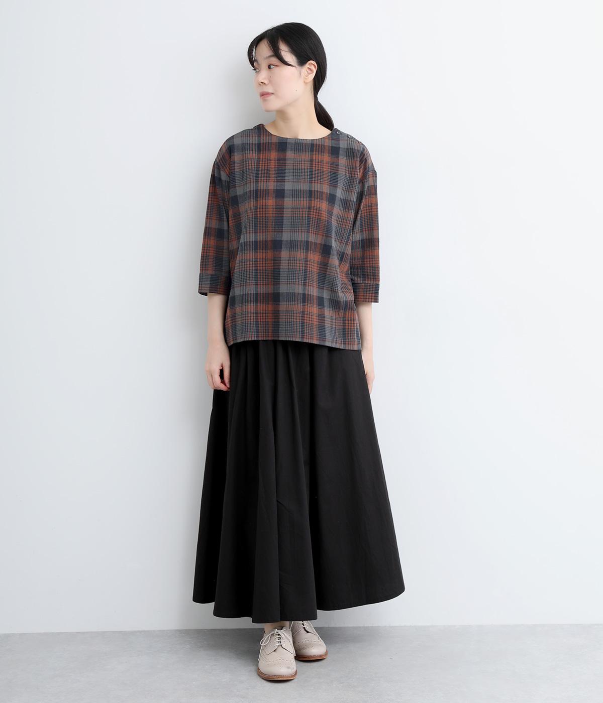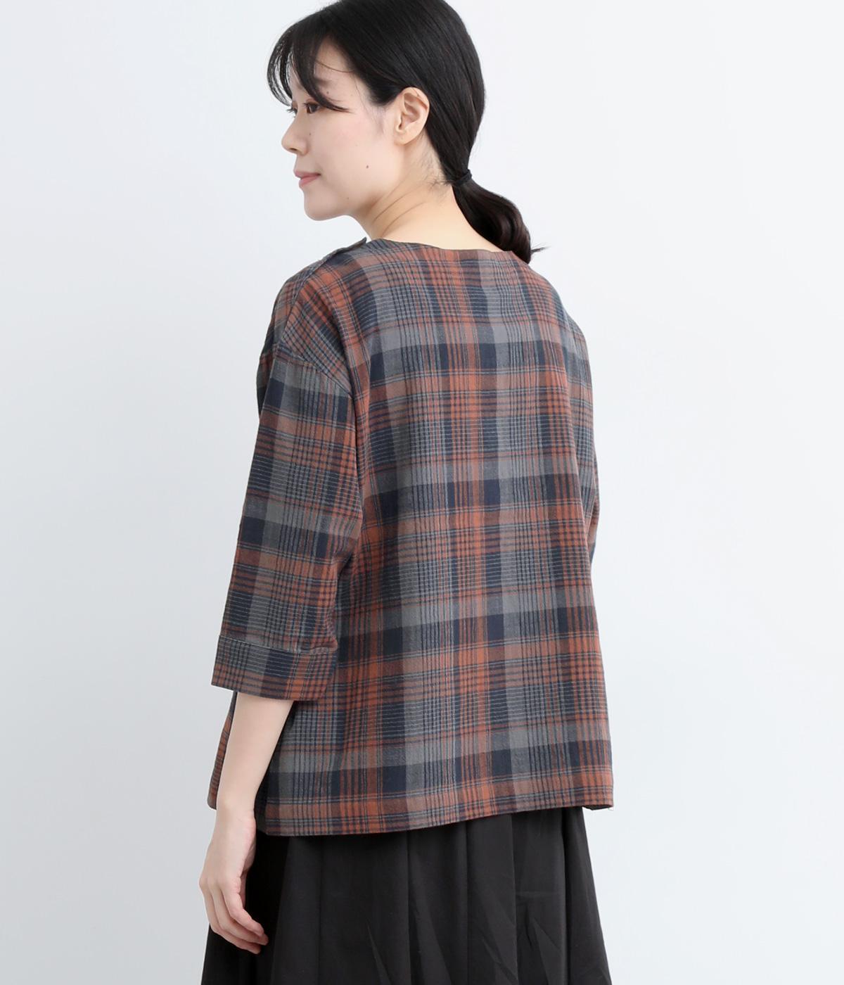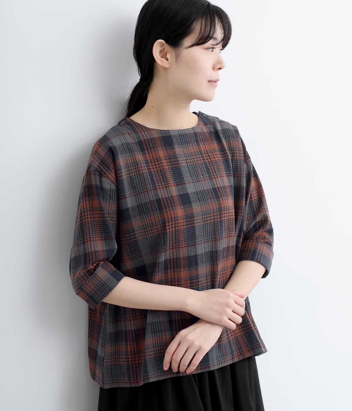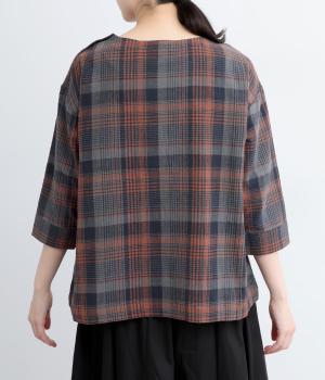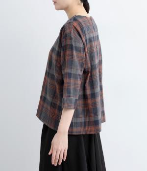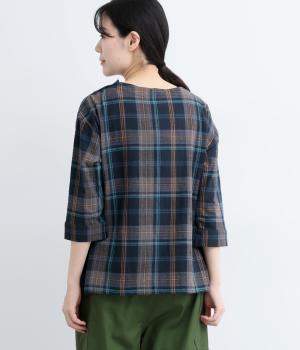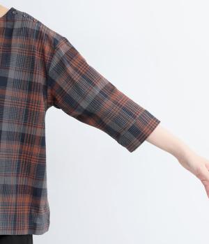 チェック柄のクラシックな雰囲気が引き立つシンプルなプルオーバーブラウス。ひじが隠れる六分袖で、着こなしのバランスがすっきりと仕上がります。スリット入りの袖口は一折してもアクセントに。デニム合わせでカジュアルに、スカート合わせでお出かけにと、幅広いシーンで活躍します。