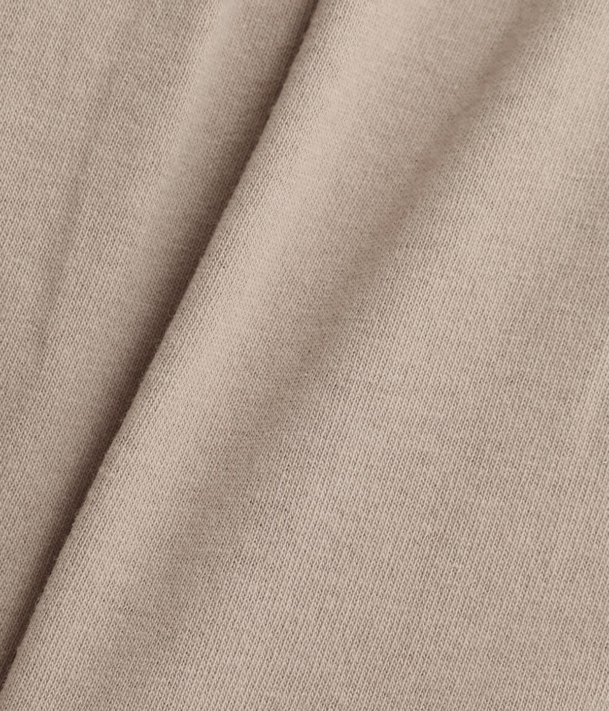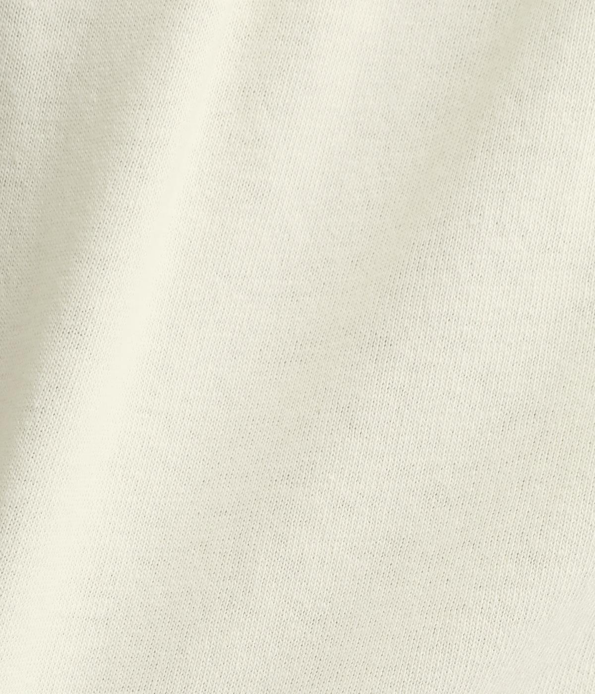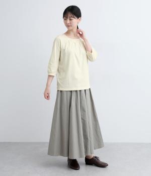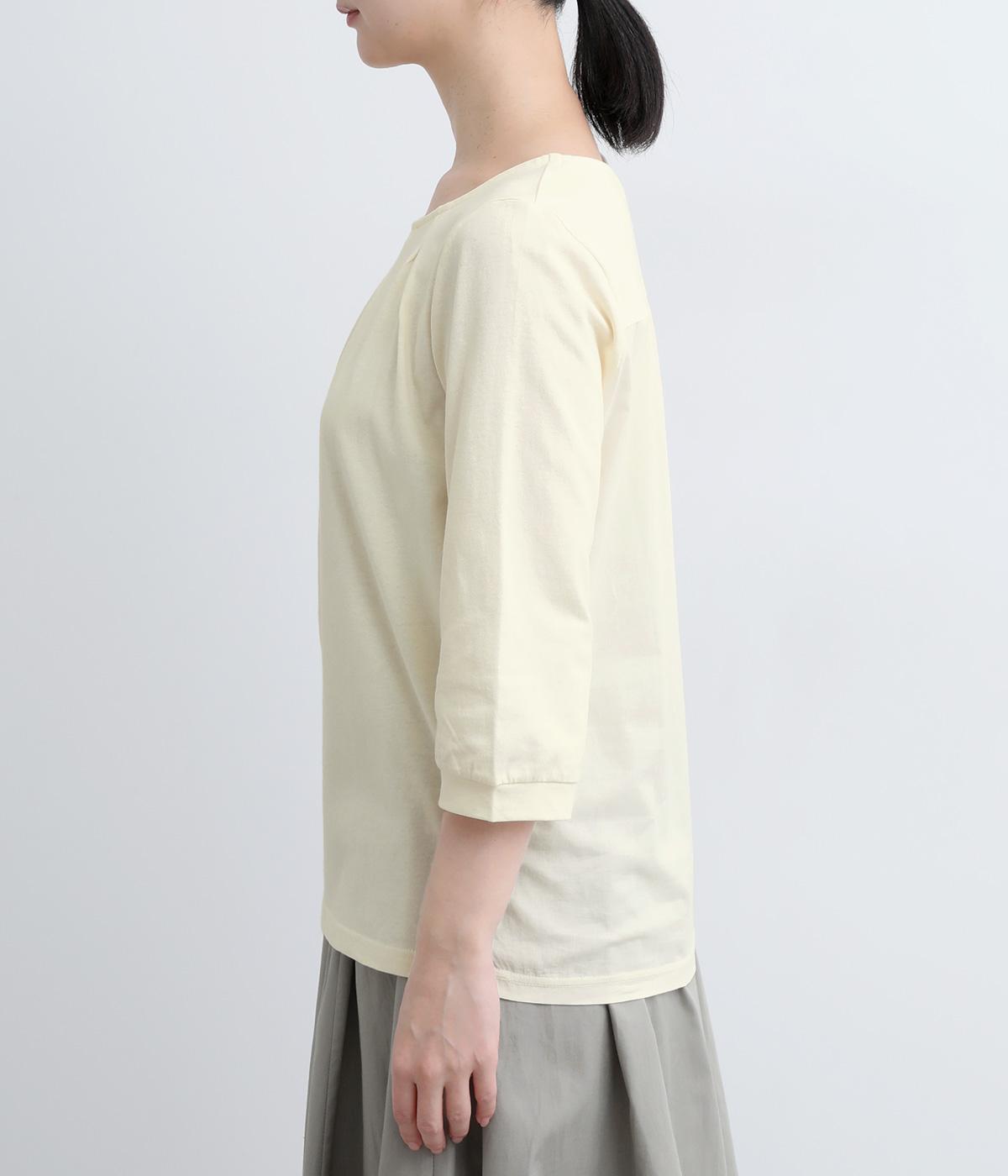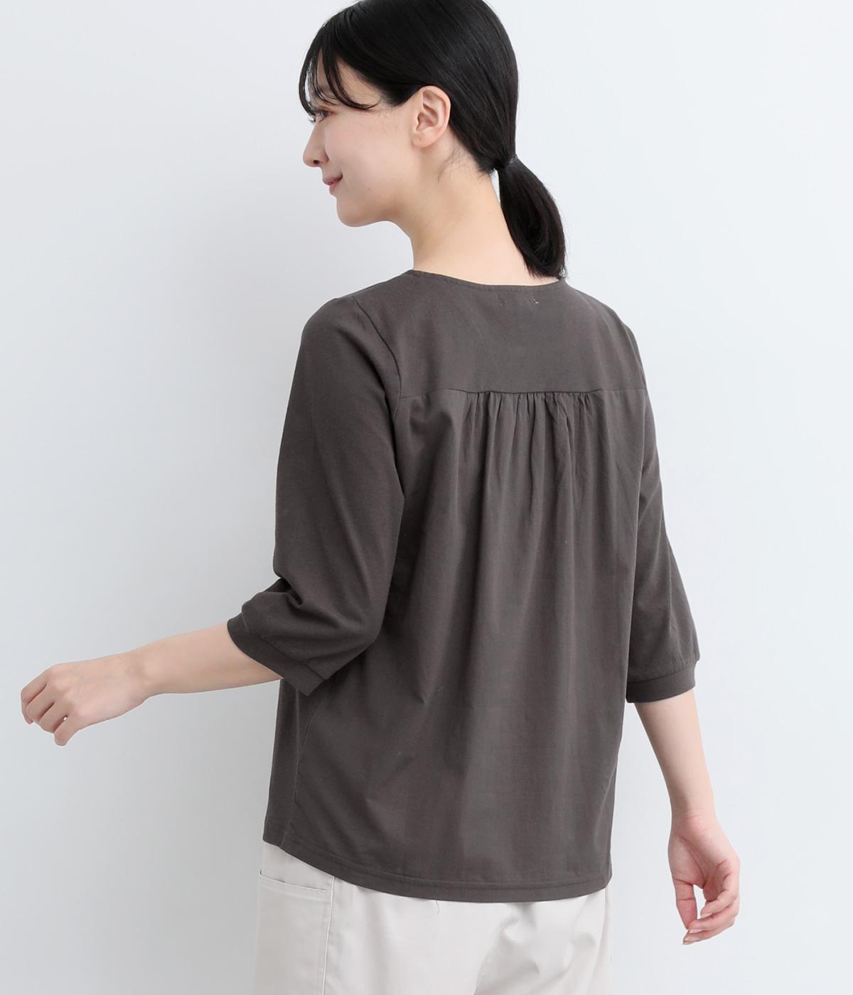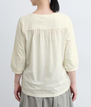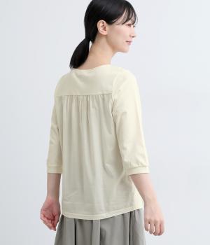 空気の流れで撚りをかけて作られた、空紡糸で編まれた天竺素材を使用。肌離れがよく、ドライでさらっとした風合いが特徴です。後ろ身頃に使った布帛の切り替えもポイント。