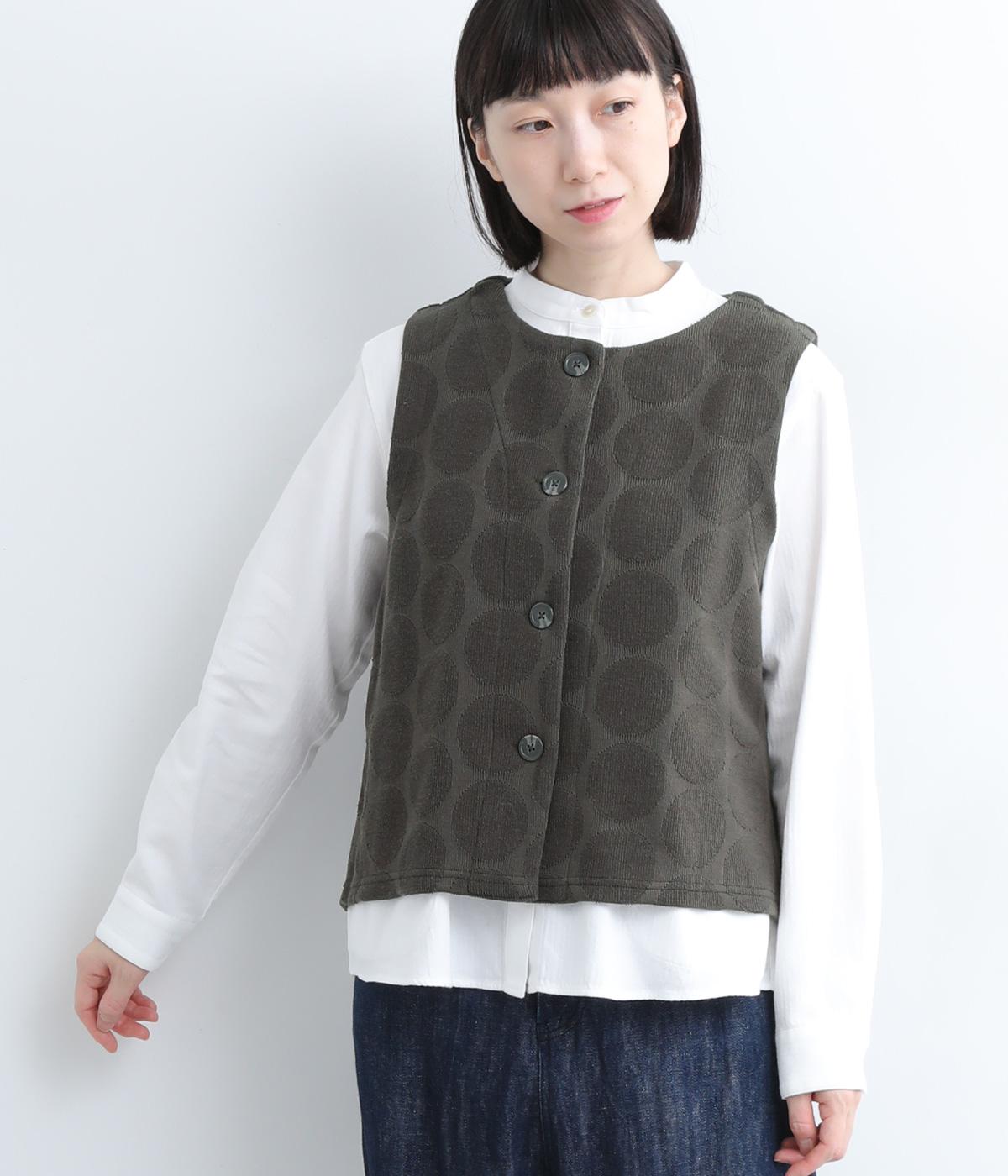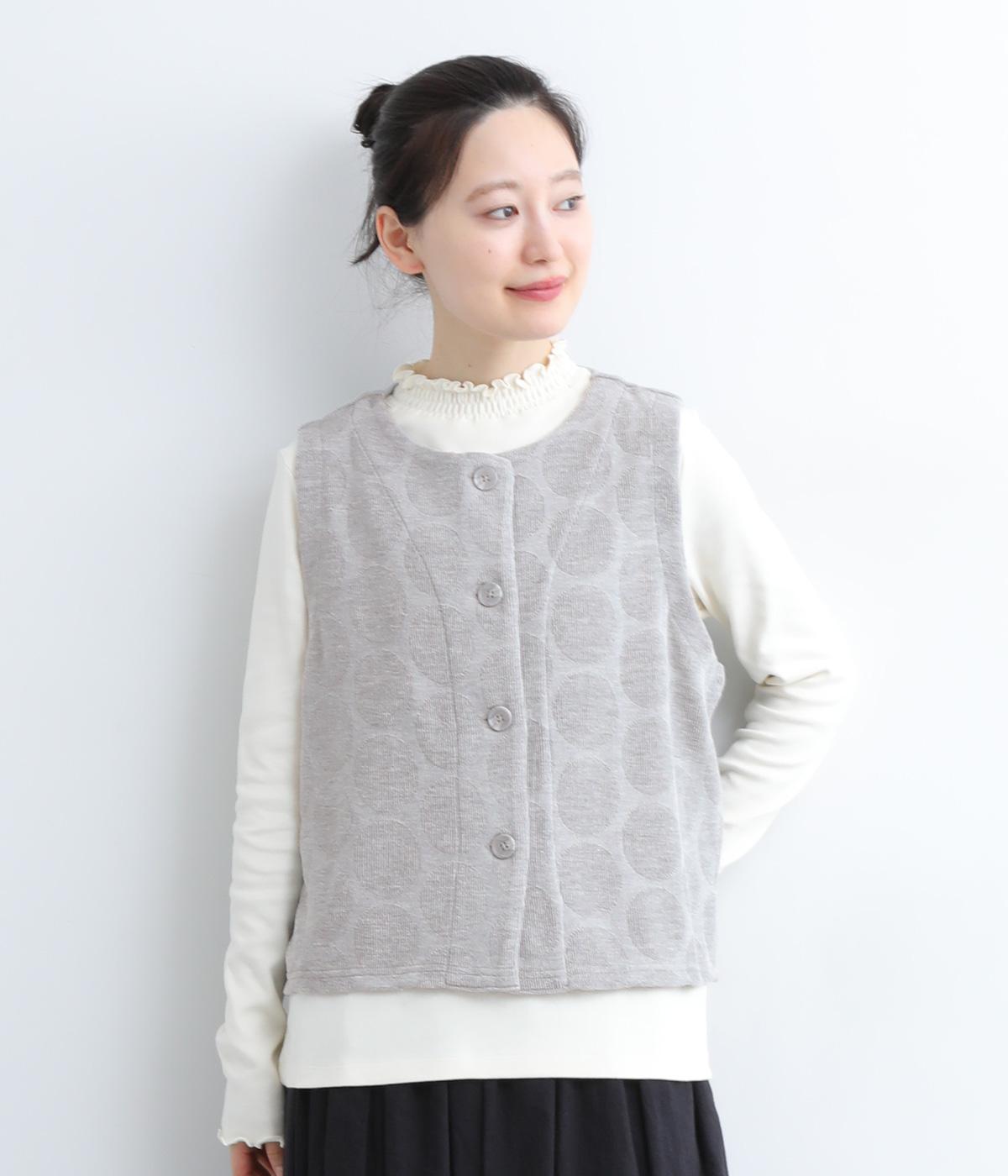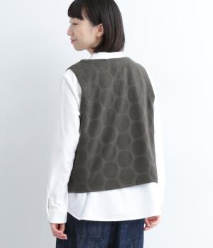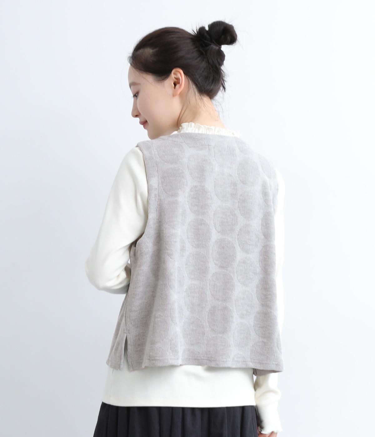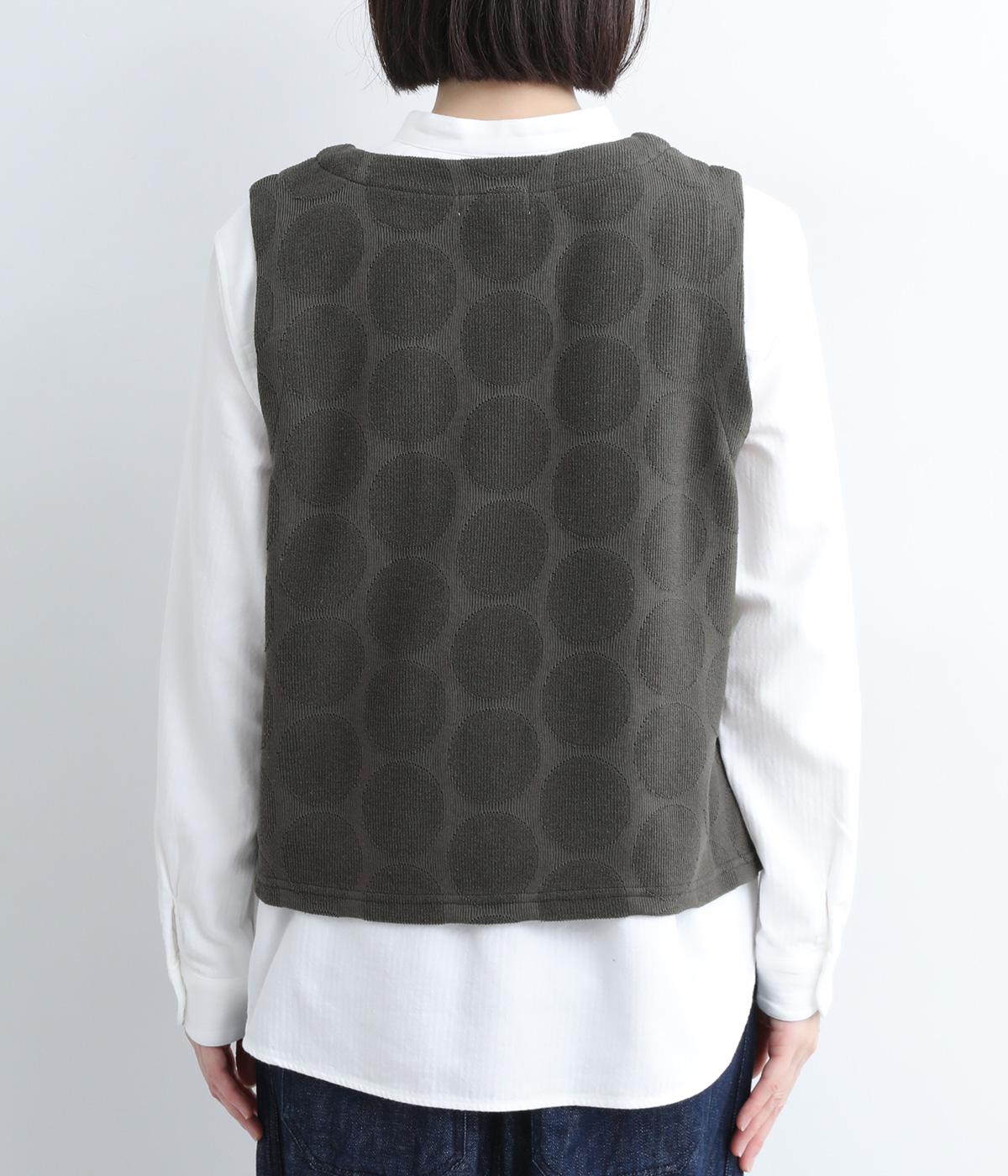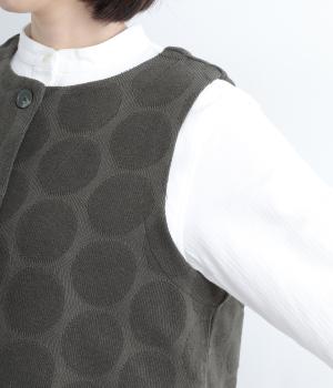 ドット柄でポイントを持たせつつも着こなしやすいジャカード織ベスト。ベーシックなボックス型でカジュアルテイストにまとめた、デイリー使いしやすい仕上がり。サイドスリット入りでワンピースなどにも合わせやすくなっています。