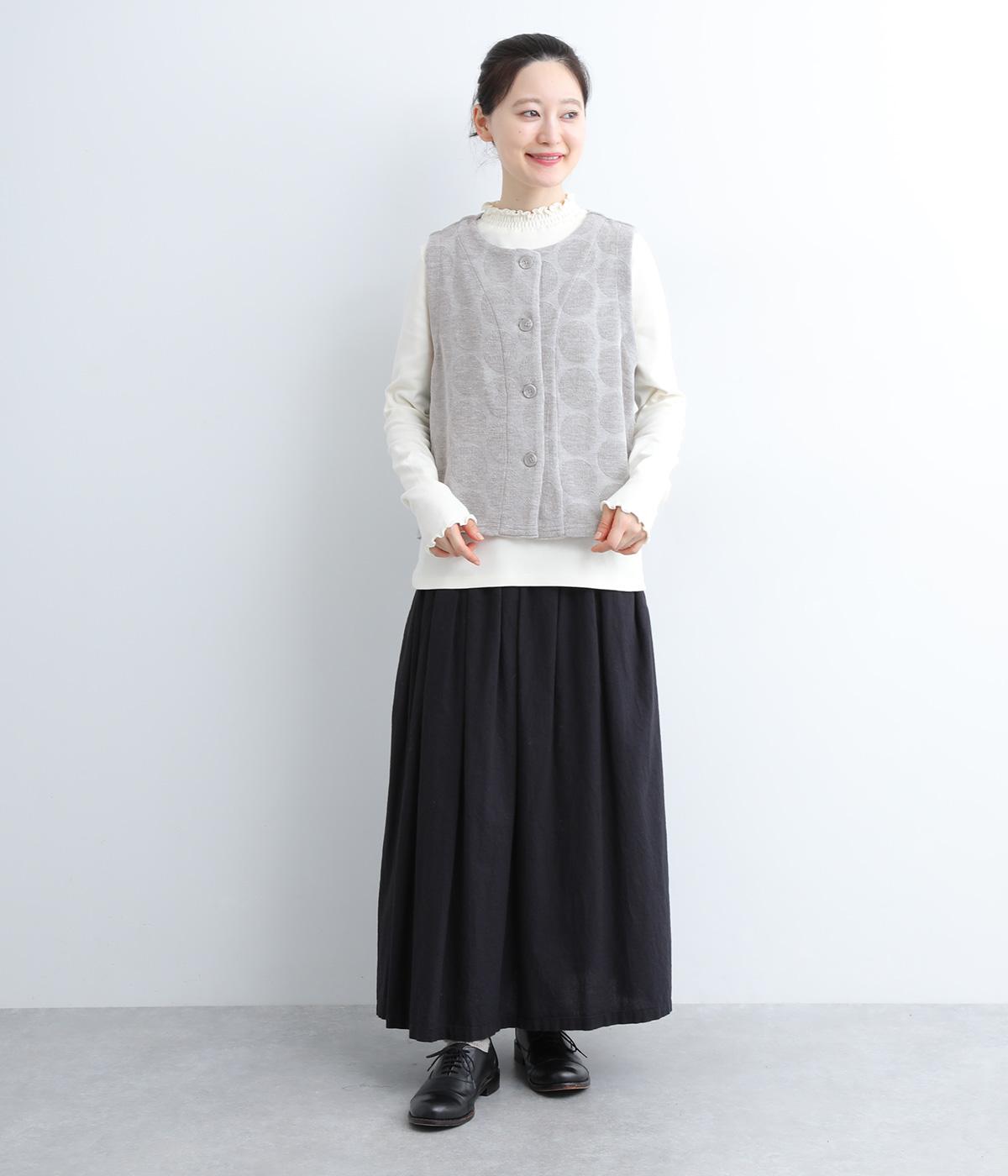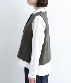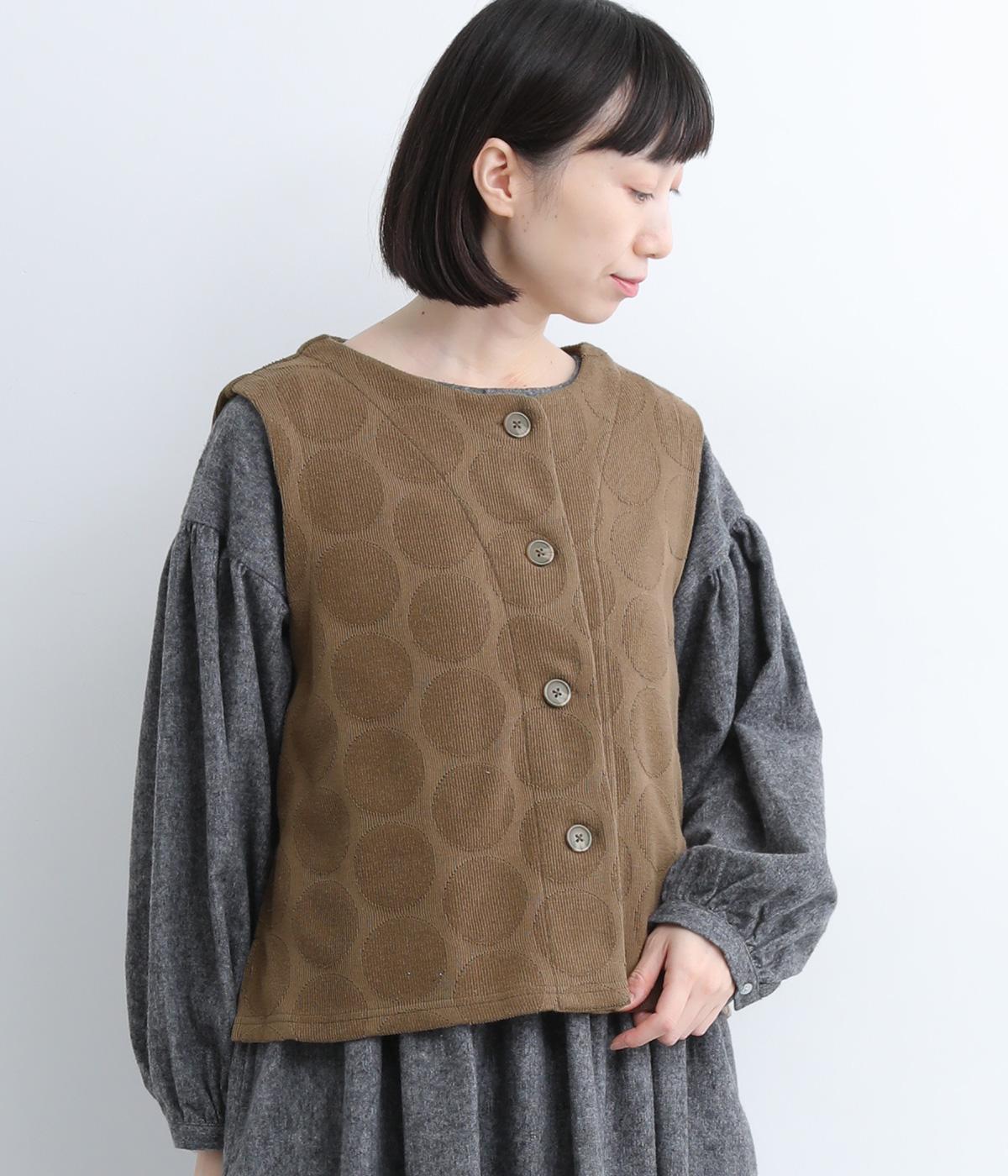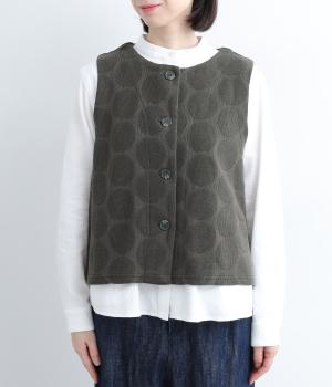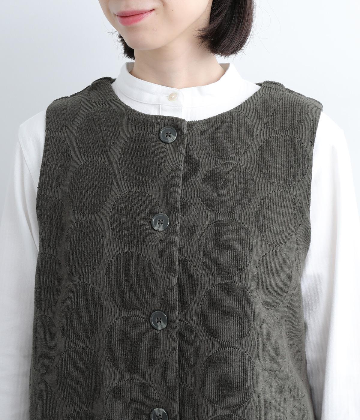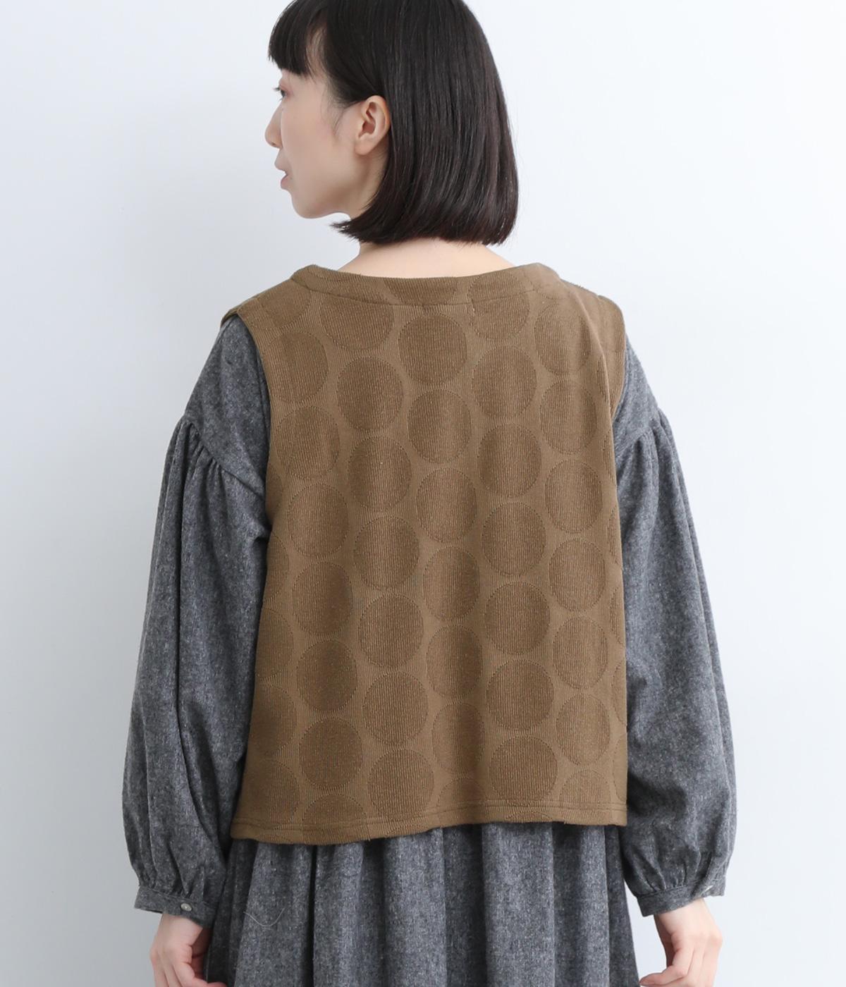 ドット柄でポイントを持たせつつも着こなしやすいジャカード織ベスト。ベーシックなボックス型でカジュアルテイストにまとめた、デイリー使いしやすい仕上がり。サイドスリット入りでワンピースなどにも合わせやすくなっています。