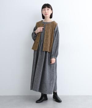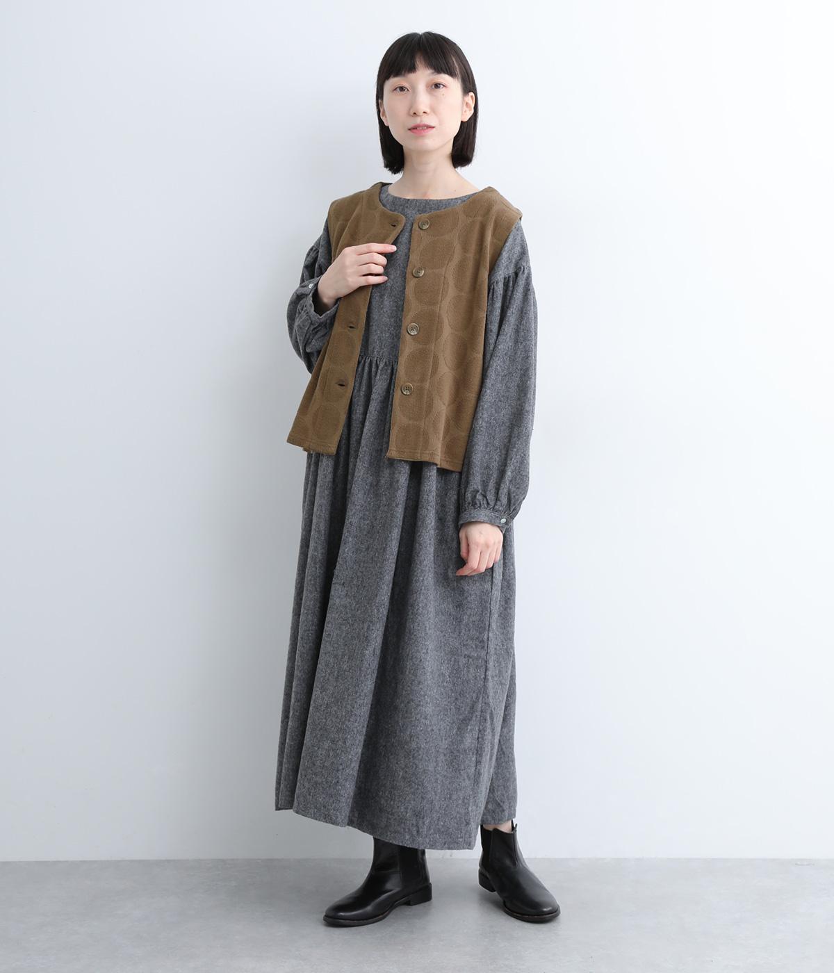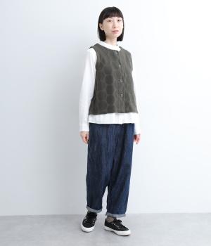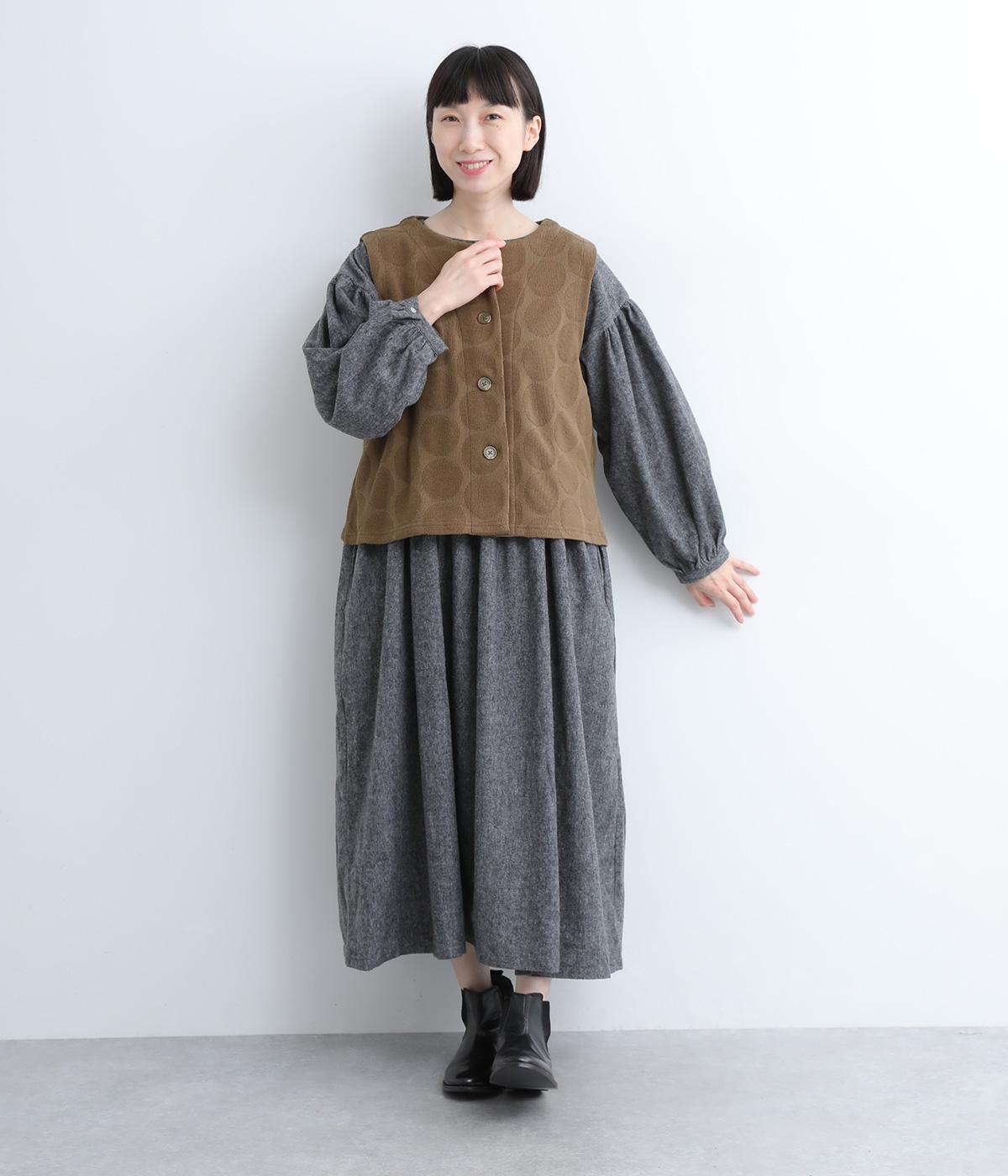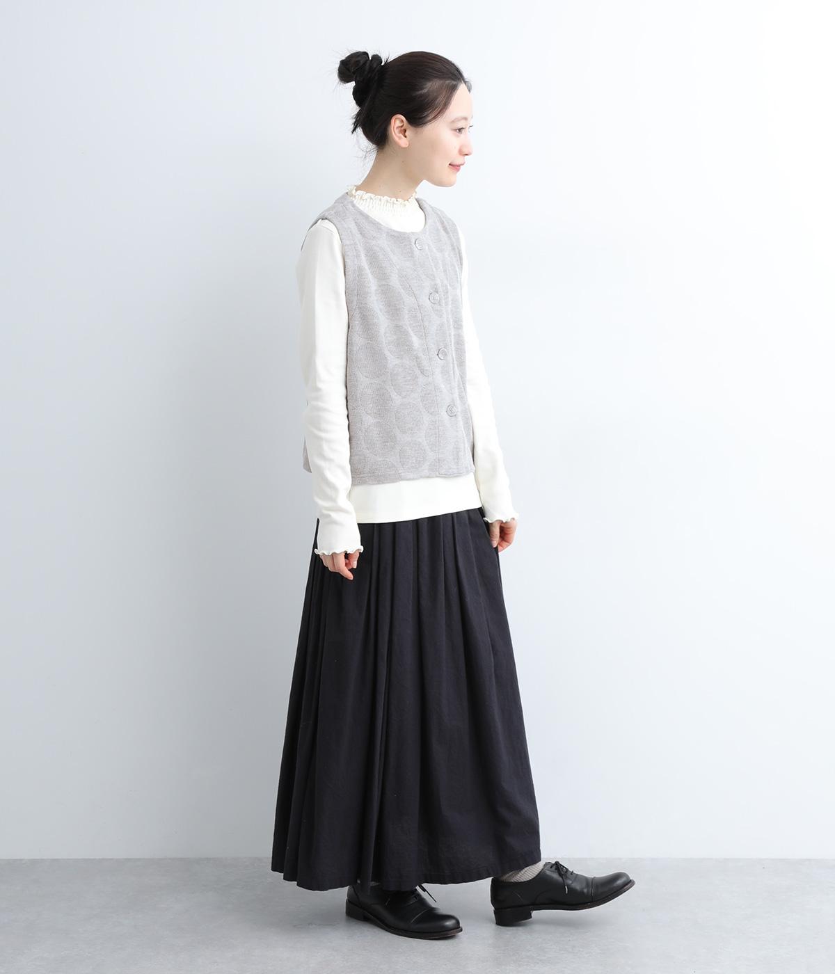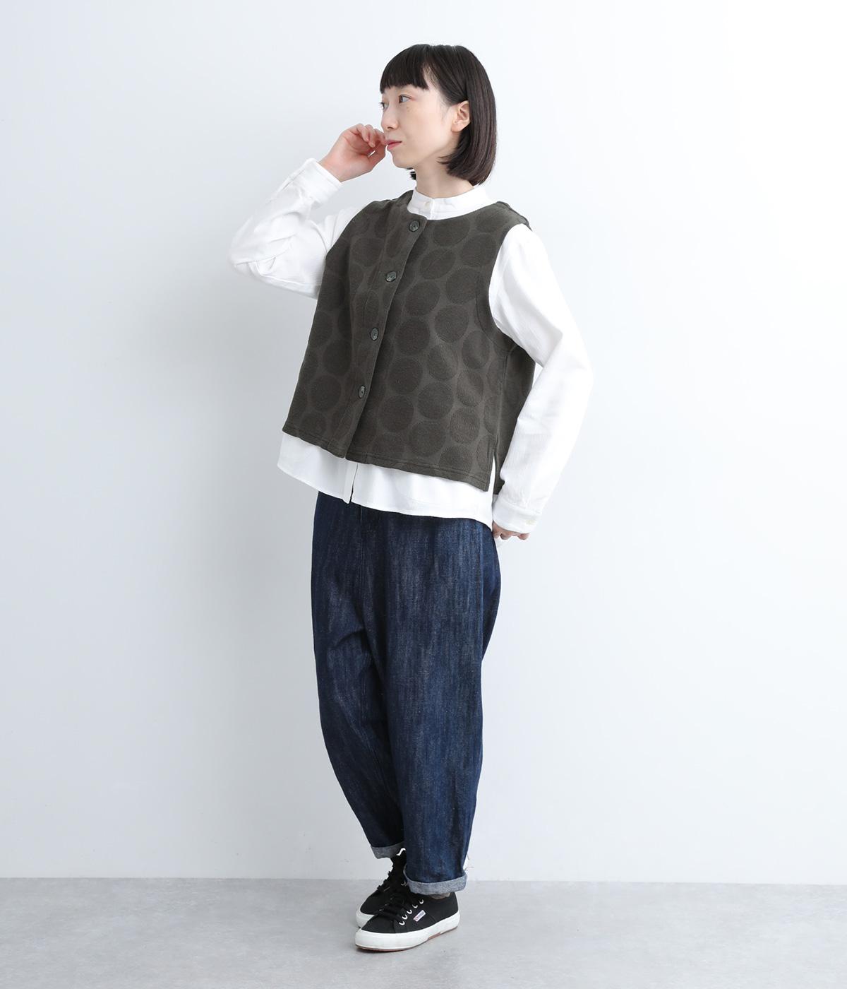 ドット柄でポイントを持たせつつも着こなしやすいジャカード織ベスト。ベーシックなボックス型でカジュアルテイストにまとめた、デイリー使いしやすい仕上がり。サイドスリット入りでワンピースなどにも合わせやすくなっています。