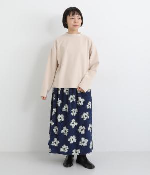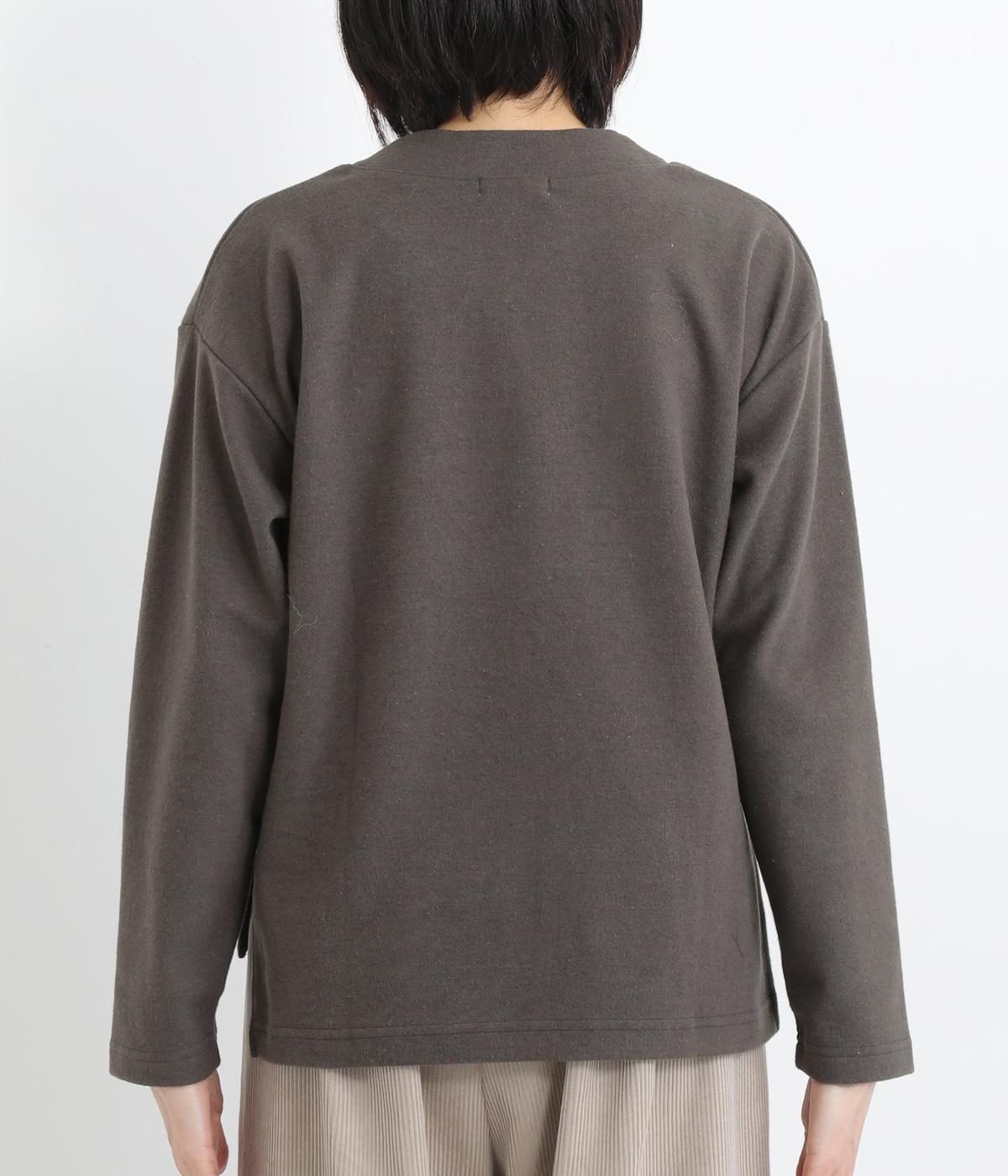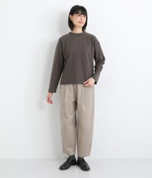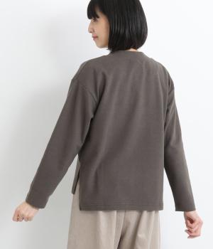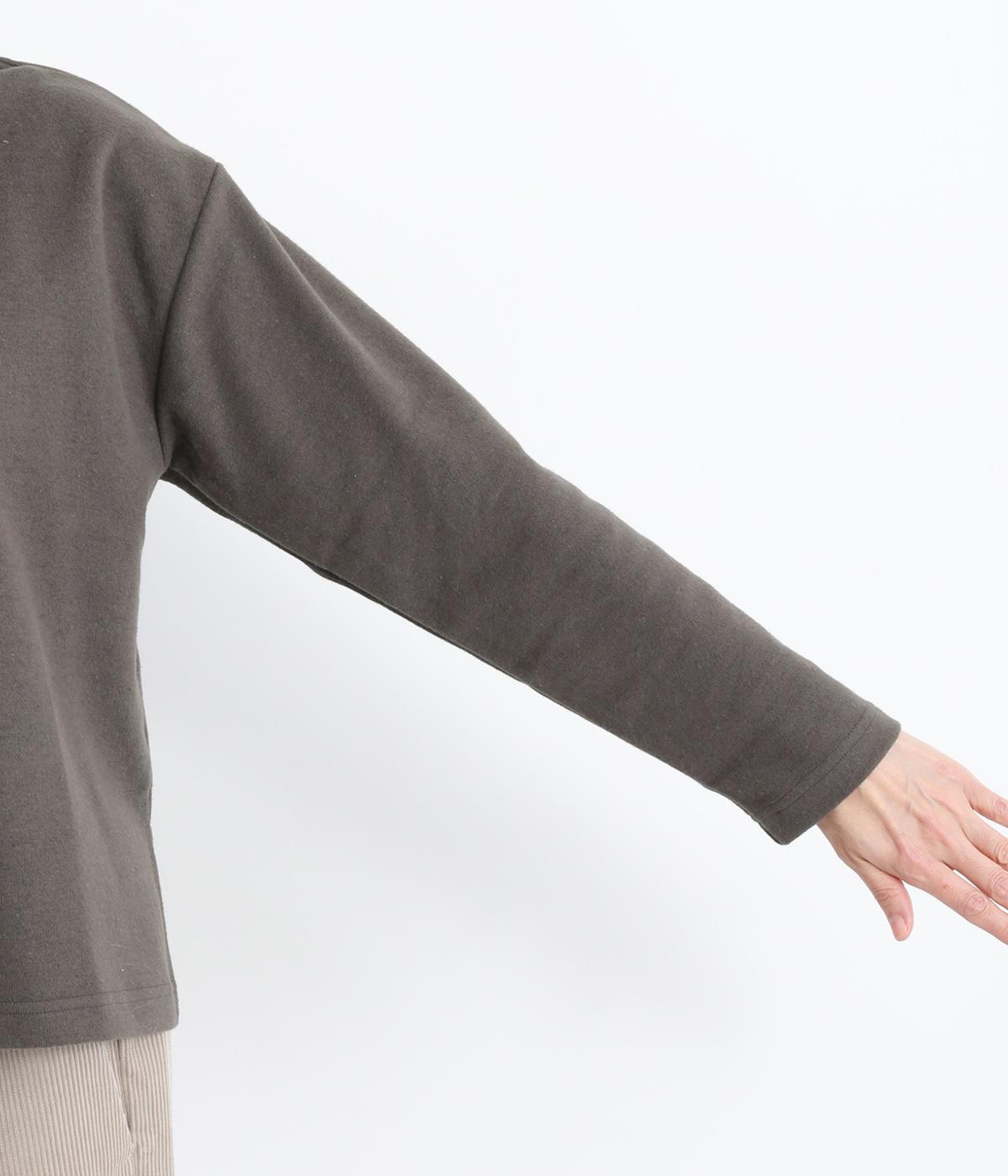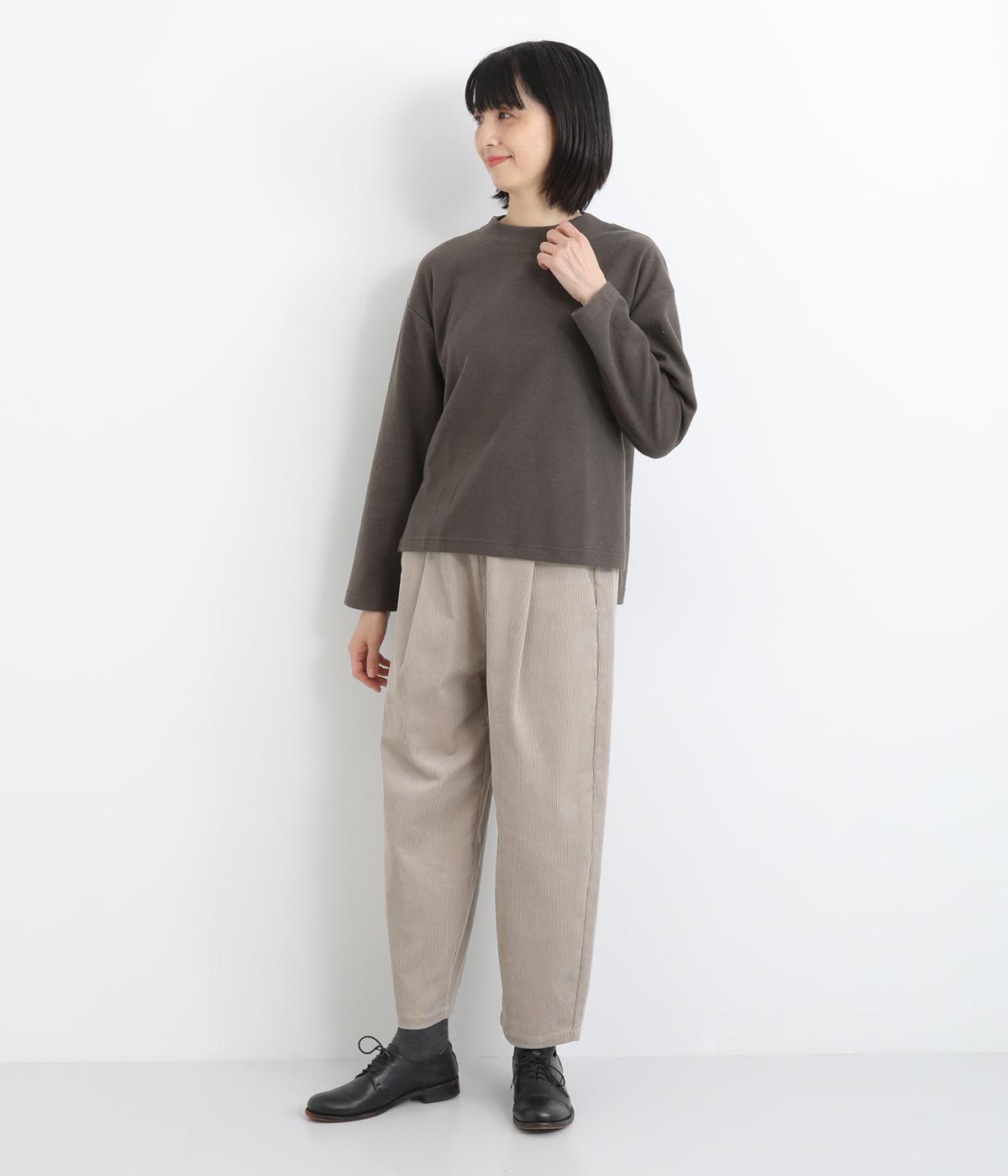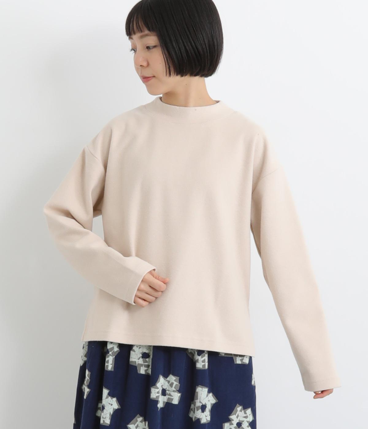 素材の持つあたたかみと表情を活かした、シンプルな長袖プルオーバーです。モックネックで防寒性と顔まわりのニュアンスを追加。裾は前後差をつけたスリット入りでボトム合わせしやすく、横姿もすっきりきれいに見えます。