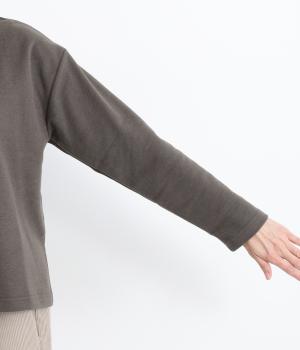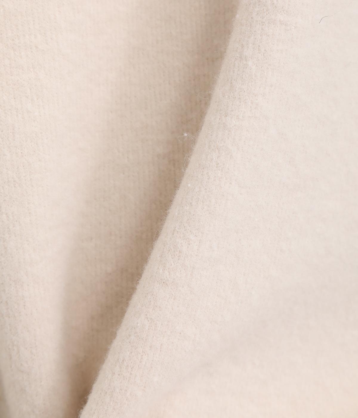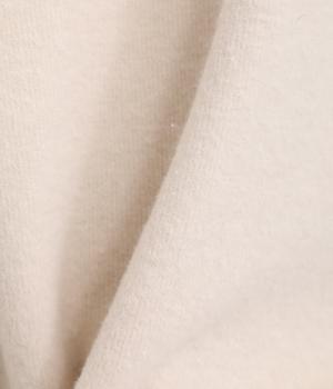 レーヨンのなめらかな肌触りとポリエステルの適度な軽さを併せ持った混紡素材を使用。やわらかで伸びも良く、表起毛でふんわりとやさしい表情に仕上がっています。