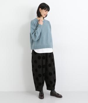 もっちりとやわらかく、伸縮性も抜群で着心地のいいニットを使用しています。ポリエステルをベースにしているのであたたかみがありながらも軽やか。ディテールにカットソー生地を配しています。