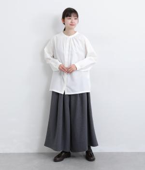 首元と袖口にほどこしたギャザーや背中のラウンドヨークが女性らしい印象を与えるシャツです。サイドスリットがさりげない抜け感を添え、ゆとりのある身幅でリラックス感のある着心地です。シンプルで飽きのこない一枚です。
