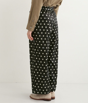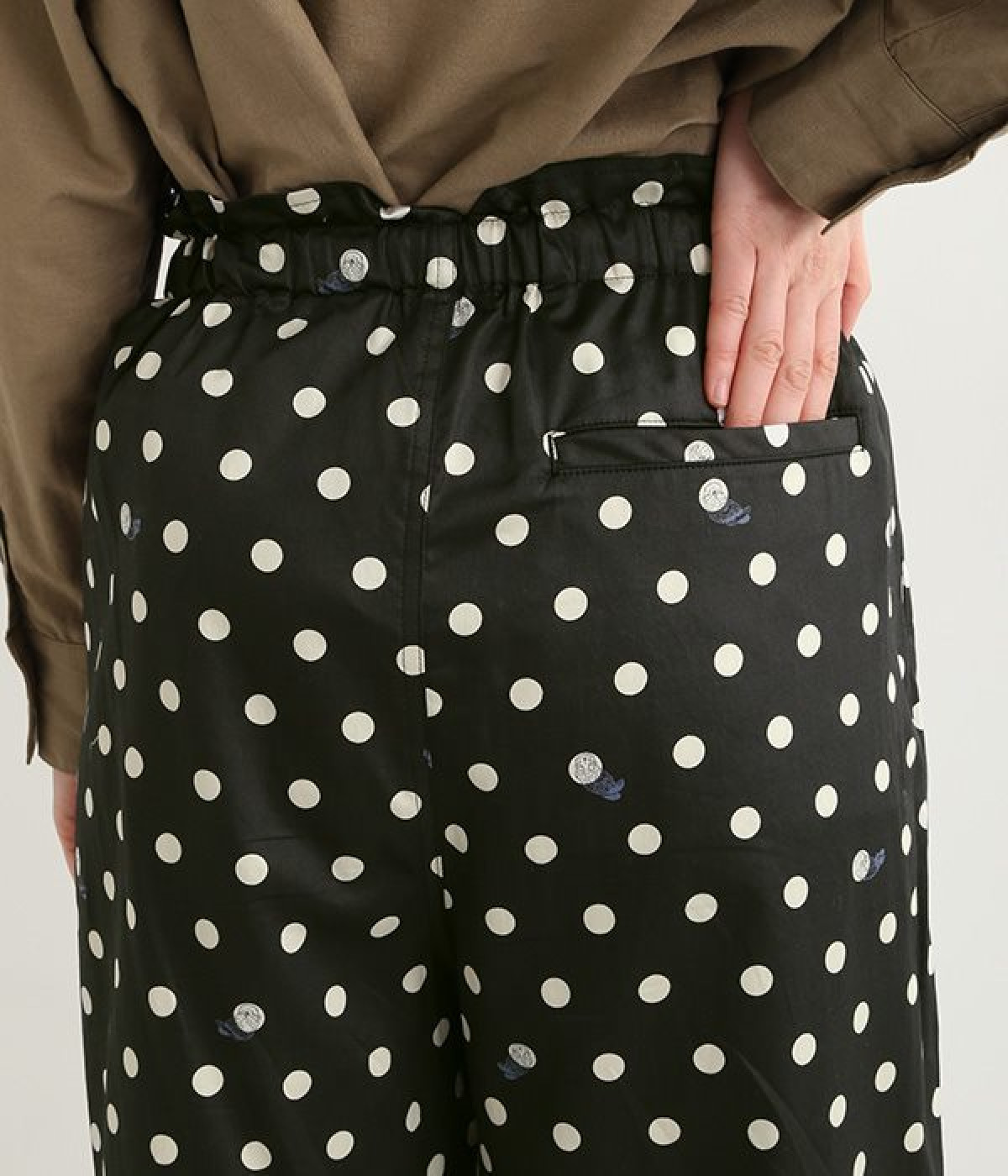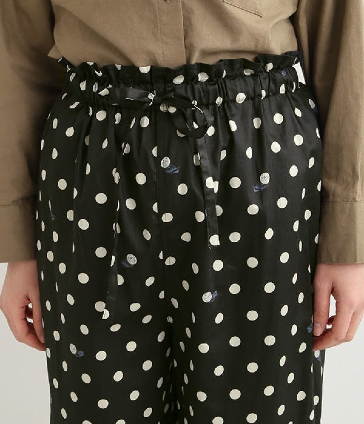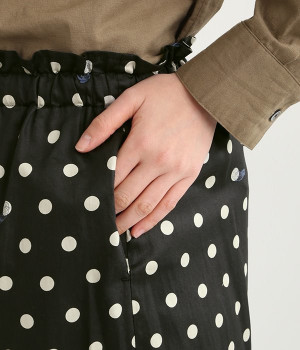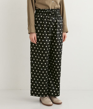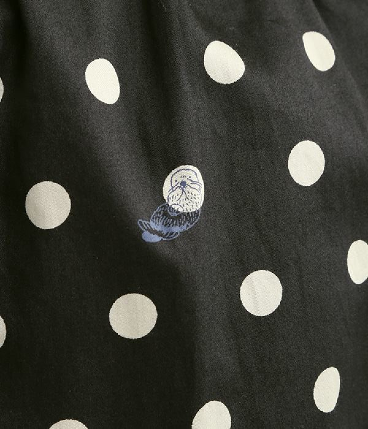 水玉の上にラッコがちょこんと顔を出している姿が愛らしいプリント柄パンツです。つやのある綿サテンを使用しているので、カジュアルになりすぎず、上品な印象にも見せてくれます。ウエストはストレスフリーな総ゴム仕様。フロント調節紐付きなので、トップスをインしてリボンをポイントにした着こなしも素敵です。