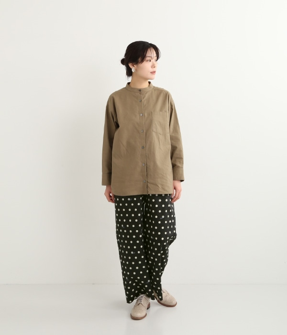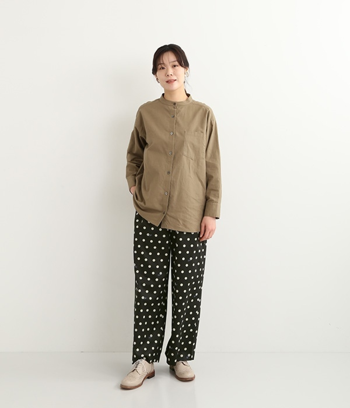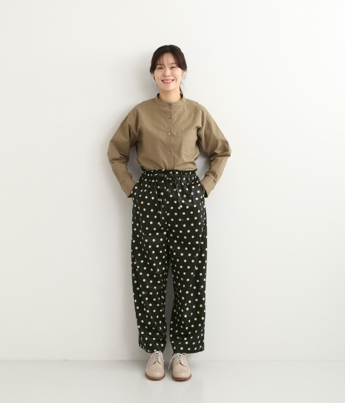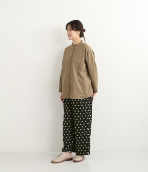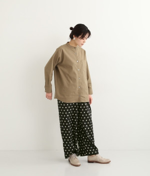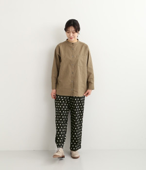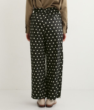 水玉の上にラッコがちょこんと顔を出している姿が愛らしいプリント柄パンツです。つやのある綿サテンを使用しているので、カジュアルになりすぎず、上品な印象にも見せてくれます。ウエストはストレスフリーな総ゴム仕様。フロント調節紐付きなので、トップスをインしてリボンをポイントにした着こなしも素敵です。