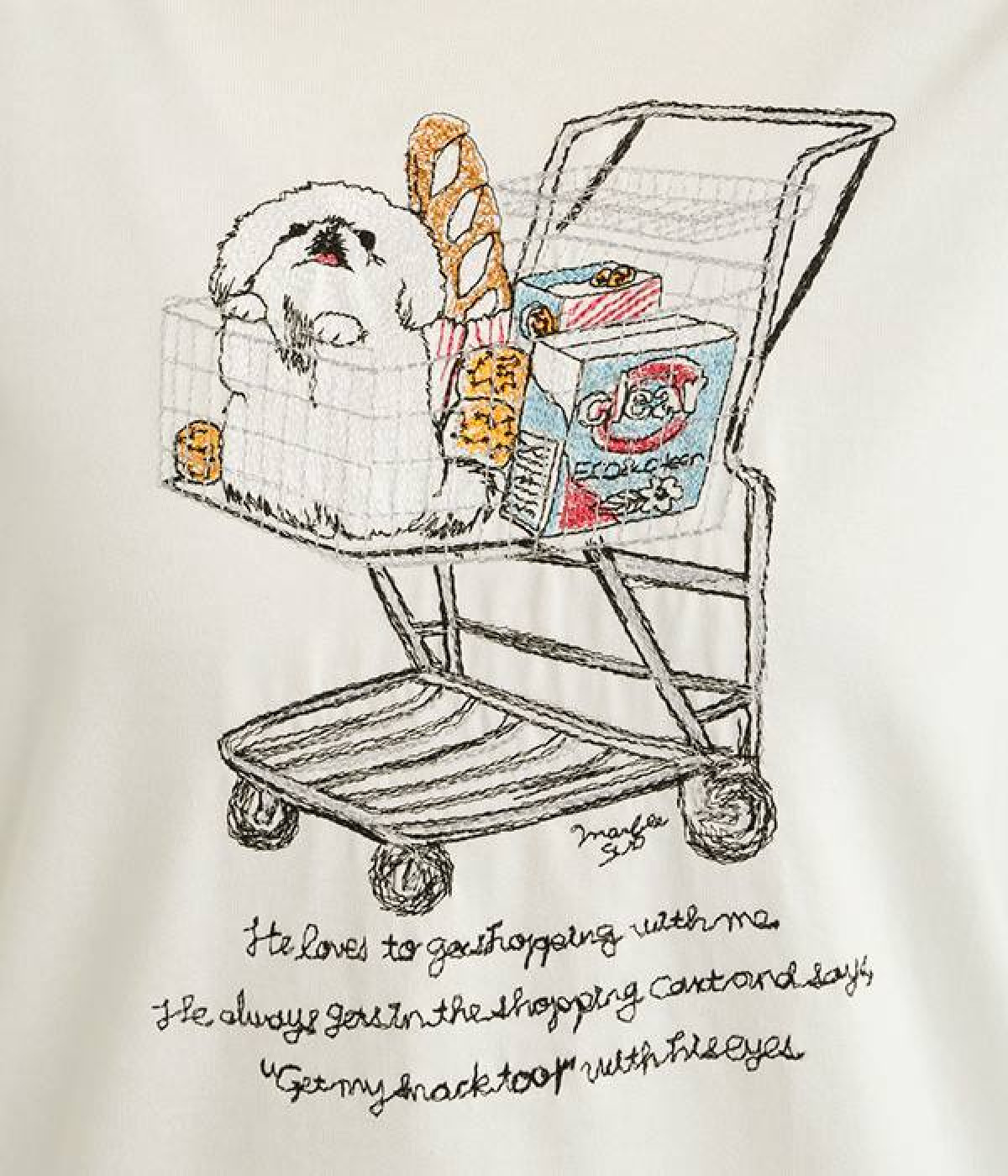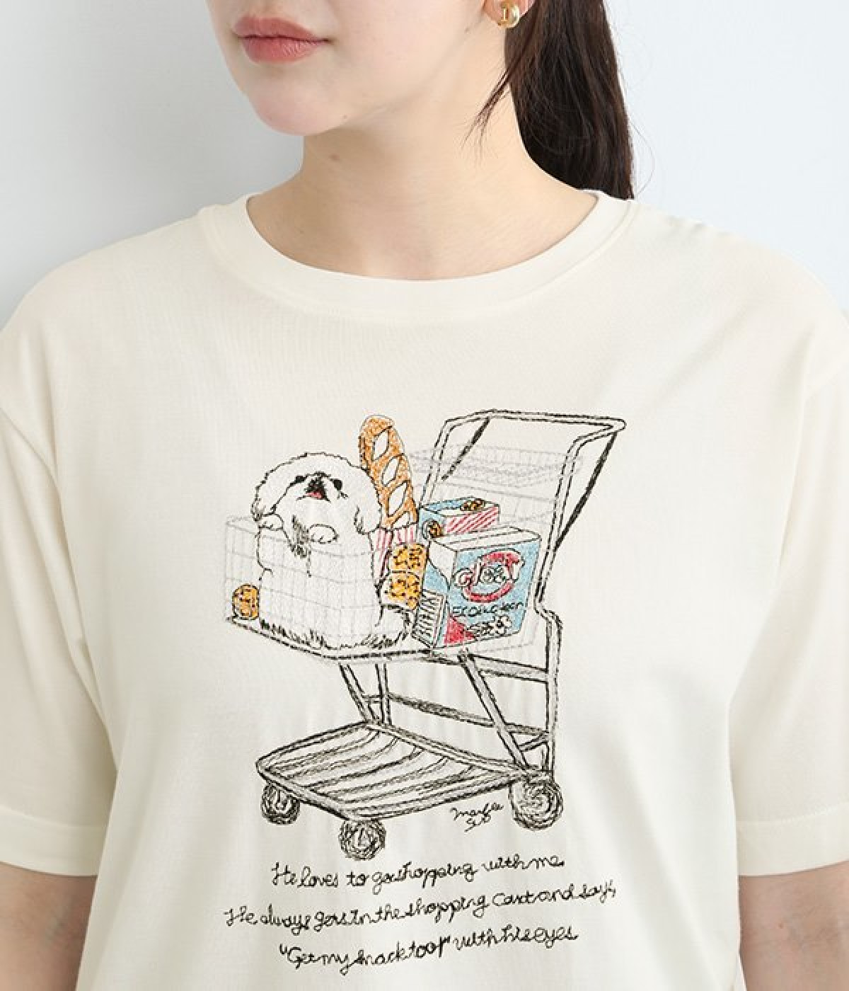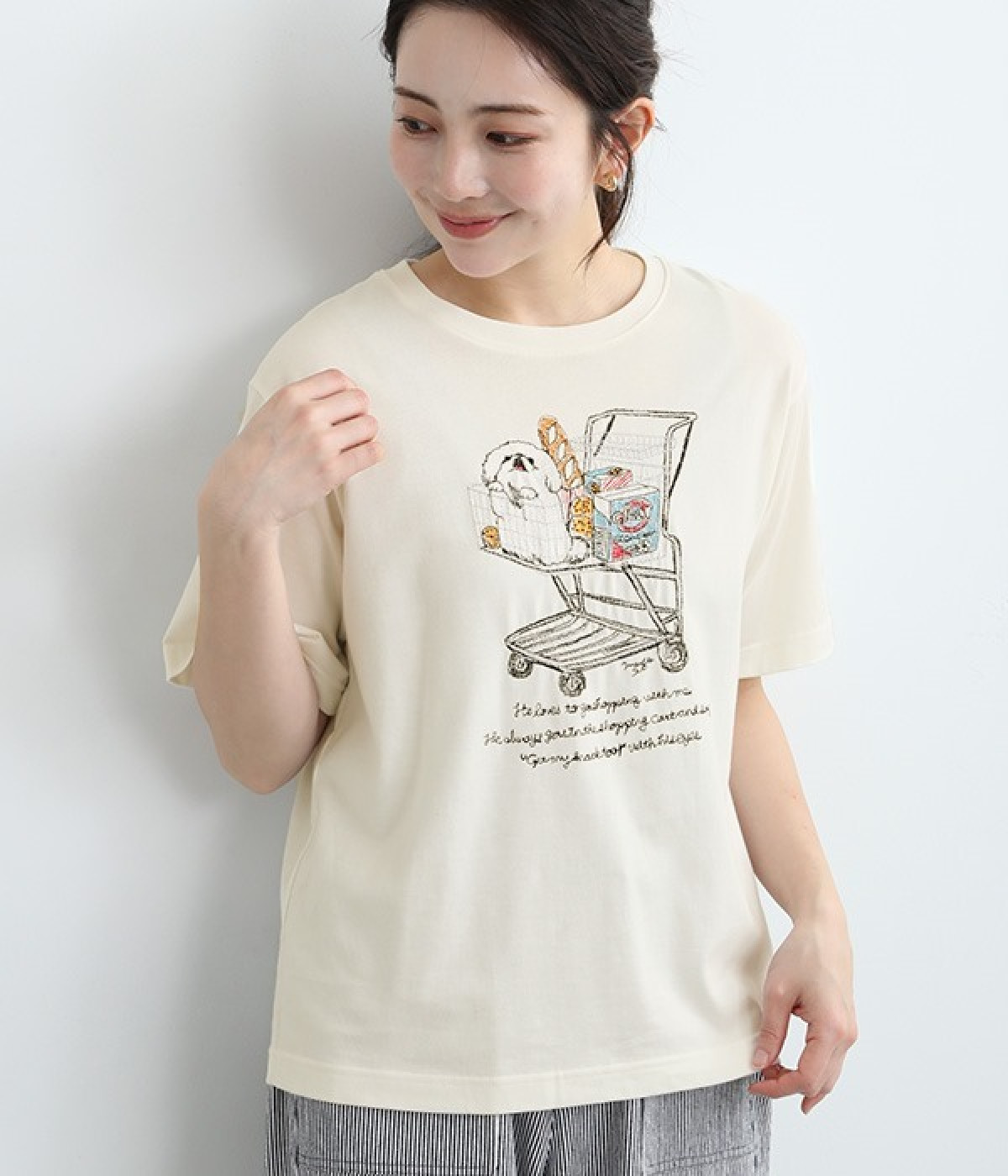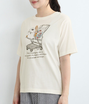 ショッピングカートに乗ったワンちゃんがなんともかわいらしいTシャツ。すべて刺しゅうで描かれている手の込んだ作りになっています。【彼は私と買い物に行くのが大好きです。彼はいつもカートに乗って、目でこう言います。「ぼくのおやつも買って!」】とのメッセージに、思わず笑みがこぼれそう。デイリー使いしやすい、伸縮性のあるコットン素材を使用しています。大人スタイルのポイントとして使いたいアイテムです。