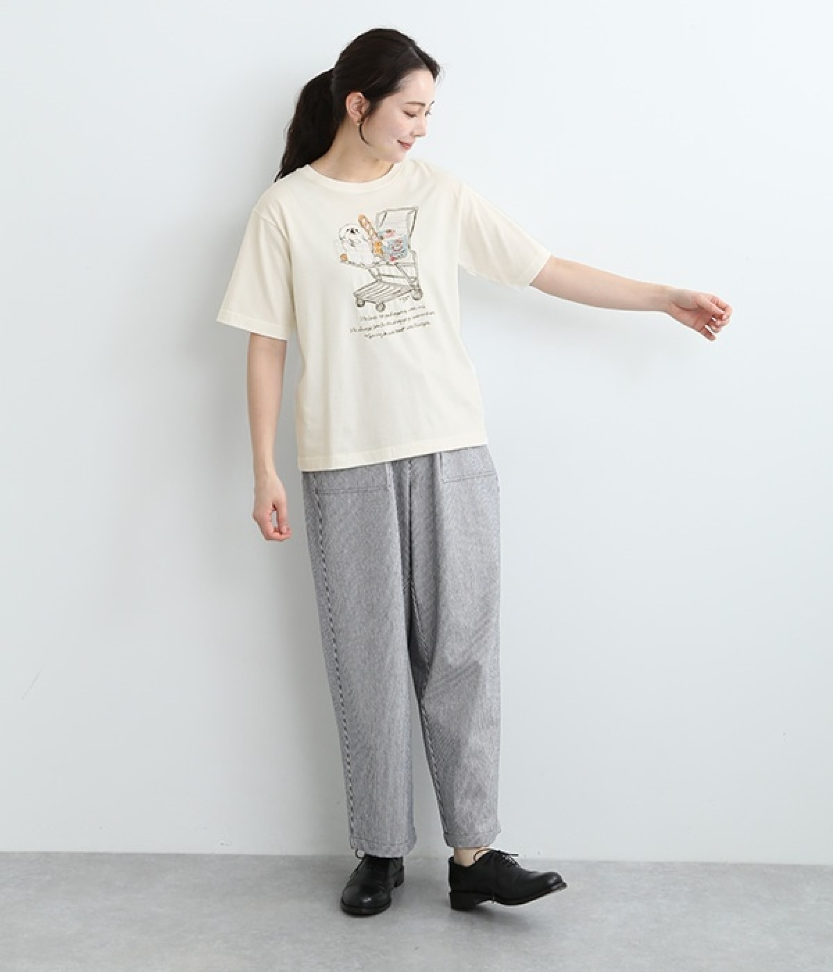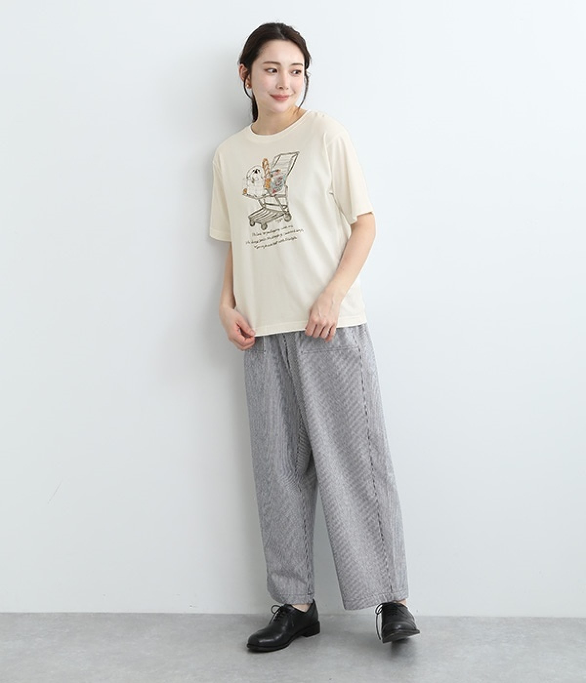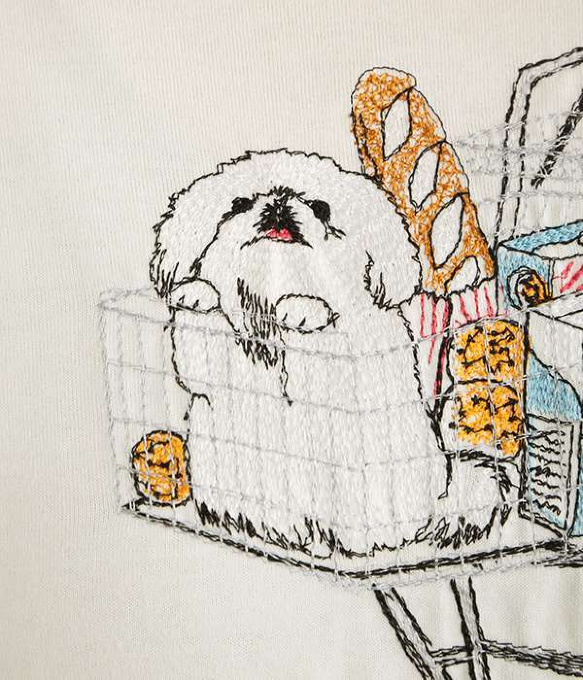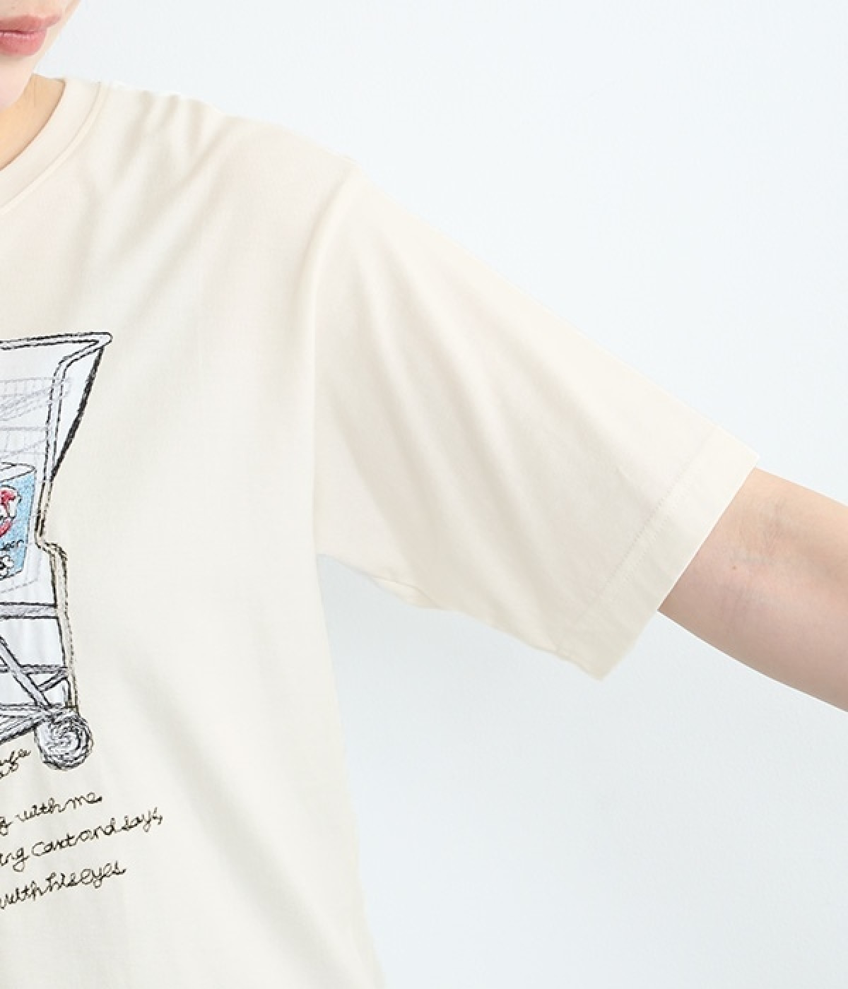 ショッピングカートに乗ったワンちゃんがなんともかわいらしいTシャツ。すべて刺しゅうで描かれている手の込んだ作りになっています。【彼は私と買い物に行くのが大好きです。彼はいつもカートに乗って、目でこう言います。「ぼくのおやつも買って!」】とのメッセージに、思わず笑みがこぼれそう。デイリー使いしやすい、伸縮性のあるコットン素材を使用しています。大人スタイルのポイントとして使いたいアイテムです。