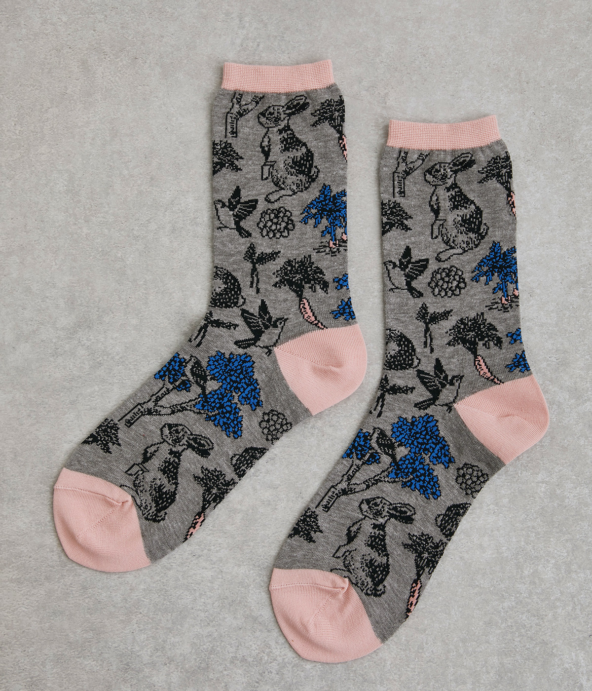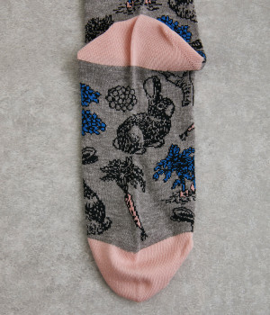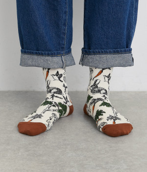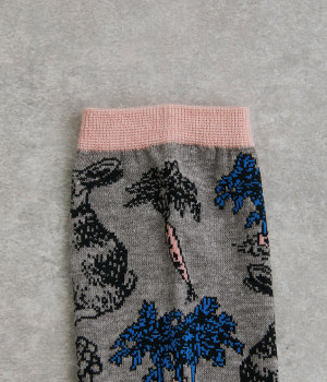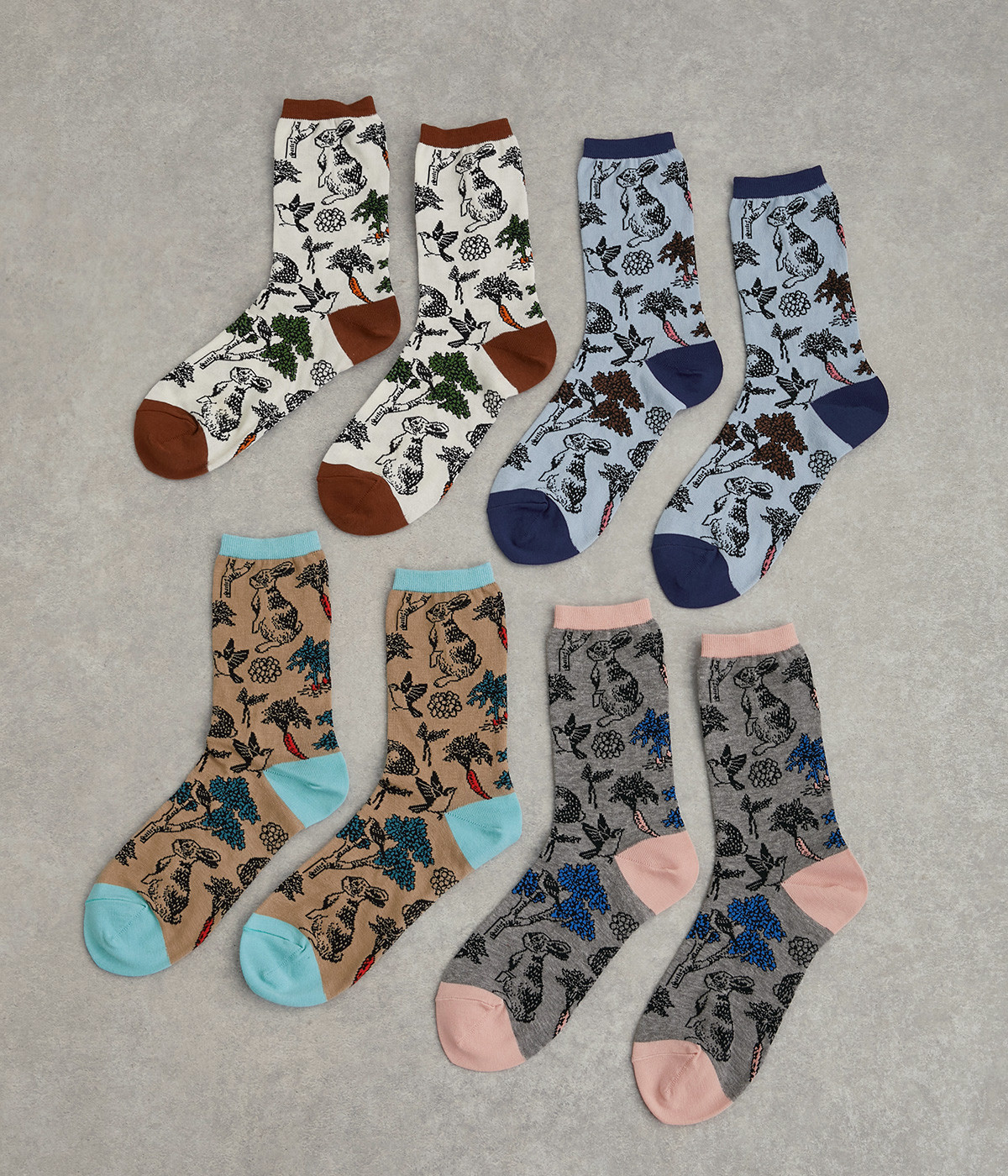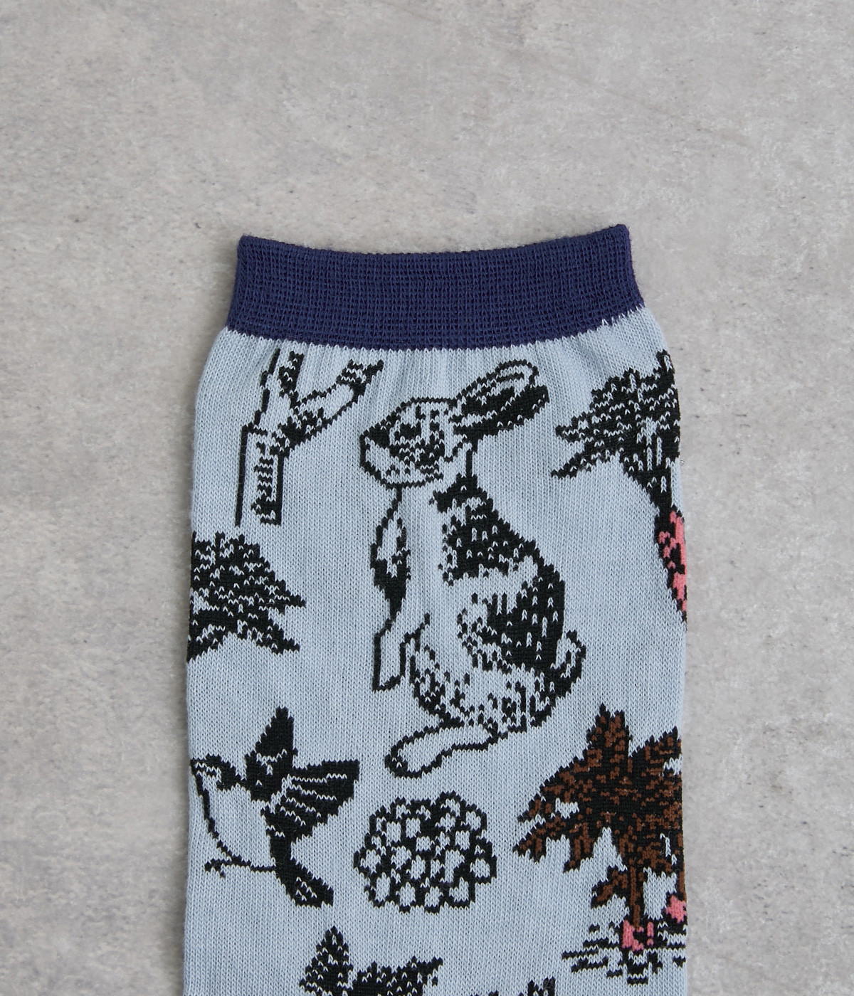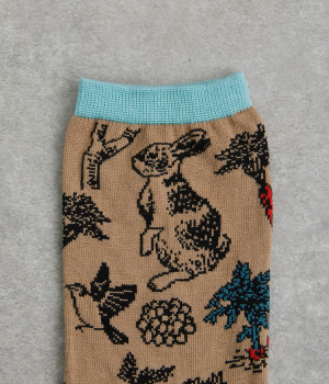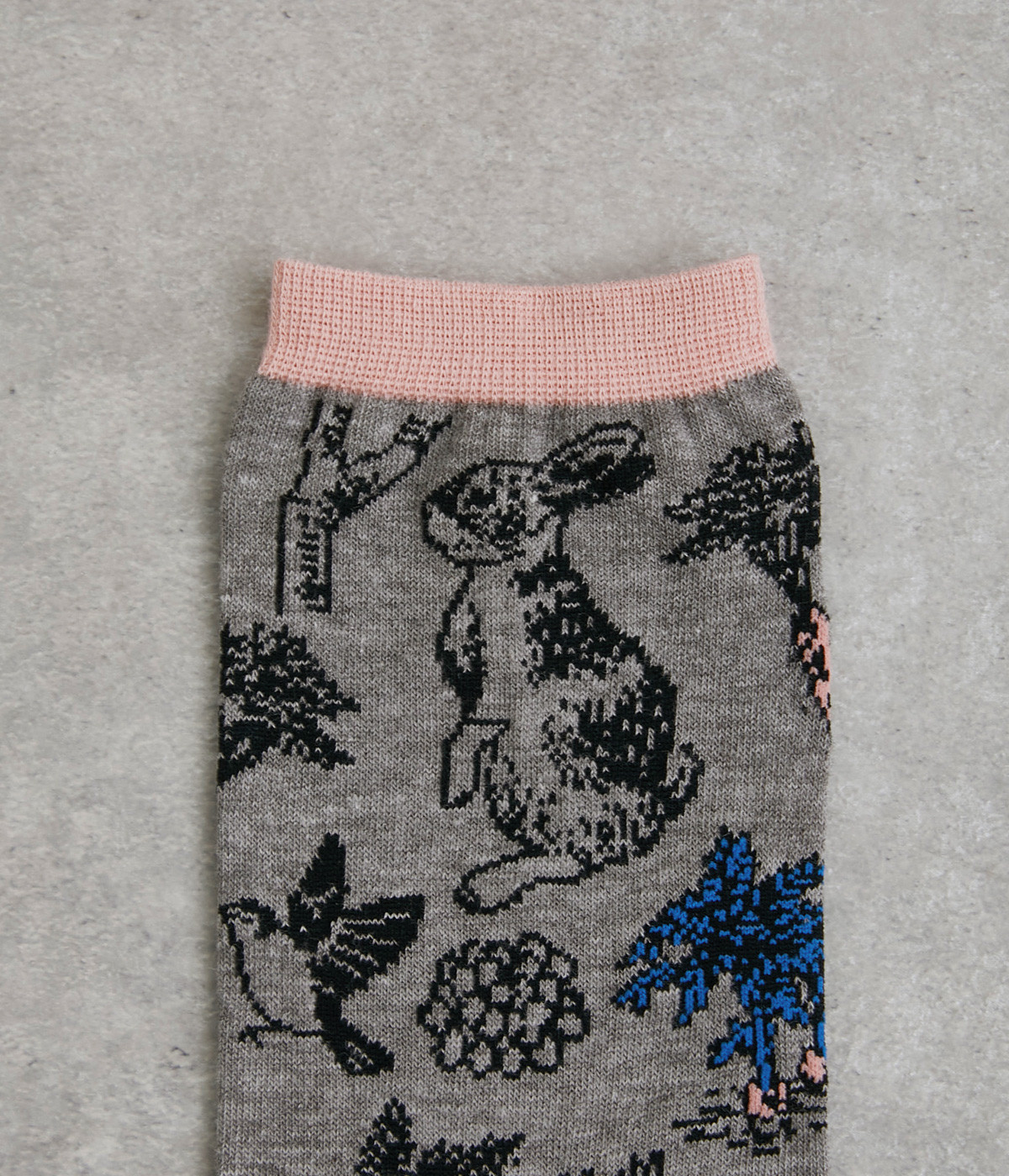 繊細なタッチで描かれたウサギや鳥などのアートな総柄