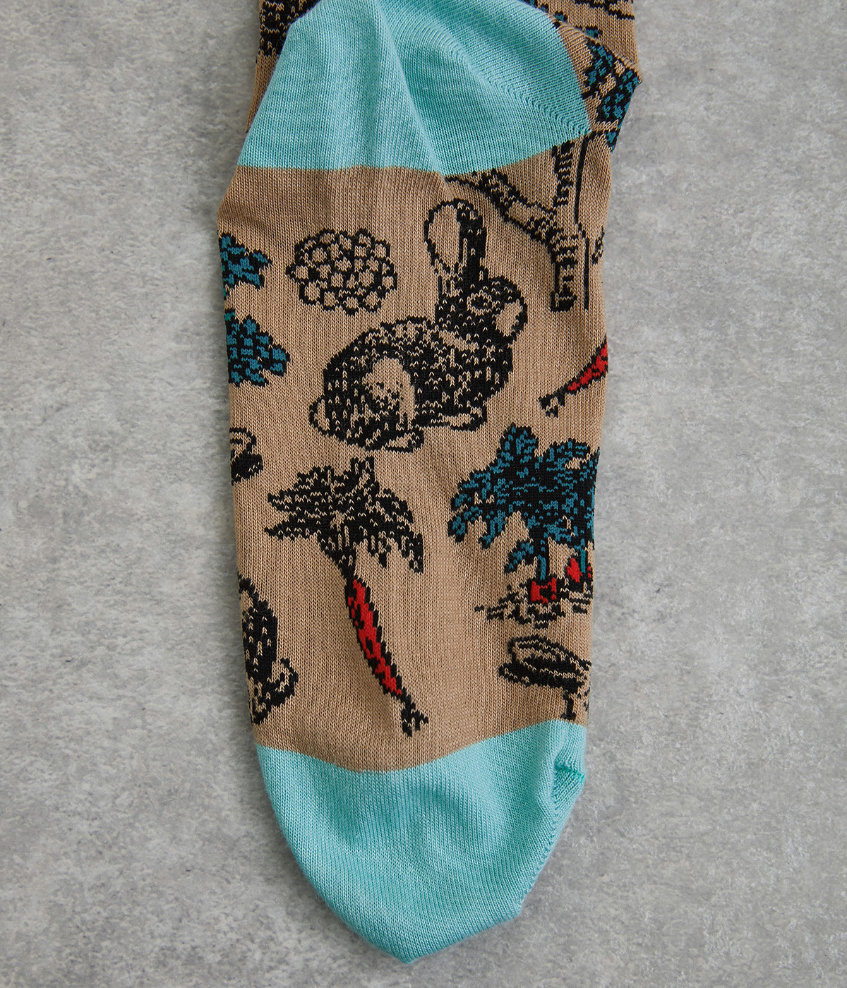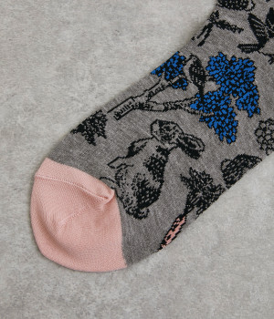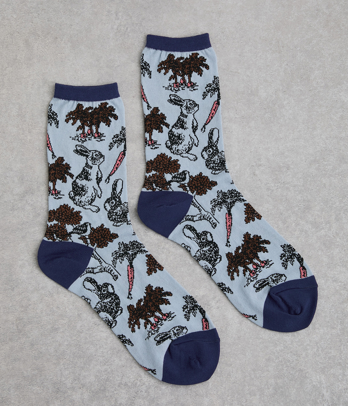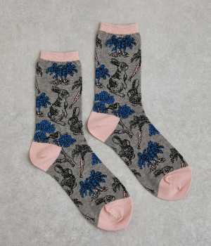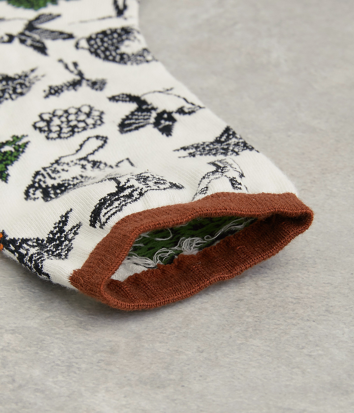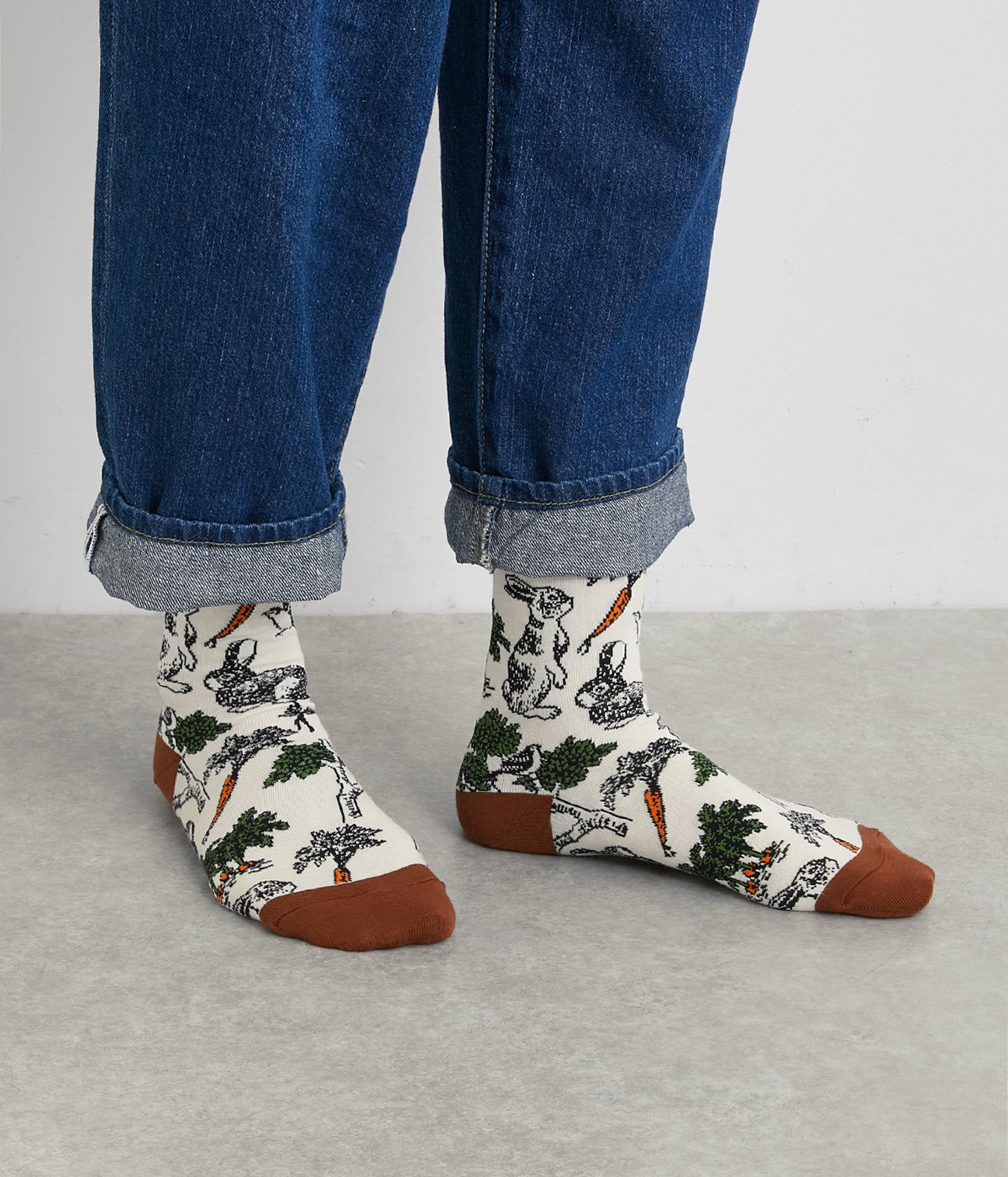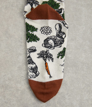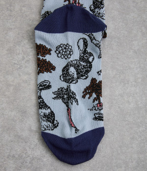 繊細なタッチで描かれたウサギや鳥などのアートな総柄